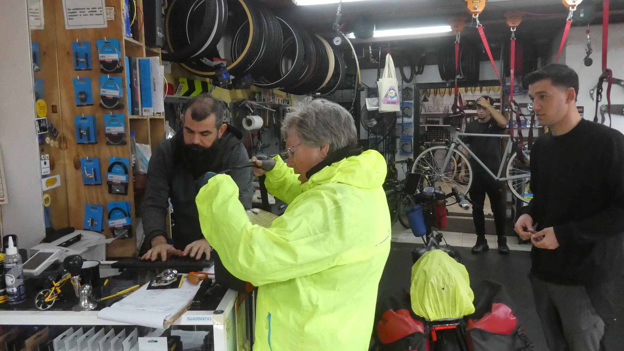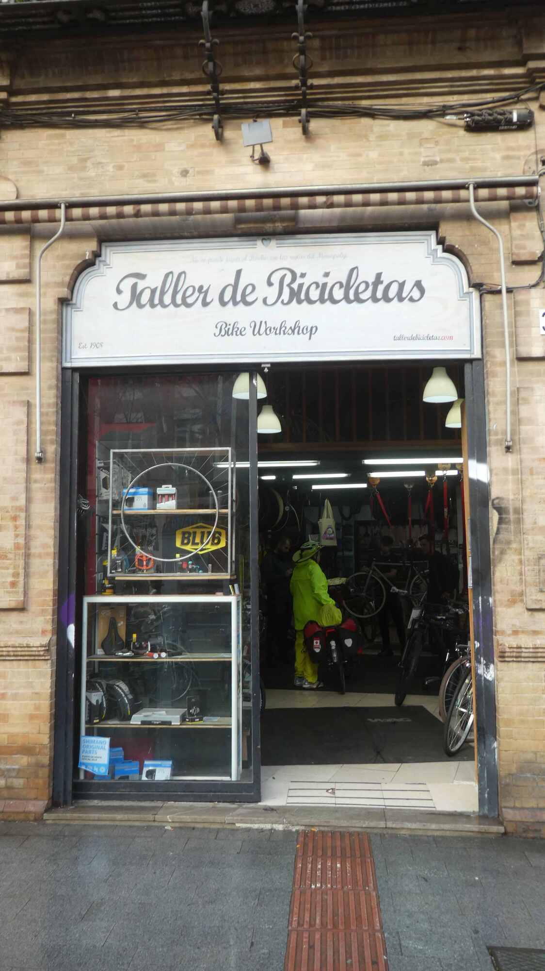 I was thinking about what kind of quip I could put in the blog about the value to me of a haircut or a beer, vs. a brake bleed, and maybe you are following along with me in this reverie, so you too will be jolted by: "WAAA! Dodie, stop, STOP!". We had just walked in front of a "Bicycle Workshop", with an open door and three mechanics standing inside.