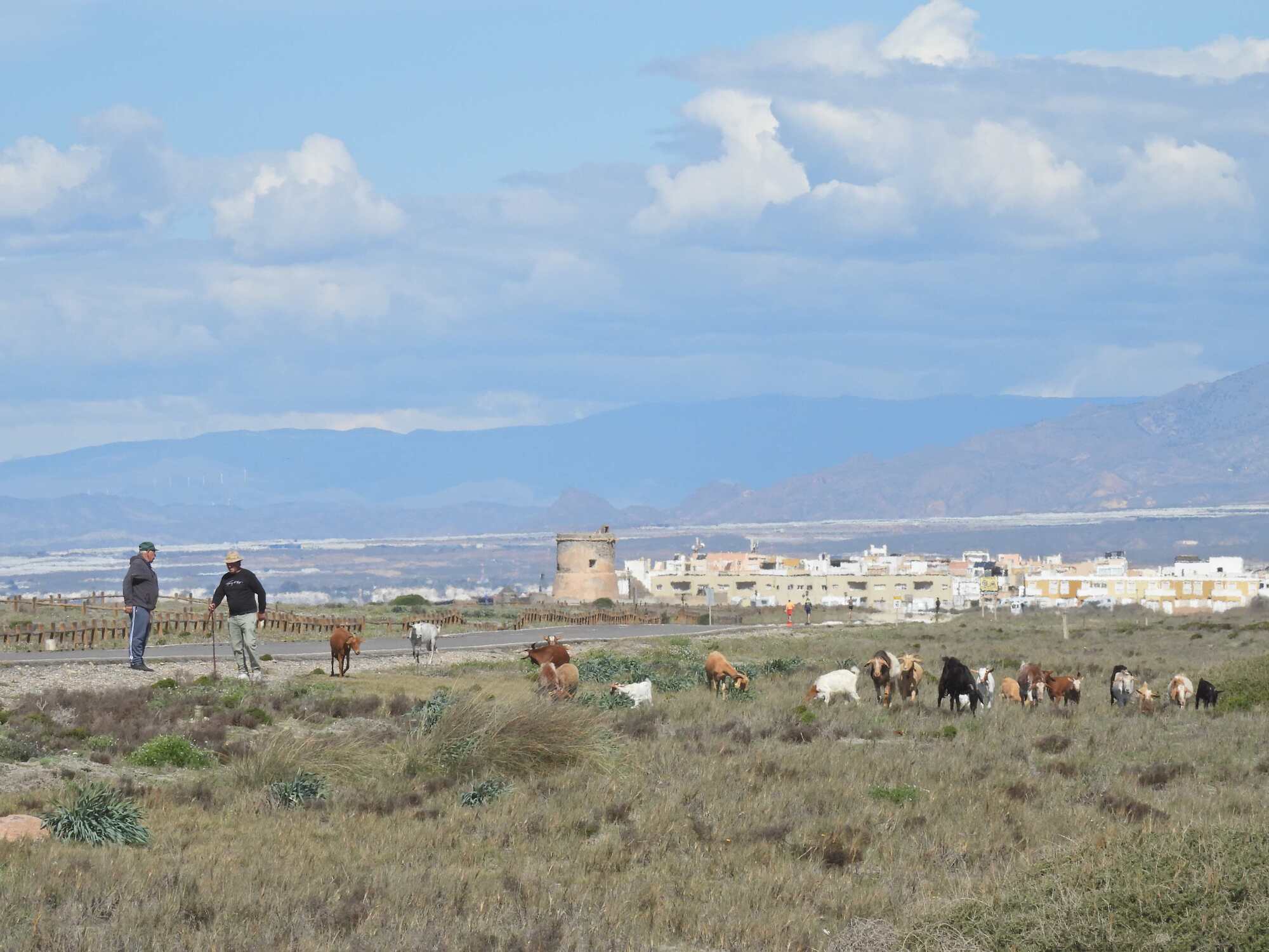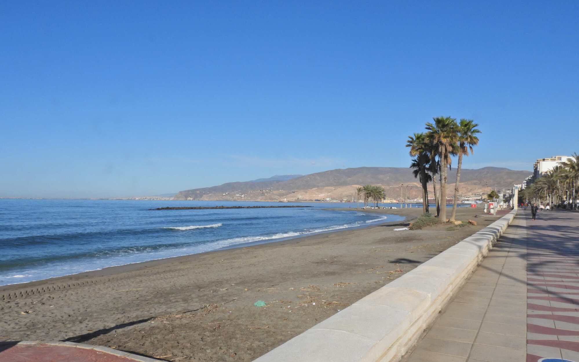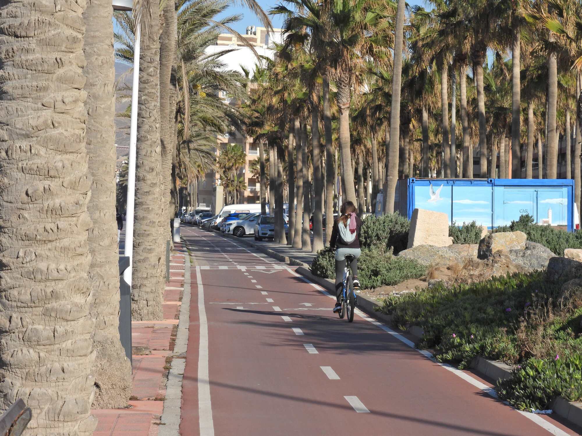 As we could already sense from our stop along the beach at Almeria, we are in a new ecosystem here, with flat beach walks, palm trees, and weather that has turned quite warm. The weather part is so great now that I might dispense with the tights, maybe!