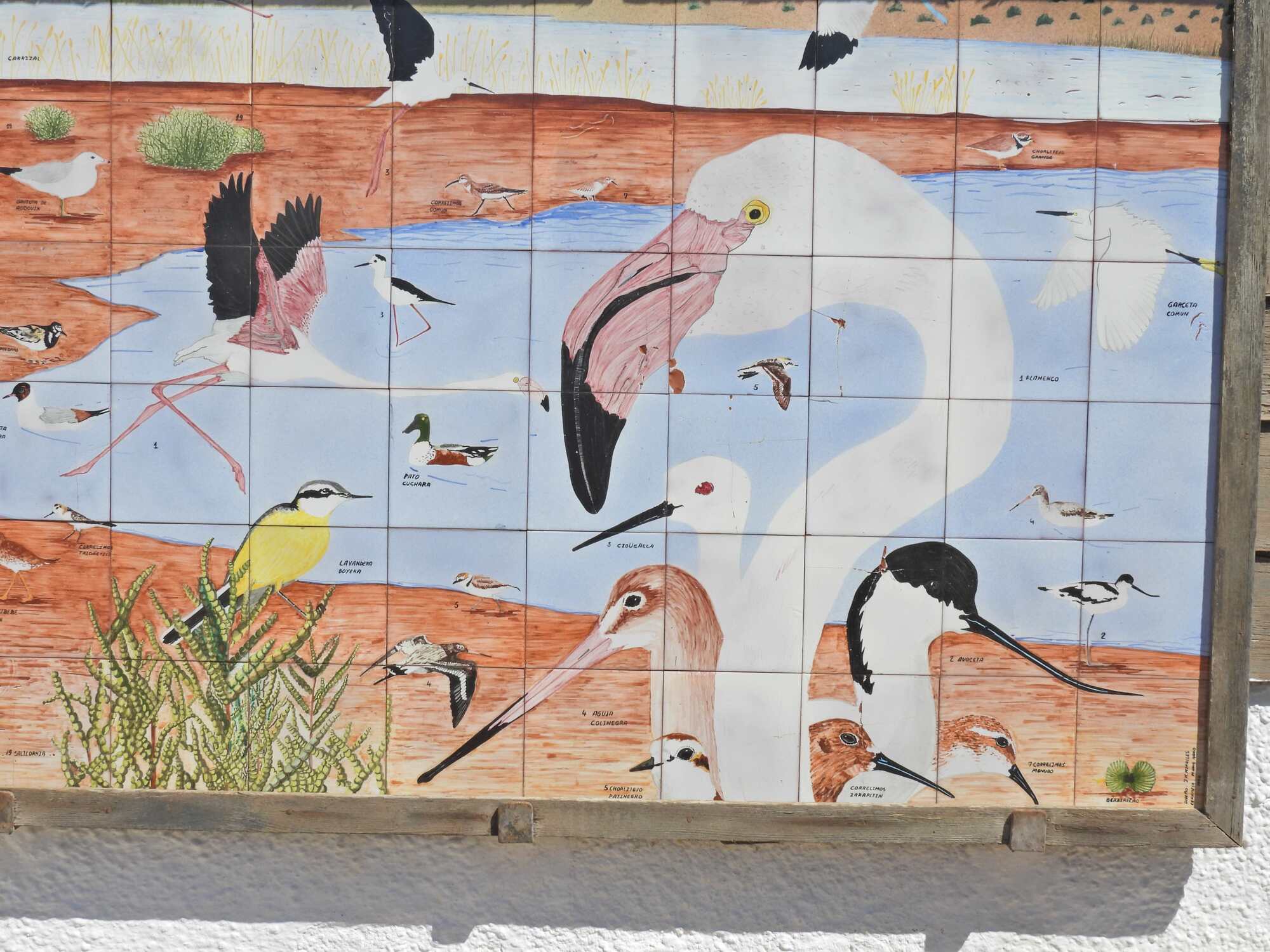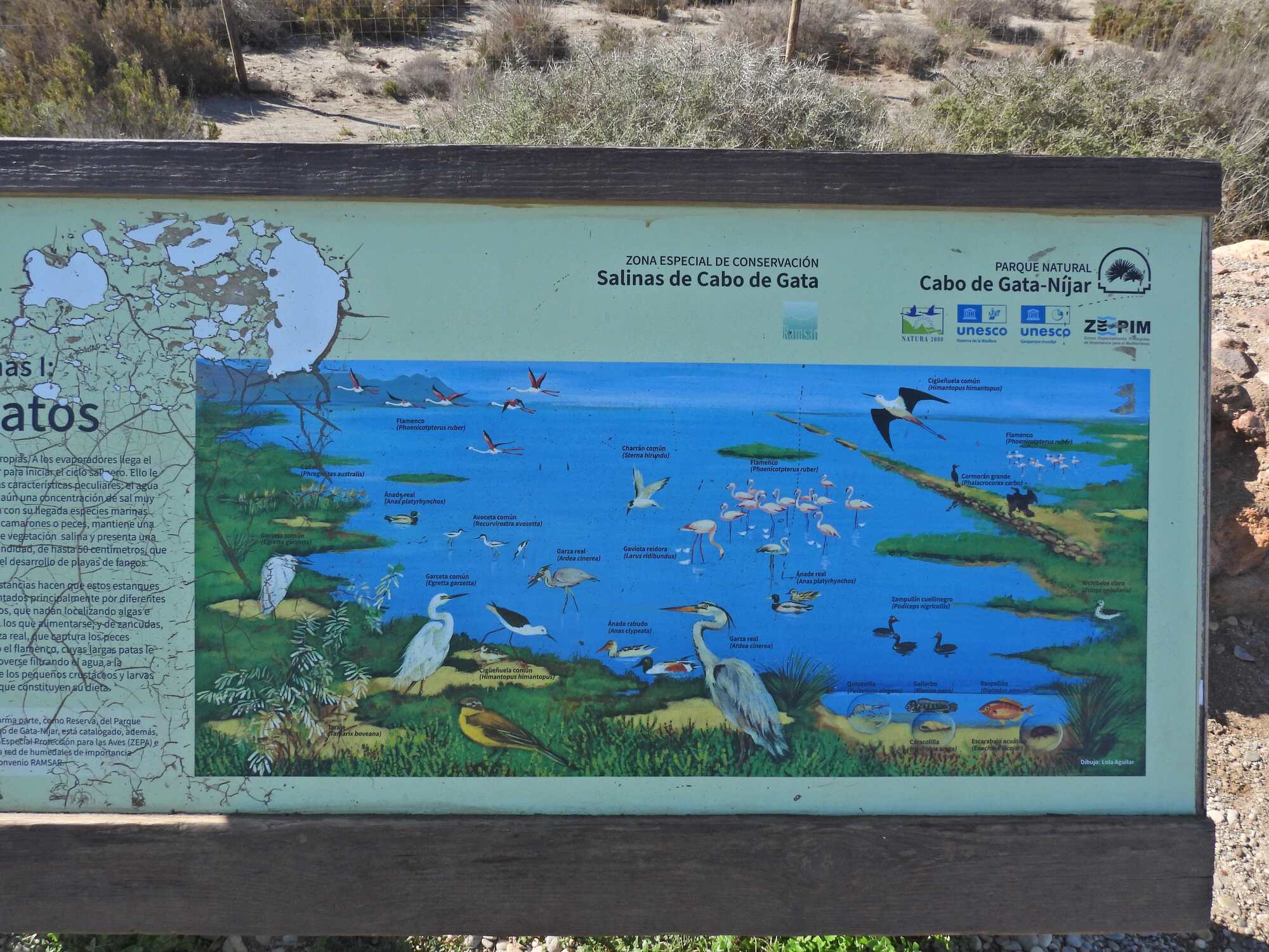 We arrived at the first blind, at the beginning of the lake, where there is the sign below, announcing the Salinas, and teasing us with all the birds and creatures we are supposed to see. While in fact we did see ten species today (here and at San Jose) it was not like the poster depicted, since it never is.