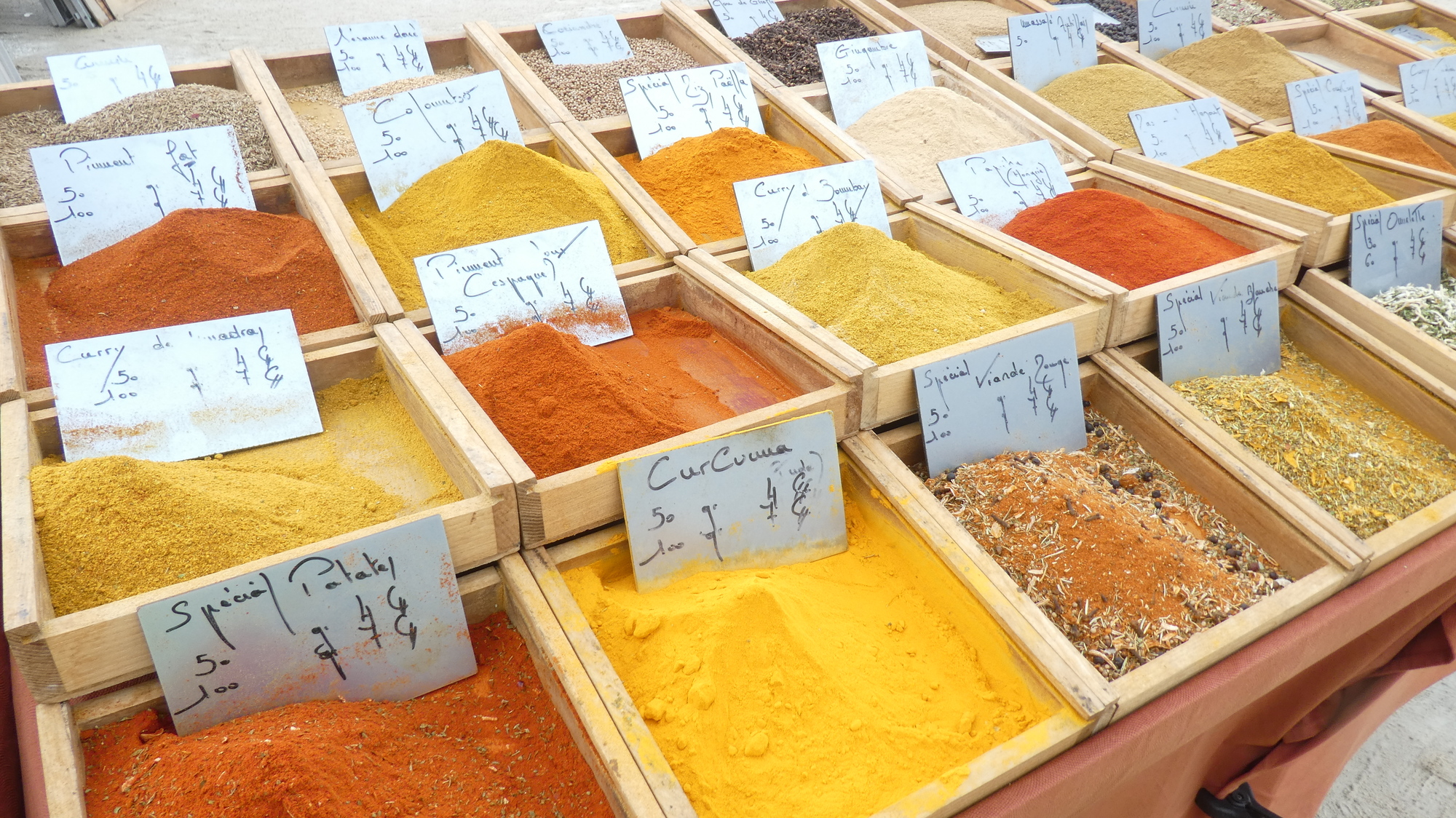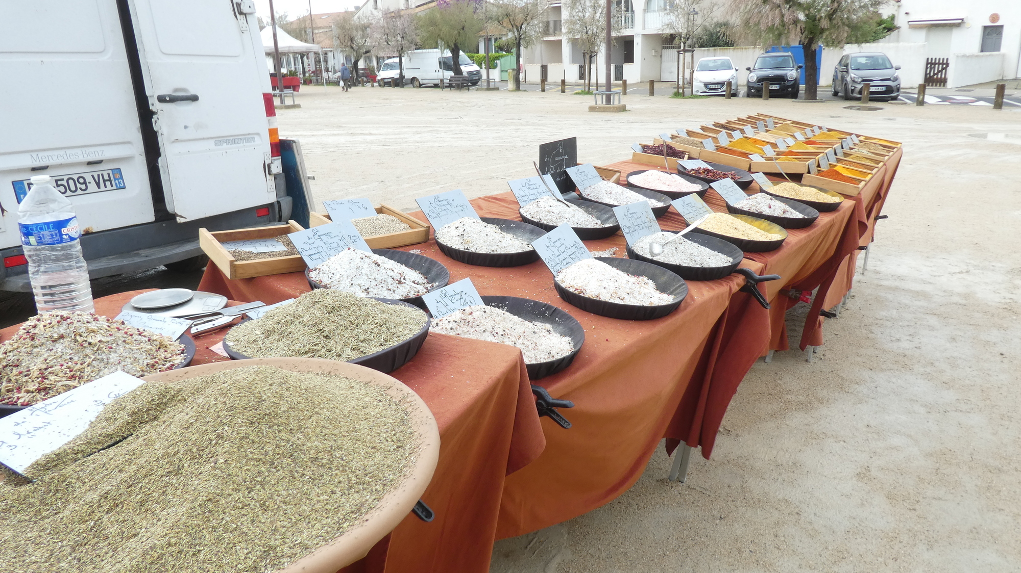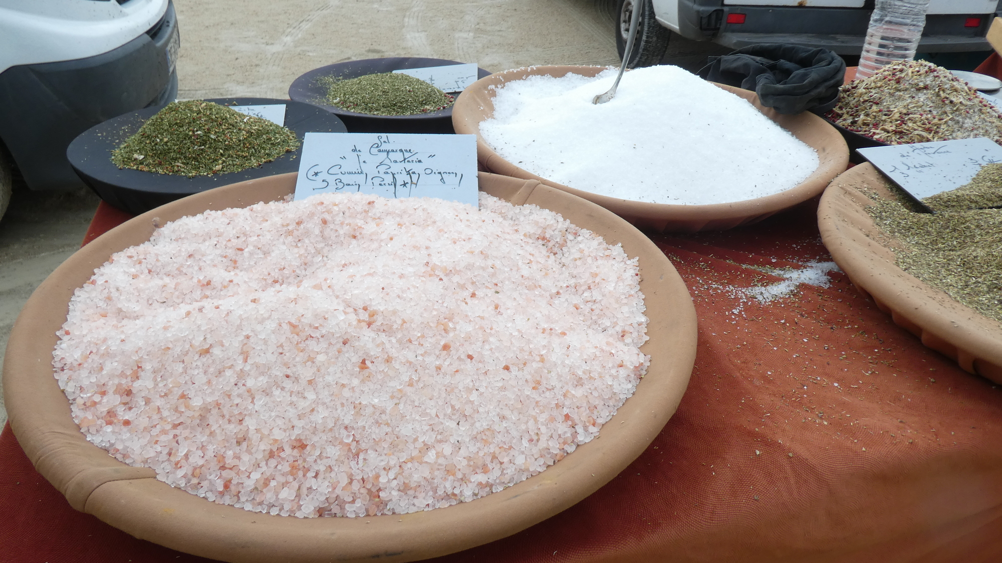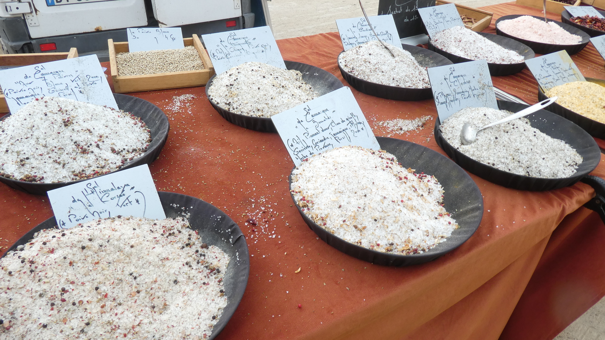 The weather forecast continued to call for rain, but it was not raining just then. Still it made us nervous on behalf of the vendor to see local salt, and spices, out in the open. I asked that vendor if he were not concerned, as we were, but he seemed cool with it. Maybe he had a giant tarp ready to go, in his truck.