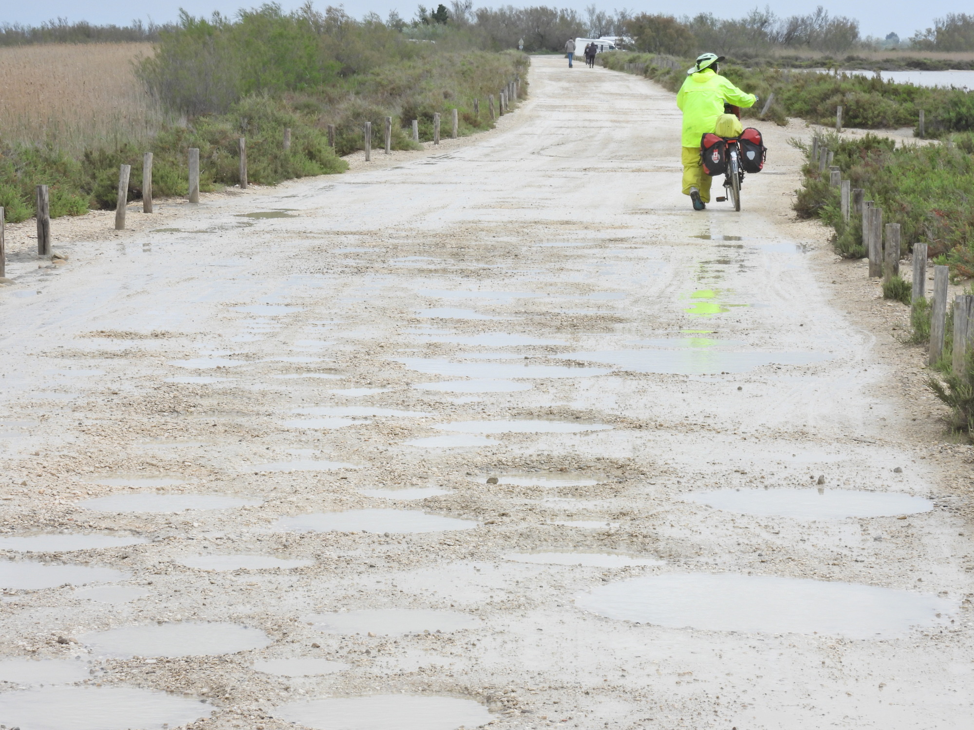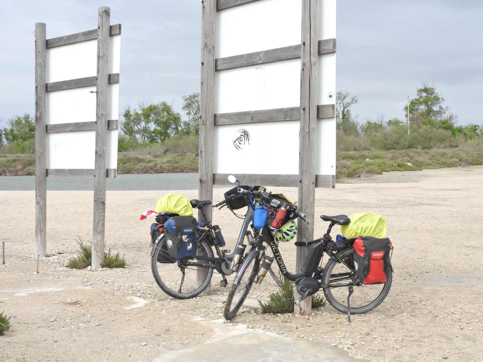 We had been bucking headwind, as well as rain and bad ground conditions, all day. But nearer the mouth of the Rhone the wind was just howling. We wanted to walk to an observation point above the salin, and had to chain down our bikes.