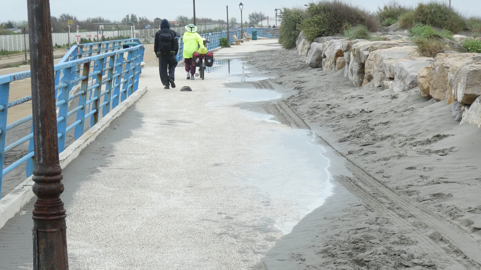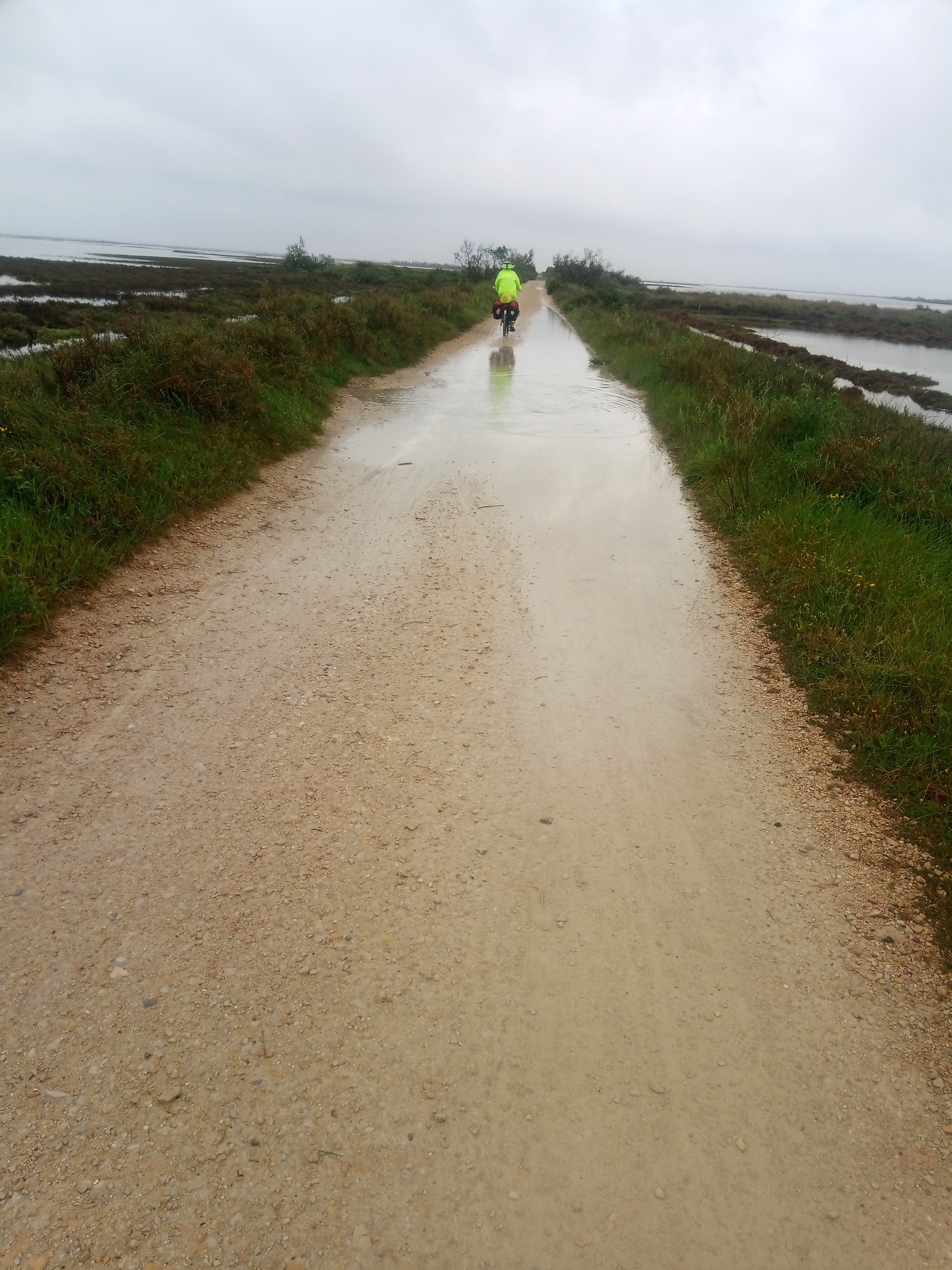 By virtue of being a narrow bit of land between the sea on one side and extensive wetlands on the other, the Digue is not exactly the most secure route. But the morning came with no rain at the moment, and that gave us courage to go for it. So that set the nearby town of Saintes Maries on our route, as opposed to going the opposite direction, where Albaron - about 25 km distant, would have been the first civilisation.