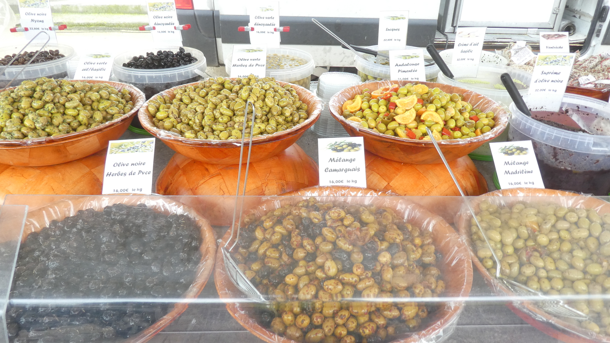 Just down the street from the bakery we encountered a market. It was small, but it had the essentials, such as a Rotisserie. One of the things was a stand with olives. We know that daughter Laurie really likes olives, so we shot this one especially for her.