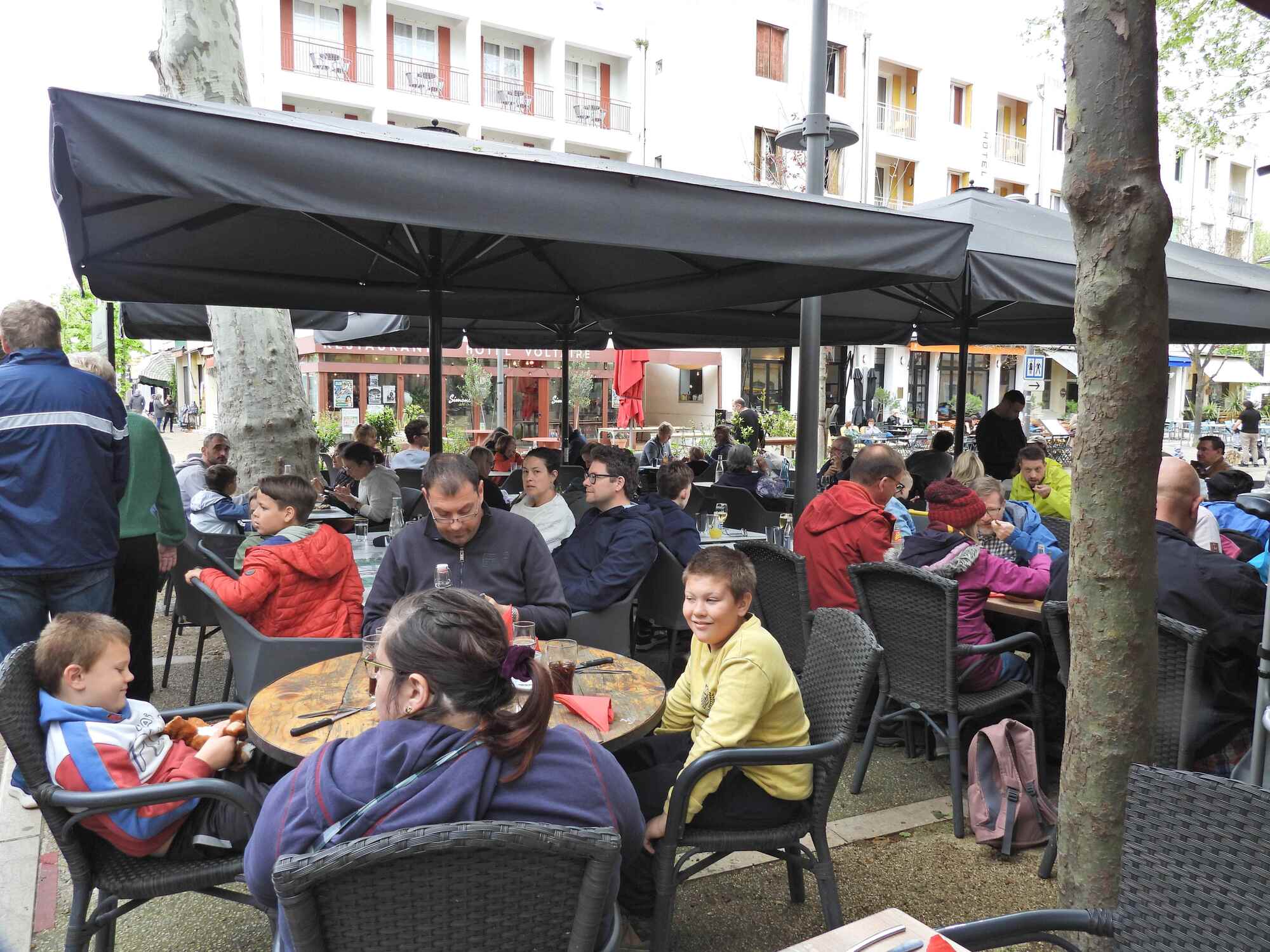 OK, here we are at a cafe, one of zillions in this so typical French town. A daily special costs about 18 euros. Too much for us - we'll stick to bakery sandwiches.