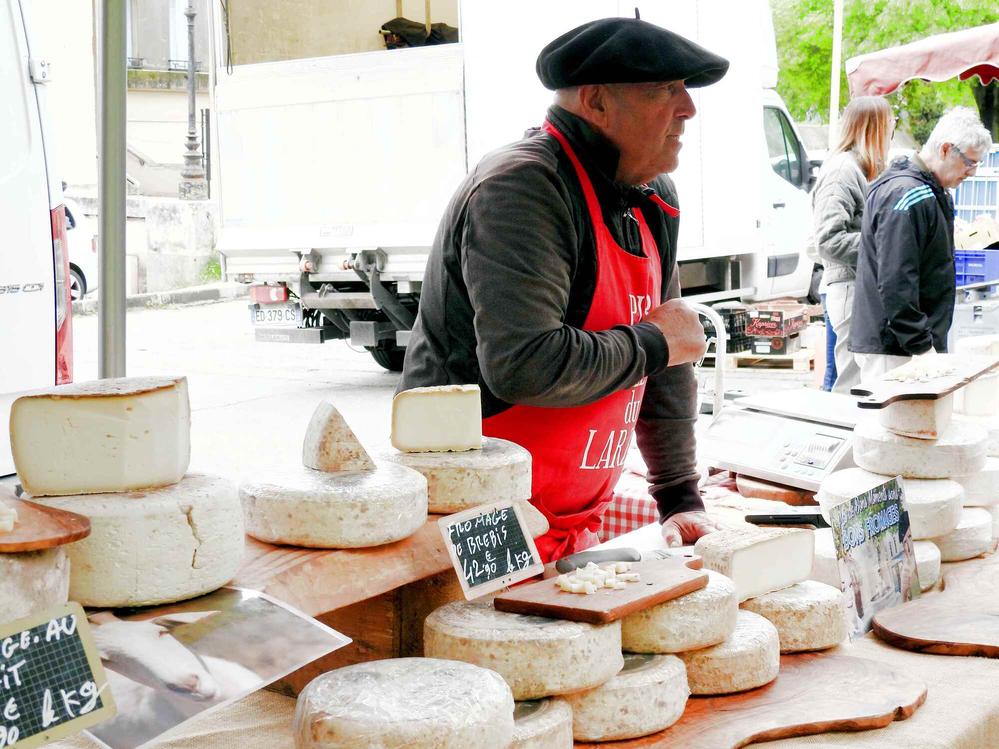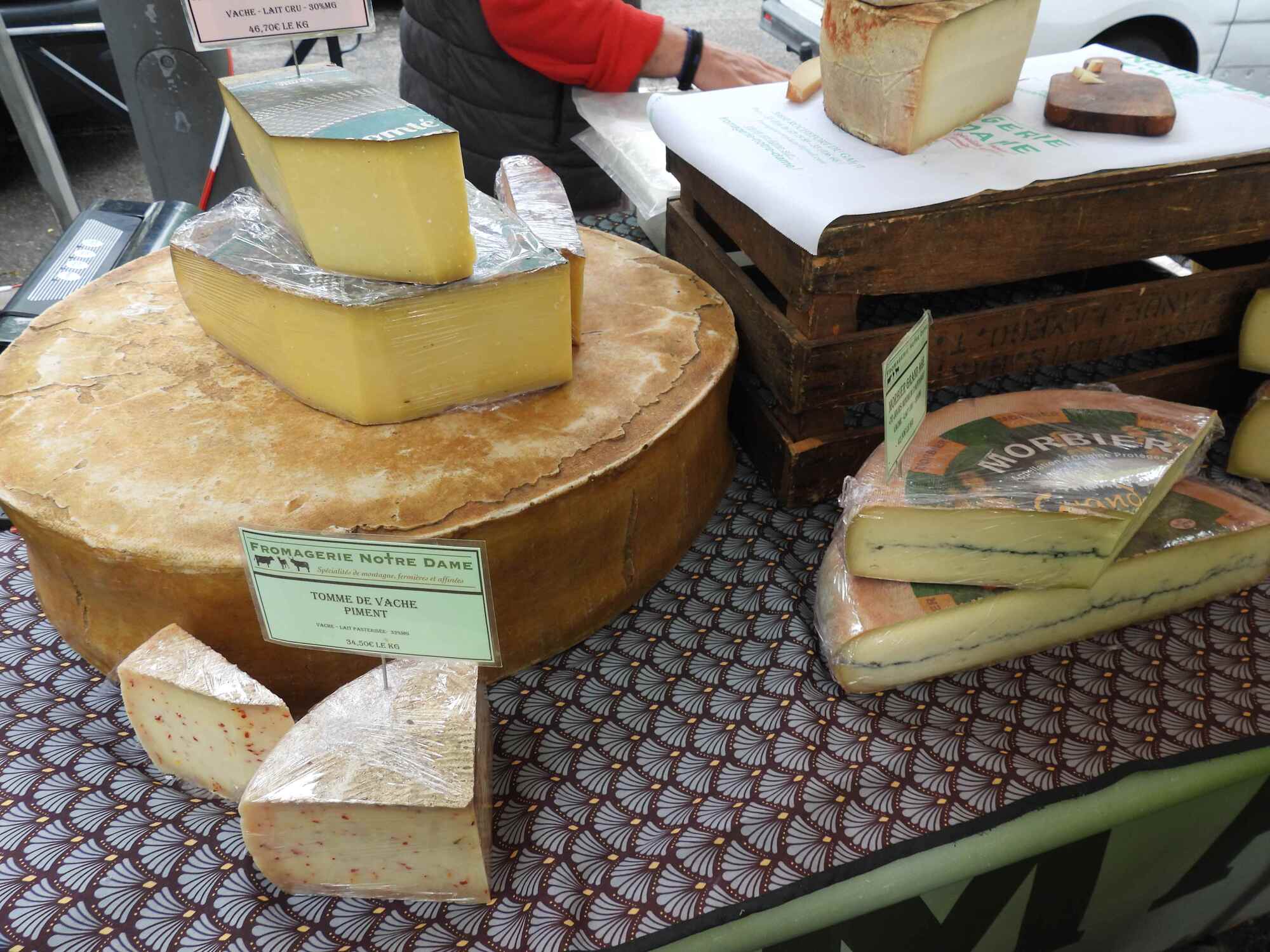Next up, a cheese man. I am always looking to find my favourite cheese, which I know as a Tomme with black peppers spotted throughout. This cheese man told me two things. First "tomme" is not a type of cheese, but merely a size of cheese wheel. Later research has me confused on this, because a tomme cheese is said to be mild, with a natural rind, and a flavour depending on where it comes from. Next the man insisted that not bl;ack but red peppers are the standard for such cheeses, that have any pepper in them. Ok, fine, we bought a slice of a tomme, with red pepper. I still like and will look for my black peppercorn version.