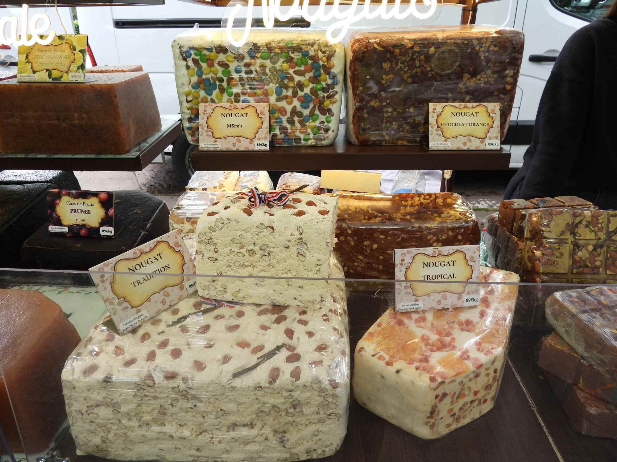 Next up, nougat! In Spain, the company Vicens makes incredible nougat and similar sweets, in many variants. But in France our standard comes from Montelimar. I asked the lady the difference between her stuff and Montelimar. Here answer was that the Montelimar people use sugar, and she uses honey.
