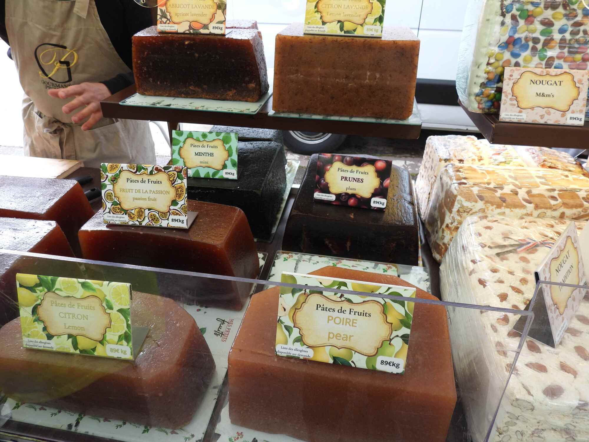 Dodie probably missed the fact that this stuff costs 89 euros per kg! The man was charming, and by the time he was done Dodie had a 30 euro slab of lemon-ginger. I was now done with the nougat explanation and moved across, to express concern that lemon-ginger could be too tangy for me. With that the man prepared a gift of mango for me, for being Canadian!