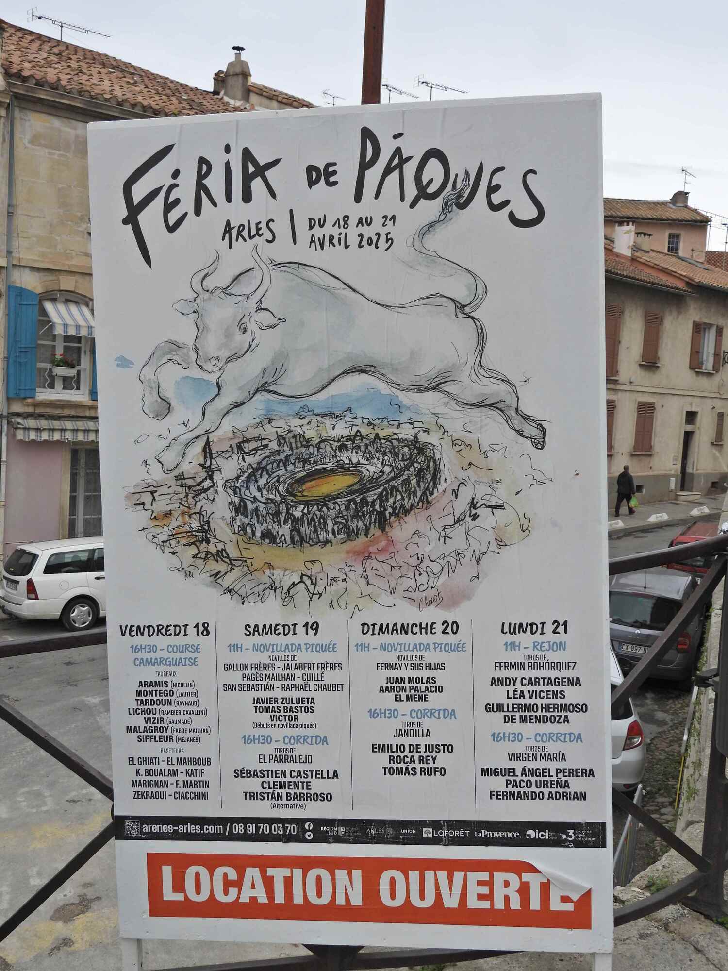 Down in the street a small brass band passed by, followed by a troupe of school kids. This seemed a small echo of Semana Sancta, and in a way it was. In Arles at Easter they celebrate Feria de Paques. Flamenco is part of this, and also bullfighting at the area. Since bullfighting now entails just getting a ribbon from the bull's horns, it would be fun to go see. But we are going to miss it by one day.