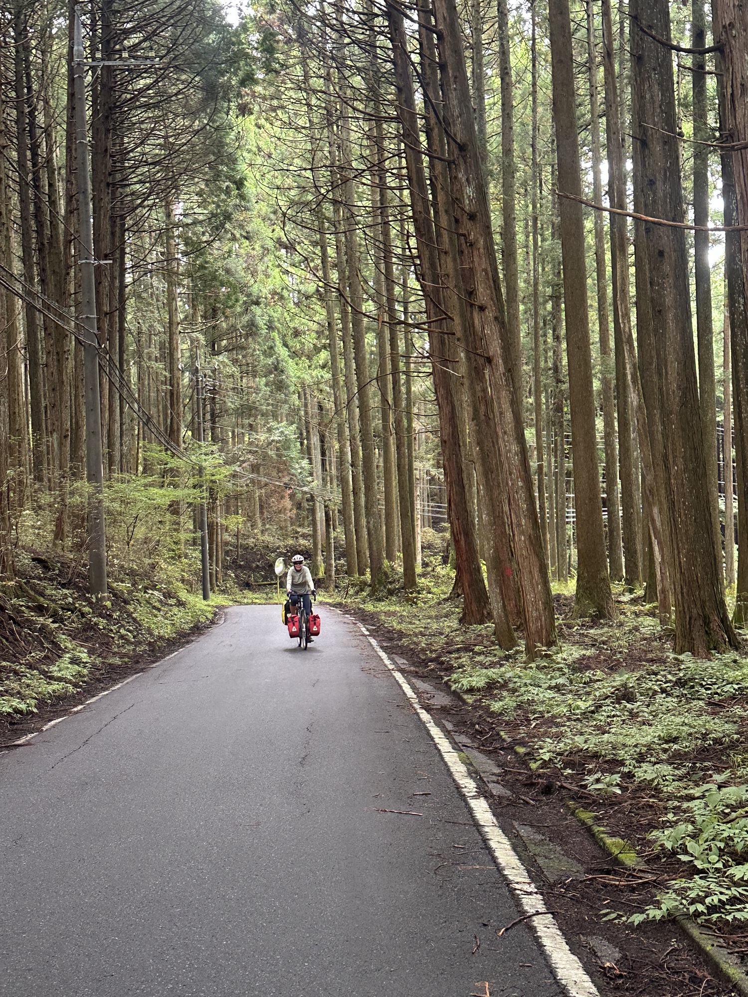 There was a stiff climb to get out of town, but very soon we were swooping down switchbacks on a one-lane mountain road — so beautiful and exhilarating! Luckily there was virtually no traffic. Over the first 10 - 15 kilometers we saw fewer than a dozen cars. We did however see other bikers — something that’s become a bit of a rare sighting since leaving Hokkaido. Not fellow bike tourers, these were pelotons of road racers flashing by. And a bit further on we started to see posters advertising an upcoming race, which unfortunately we will have to miss — otherwise we could have entered (Especially if they had a category for 55+ on touring bikes)!
