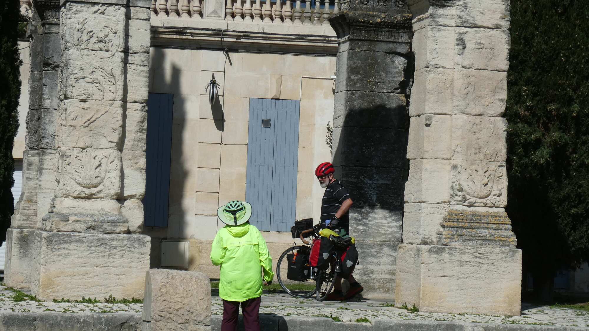 But this time there was a guy, a touring cyclist actually, standing inside the arch, playing with his cell phone. My brother had commented, about the girl standing motionless in my shot, chewing on a baguette, at the Arena in Arles - that the correct strategy is to move such people along. Dodie agreed, but I am sooo patient and polite. This time Dodie went over and (presumably politely) asked the cyclist to beat it.
