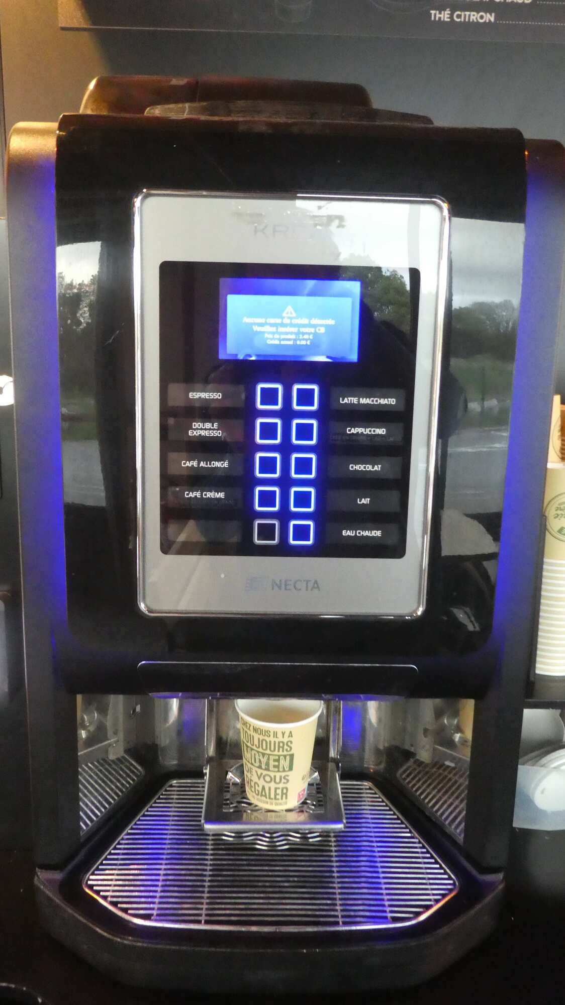 One thing that was a little weird - they had a coffee machine out in the public area. This had an advertised espresso/Americano price of one euro, so I gave it a try. The first glitch was that it accepted only Carte Bleu ("CB"). "Carte Bleu" is the term universally used in France for credit/debit card. Not that any of the cards are likely to be "blue", but maybe one was, at some time.