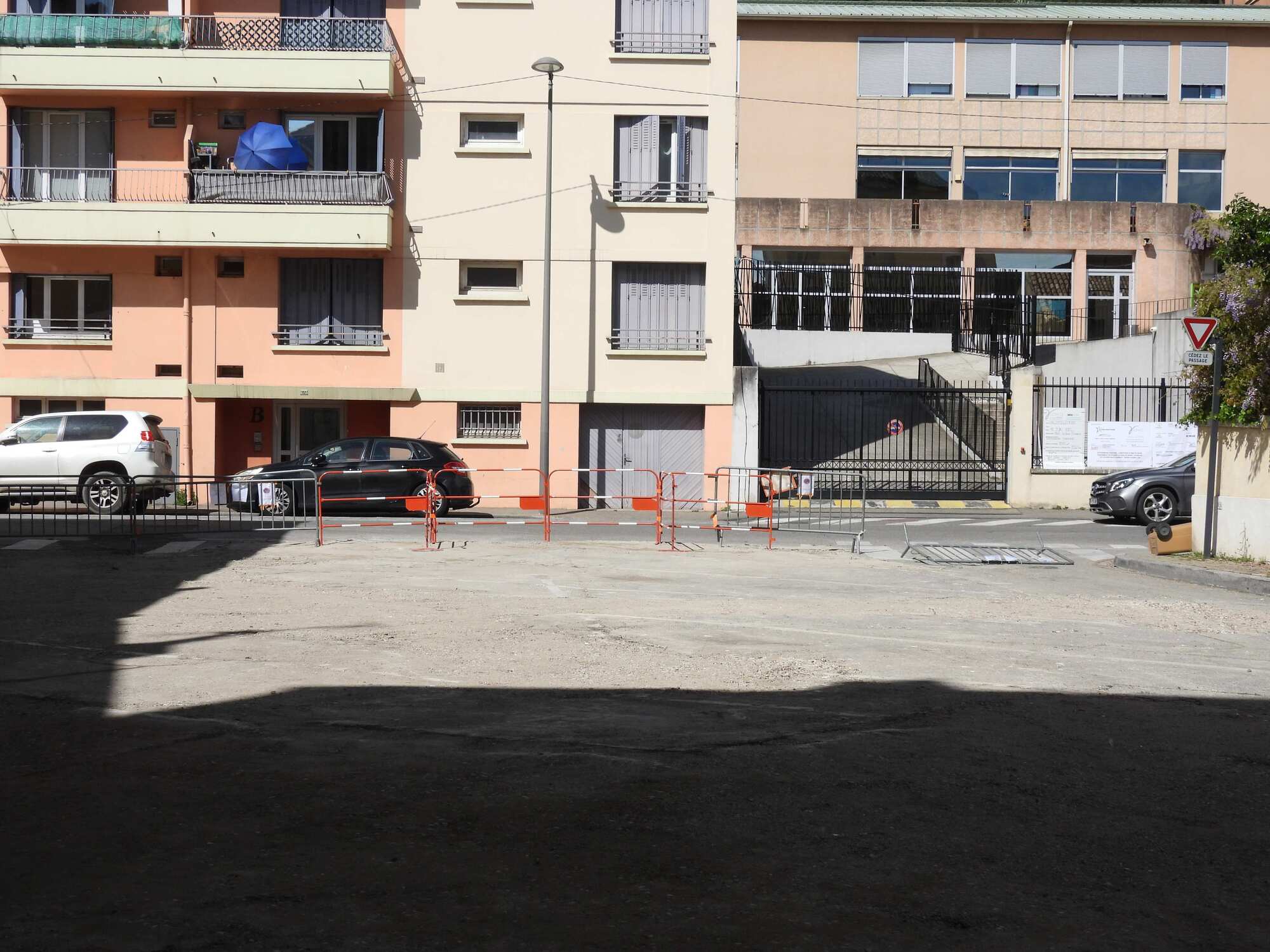 In fact, there was a parking lot in front of the main entrance, and that lot was under construction and blocked off with portable barriers. We shifted one of these in order to get in, and I noted that the letter of authorization for blocking the way, pinned to the barrier, was out of date. Dodie commented that the work was not completed, so they needed to still block the lot.
