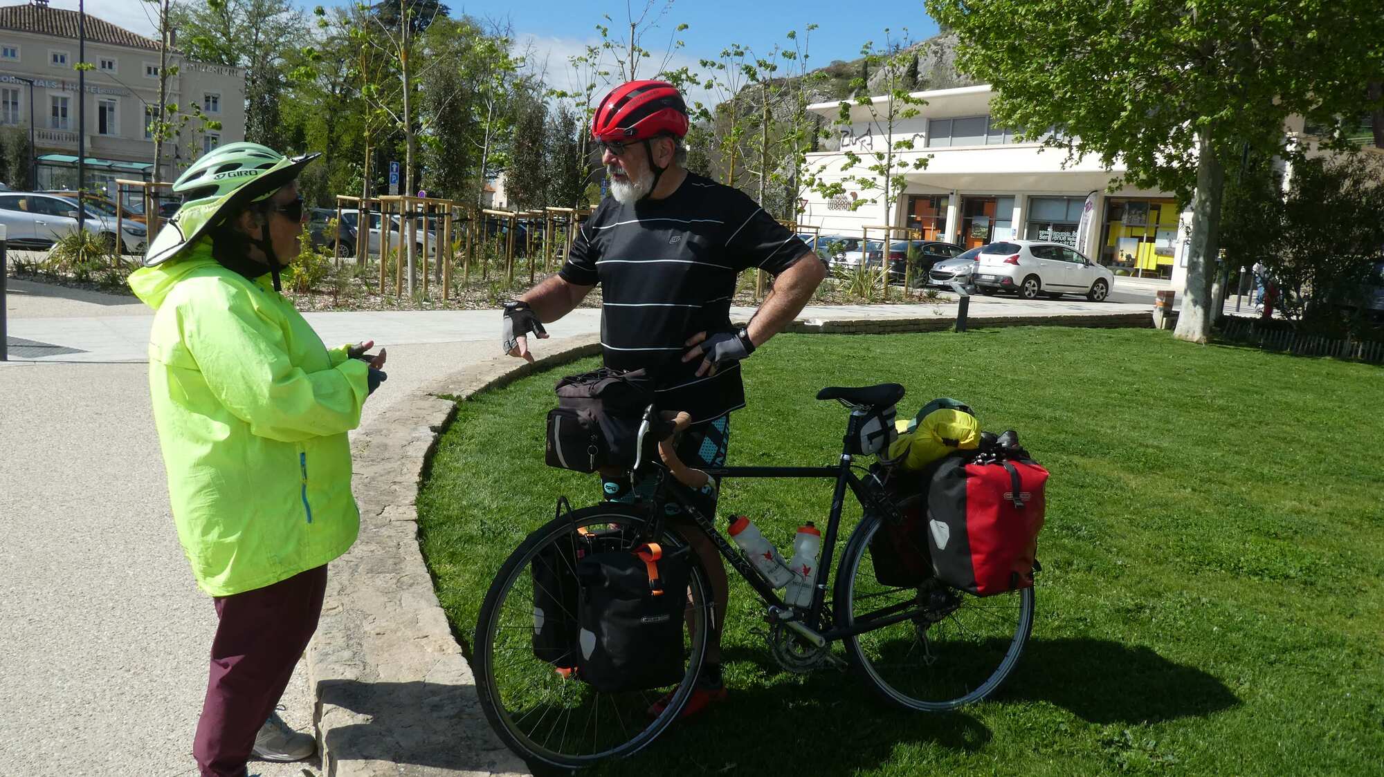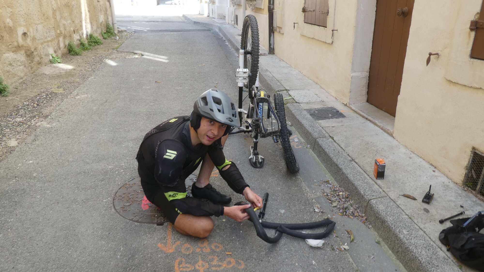In the street beside the cathedral we came across two young men, Lenny and Leo, who were puzzling over a flat in Leo's mountain bike. Lacking patching supplies, one had ridden to Decathlon for a tube, but he had come back with a Schrader version, which of course would not fit the Presta rim.