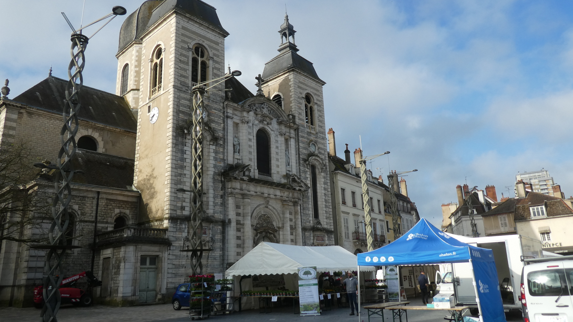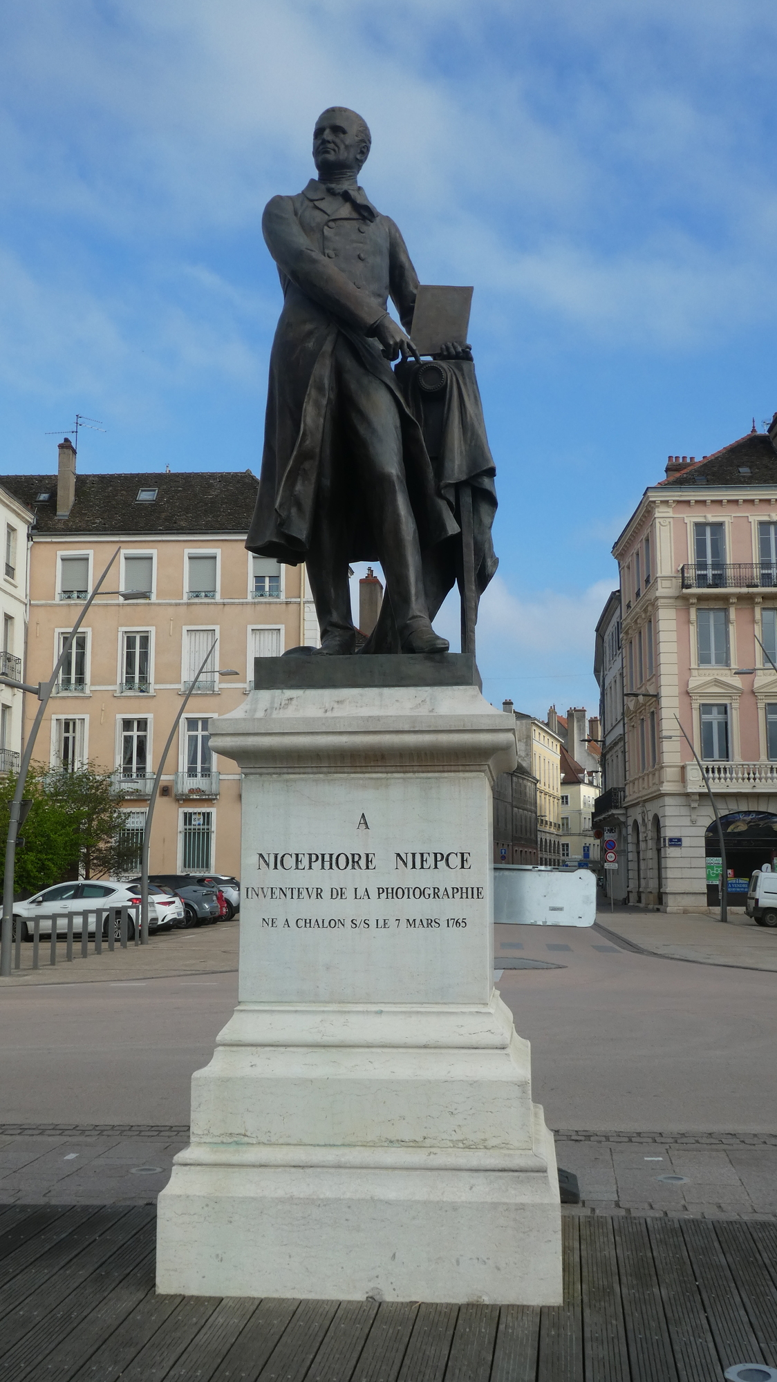 The two main attractions in town are the St Laurent cathedral, and the Nicephore Niepce museum. Niepce (1765-1833) in 1824 was the first to obtain a more more or less permanent photographic image. Below is his statue, by the water. The museum, of course, was closed.