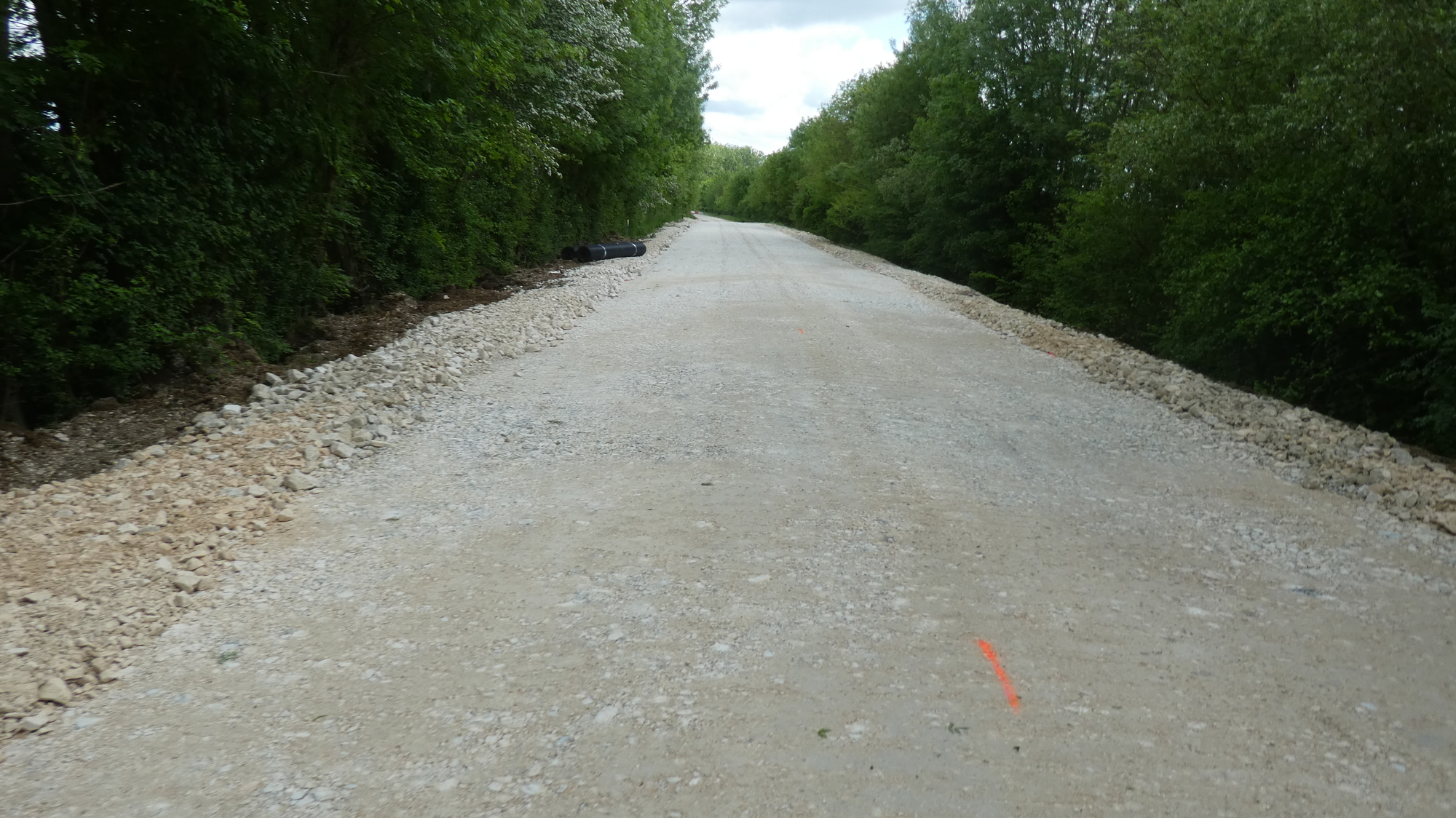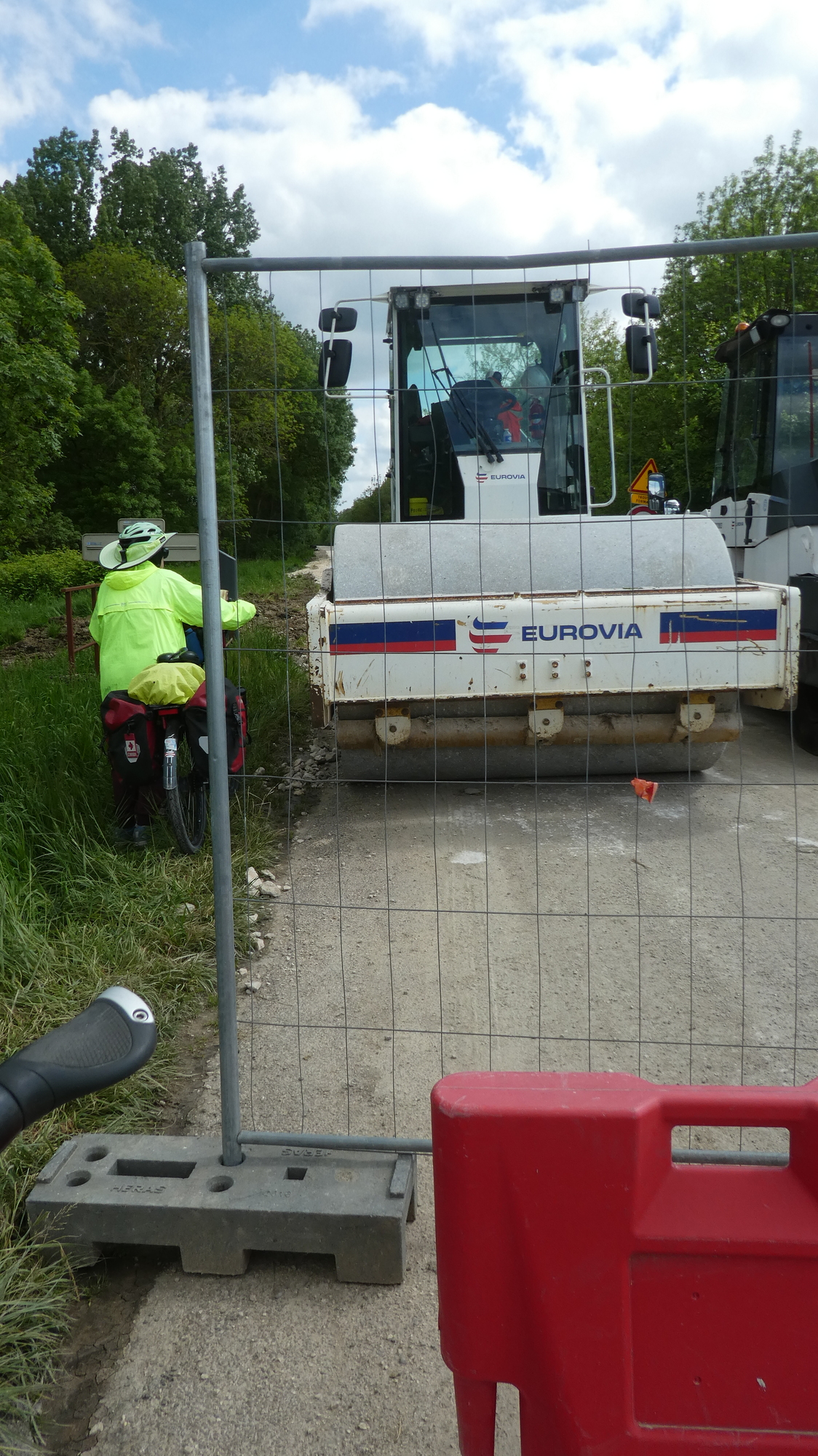 Next we came to a more serious style of barrier. There was a warning of the closed road some distance (3 km?) before the obstruction that is meant to keep you from proceeding. Should one respect that early warning? The answer is a resounding no, since the only way around would be at the cost of 15 km. Next the actual barrier, in this case some gates and two steam rollers. We bypassed that without too much trauma.
