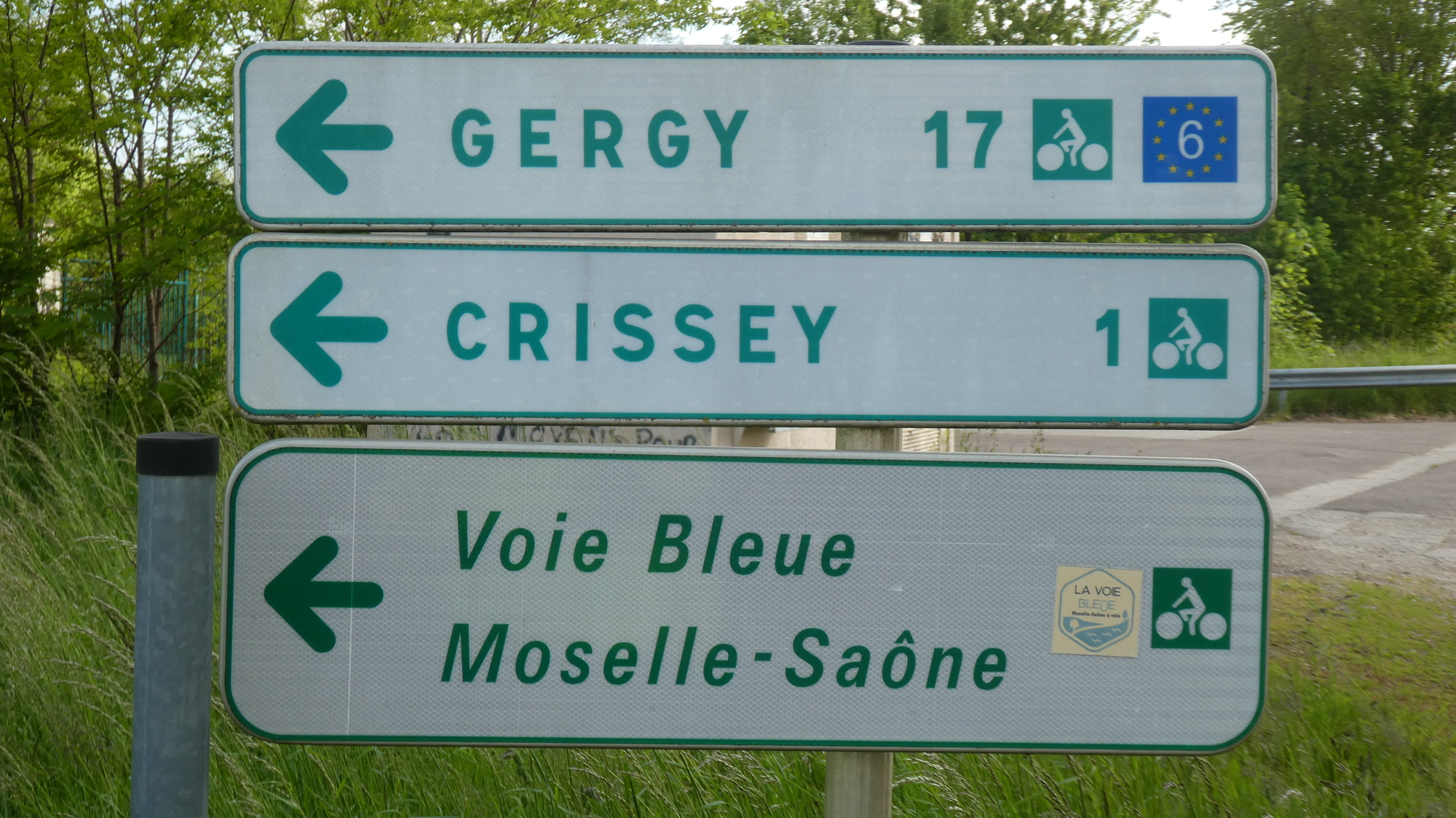 As we rode beside the river, and seeing that we were apparently still on the Voie Bleu, I mused about whether rivers really were "blue". This really came up on the Blue Danube, where we have never seen any blue. Now with the Saone, I decided it was silver-black, though it's hard to look at it and decide what kind of colour you are really looking at.