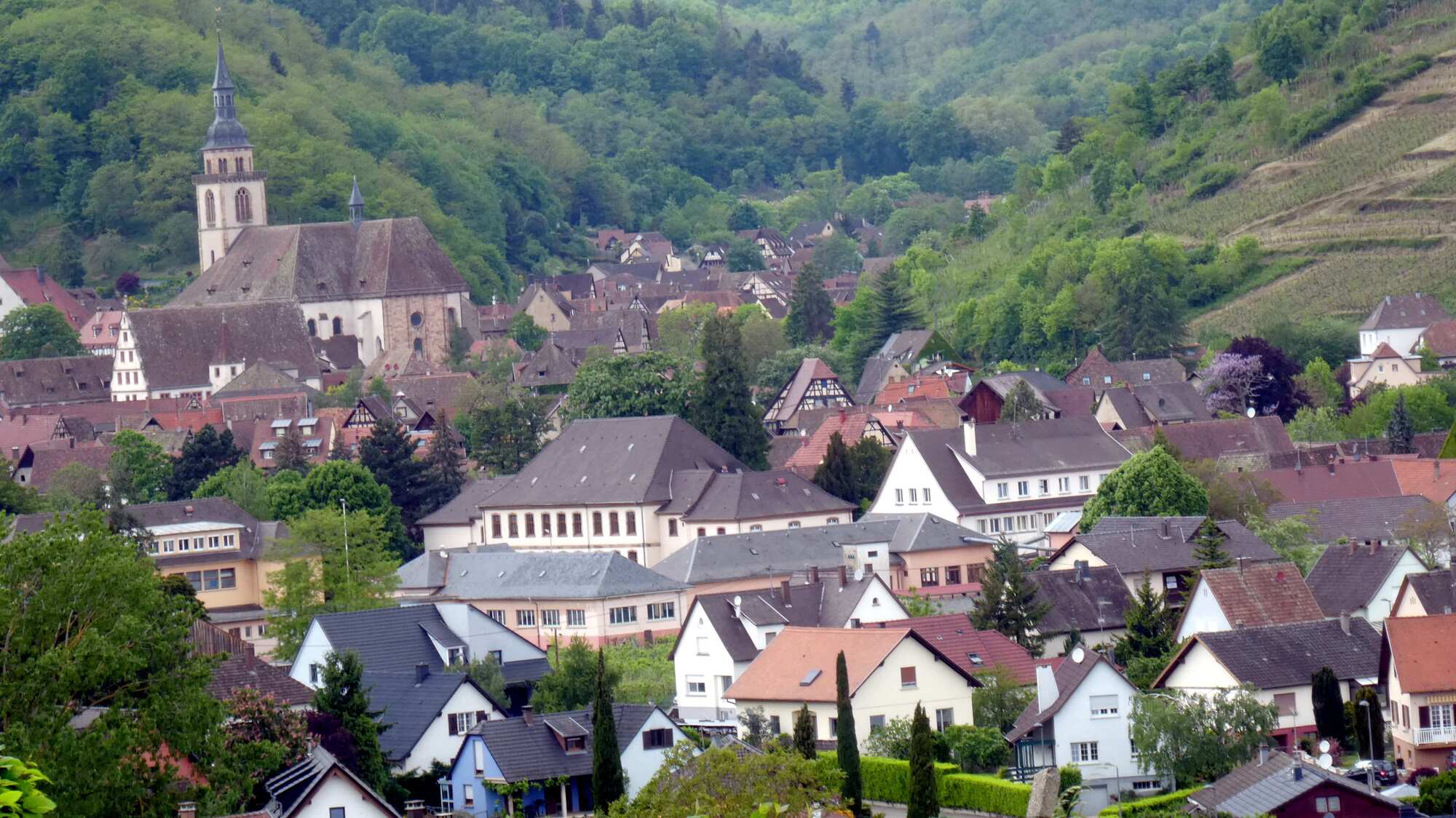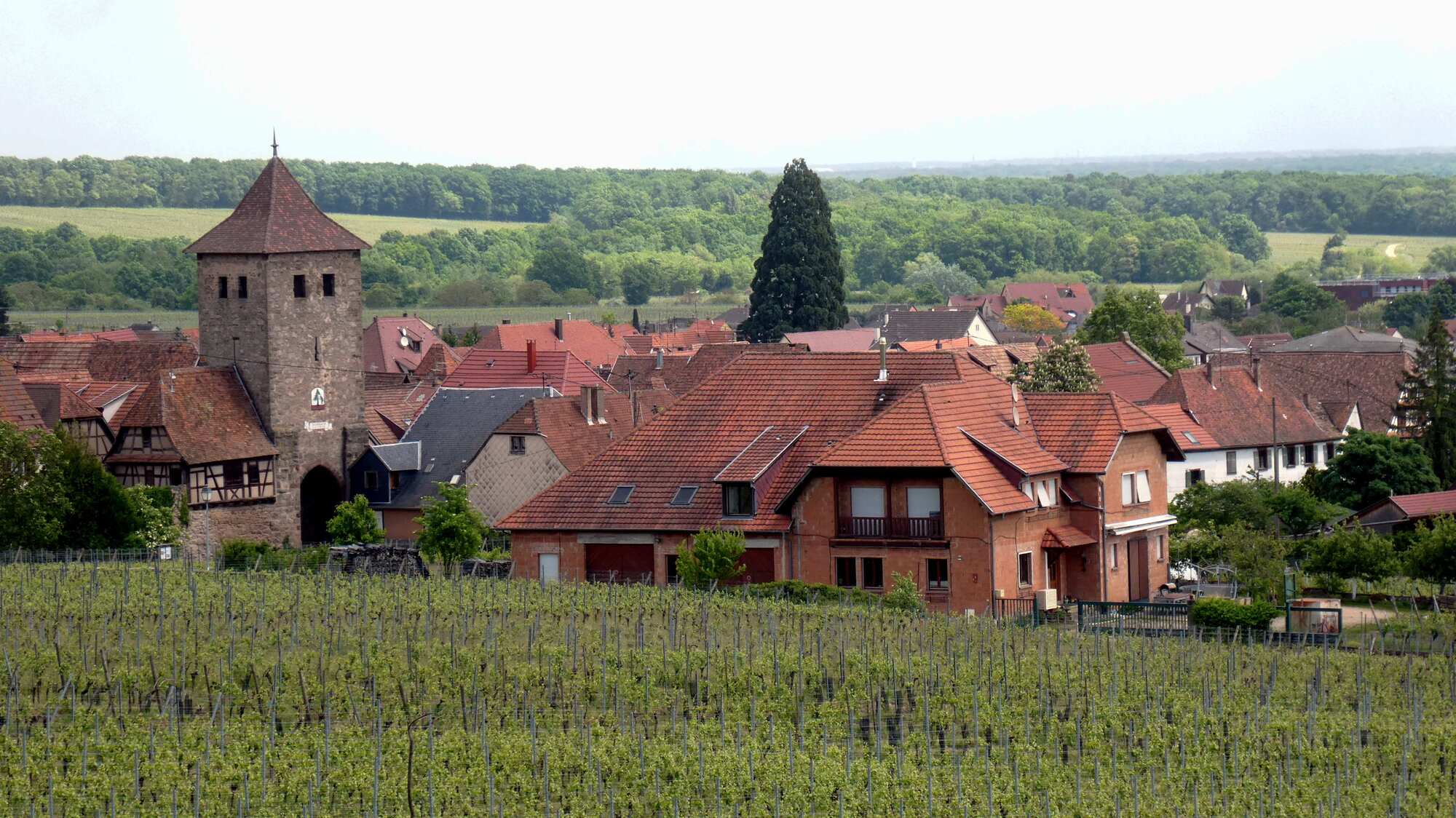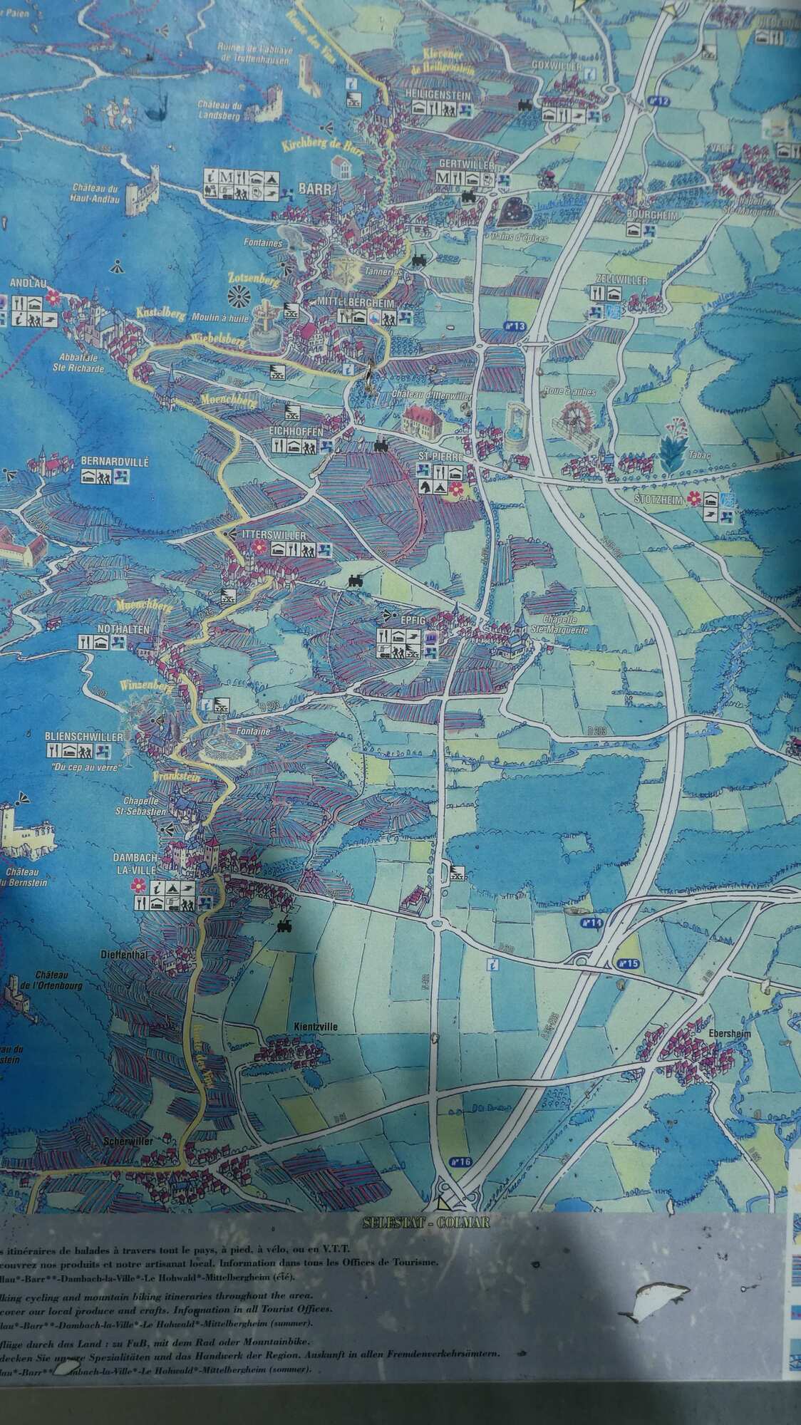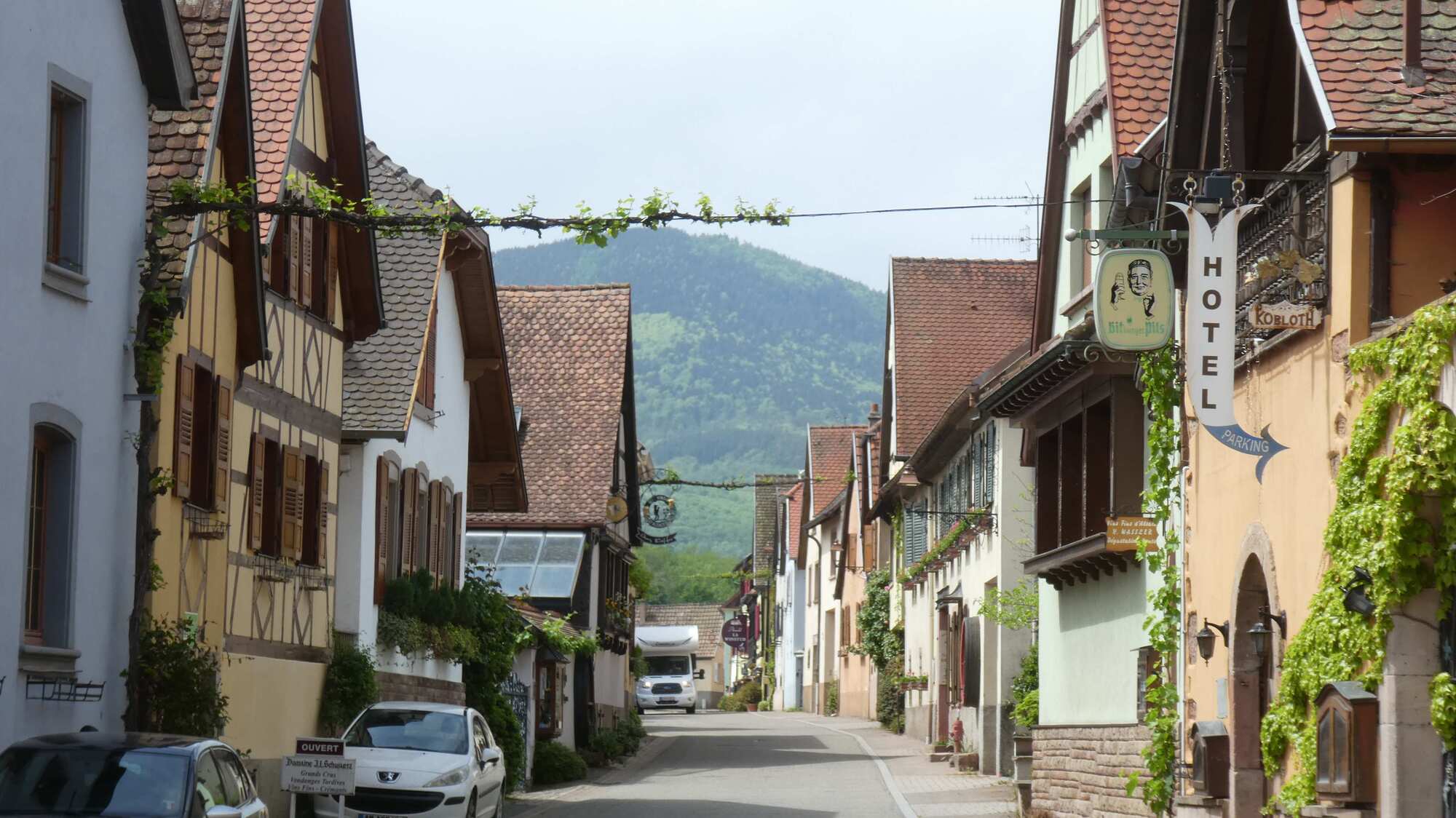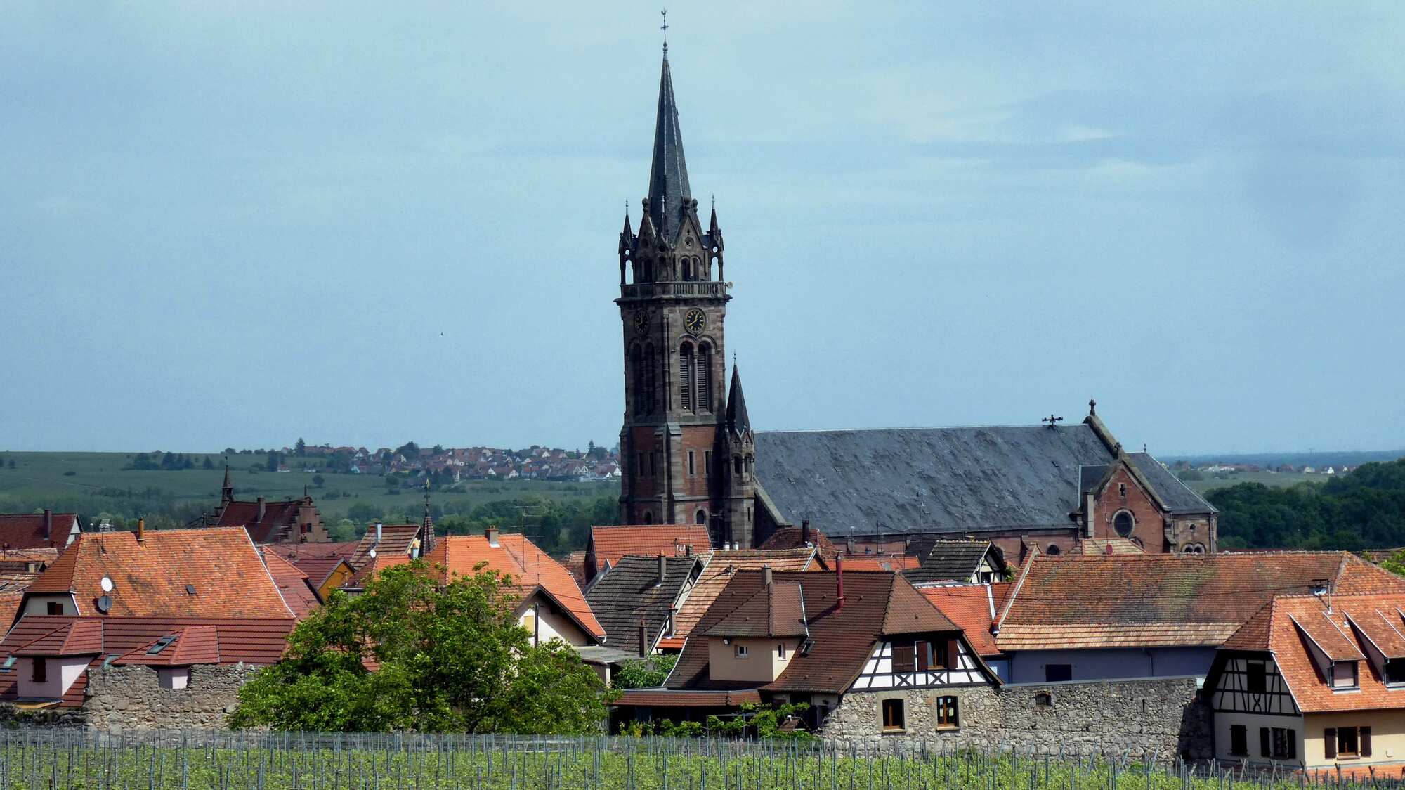 The layout for the wine route is dominated by the fact of the Vosges mountains, forming a wall to the west, and the Rhine plain forming the boundary to the east. Between these limits, the vines are arranged to mount the Vosges slopes, and sprinkled among them are about 100 villages, many with extremely beautiful cores of fachwerk buildings.