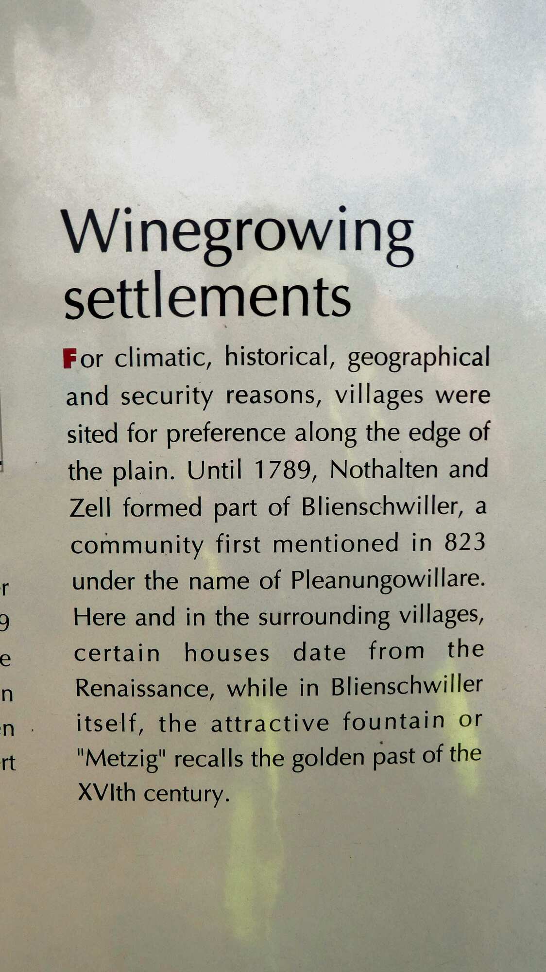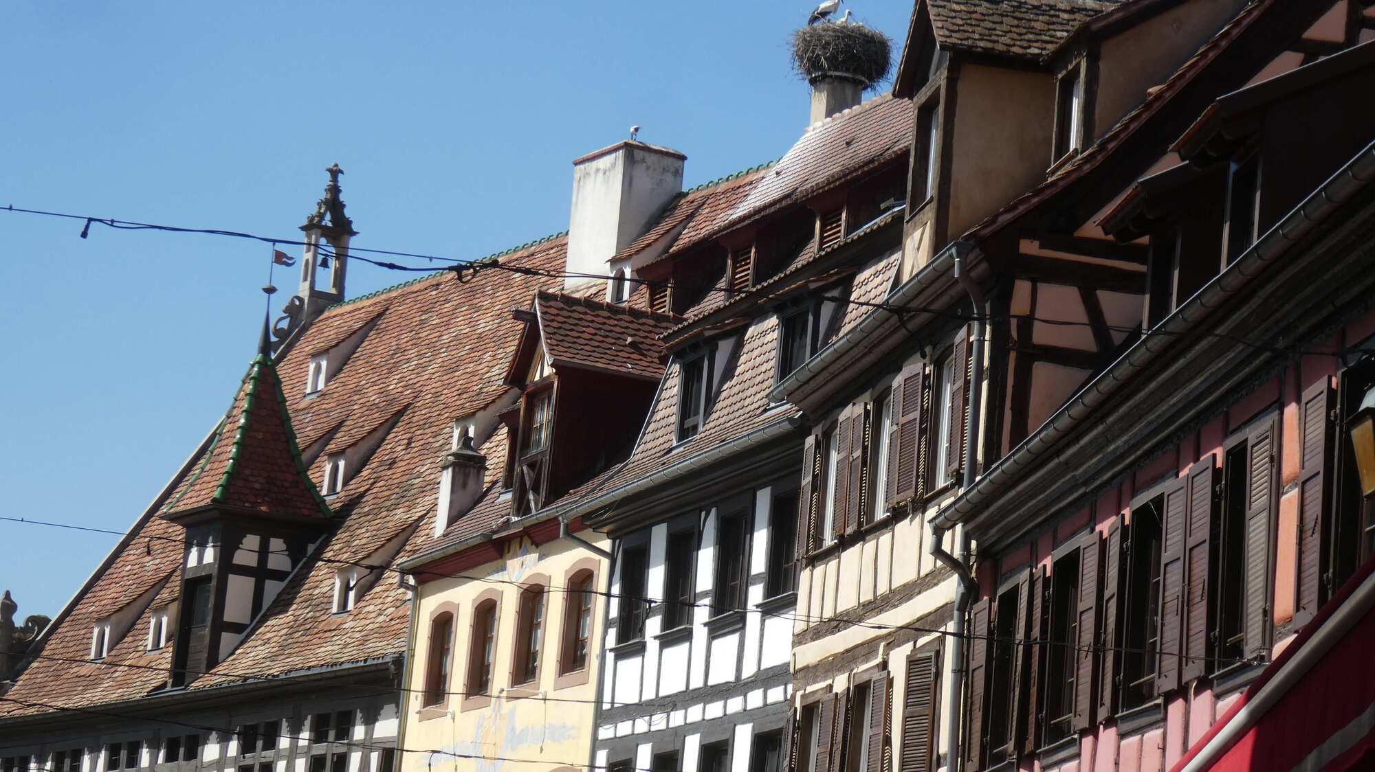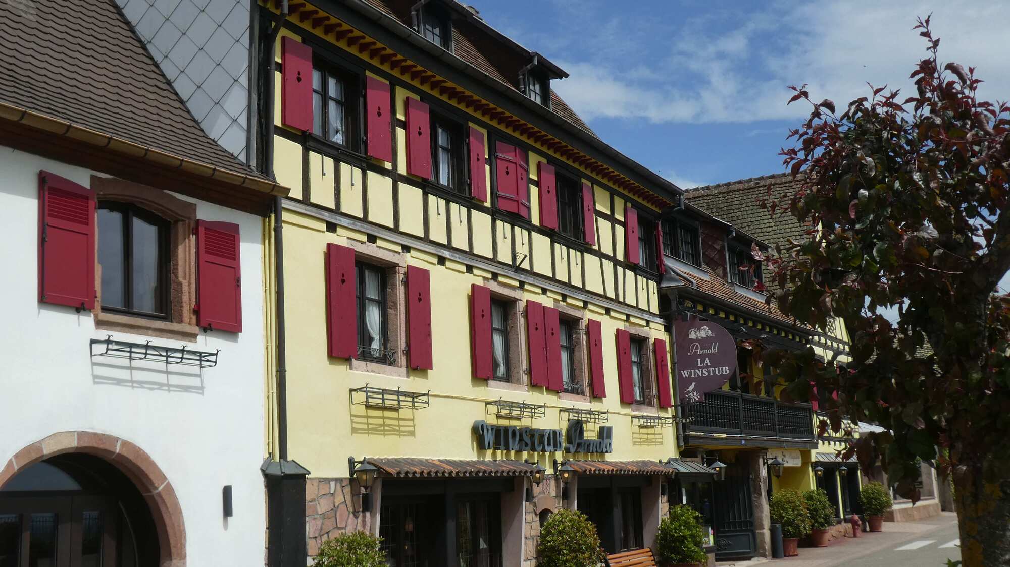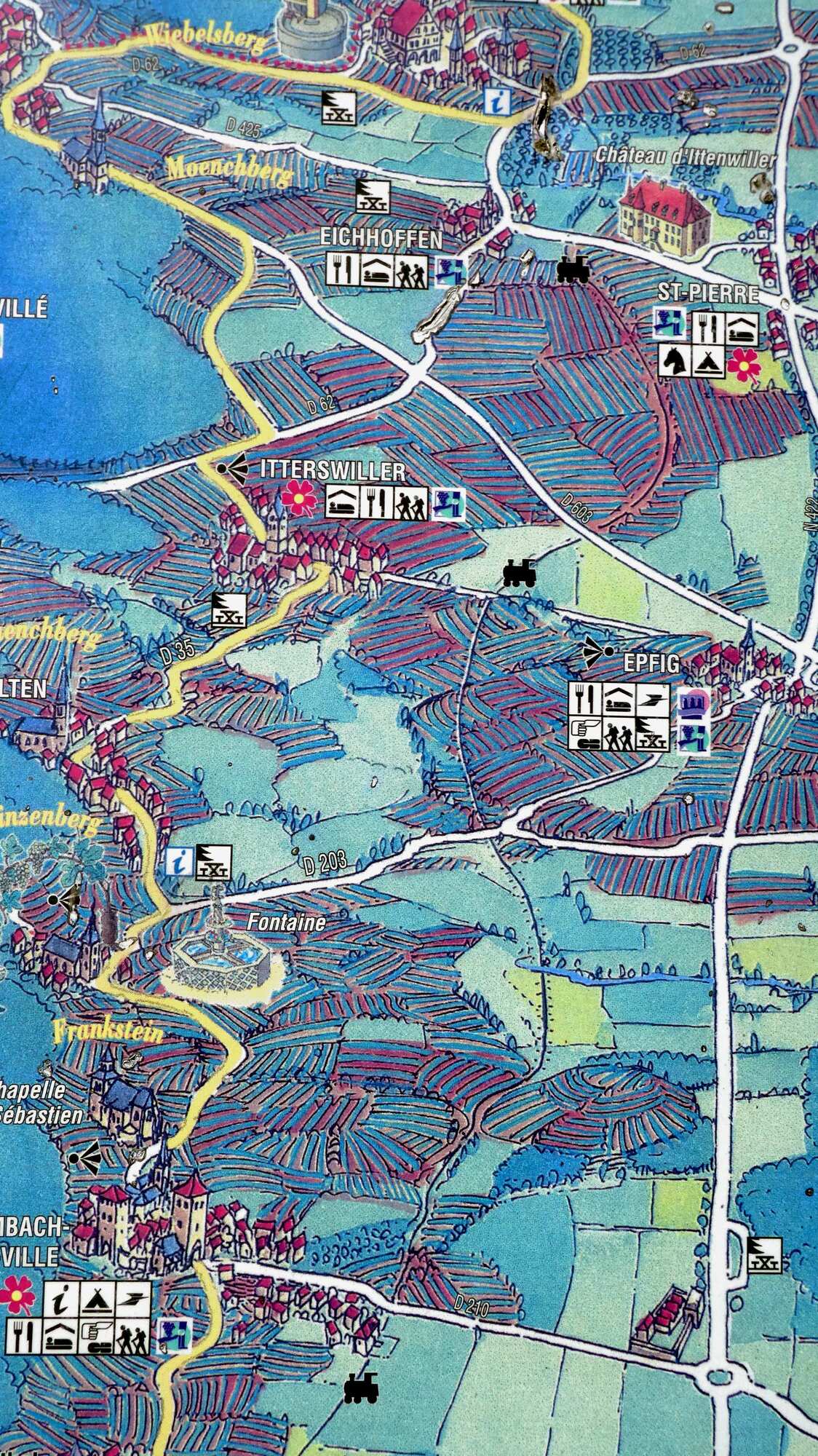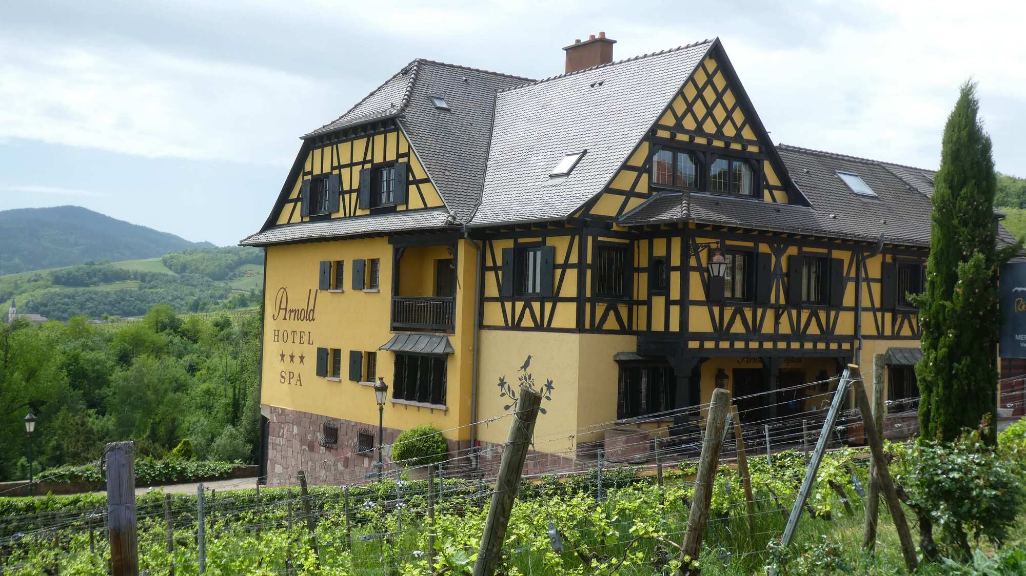 The layout for the wine route is dominated by the fact of the Vosges mountains, forming a wall to the west, and the Rhine plain forming the boundary to the east. Between these limits, the vines are arranged to mount the Vosges slopes, and sprinkled among them are about 100 villages, many with extremely beautiful cores of fachwerk buildings.