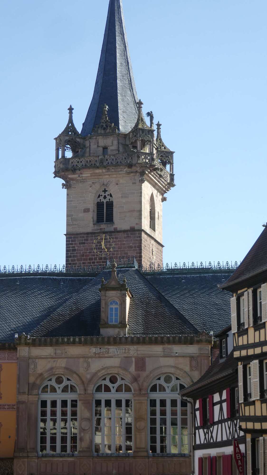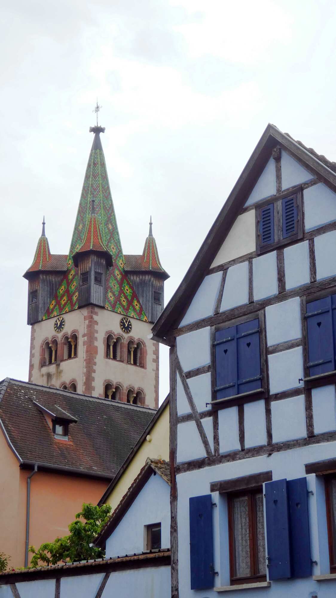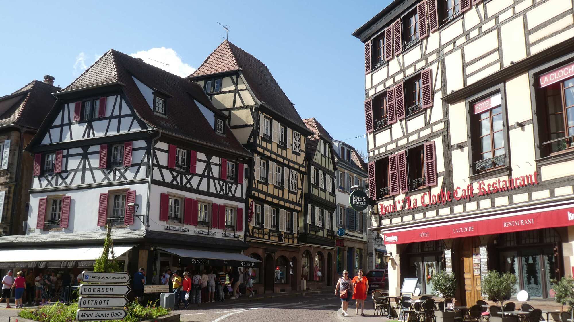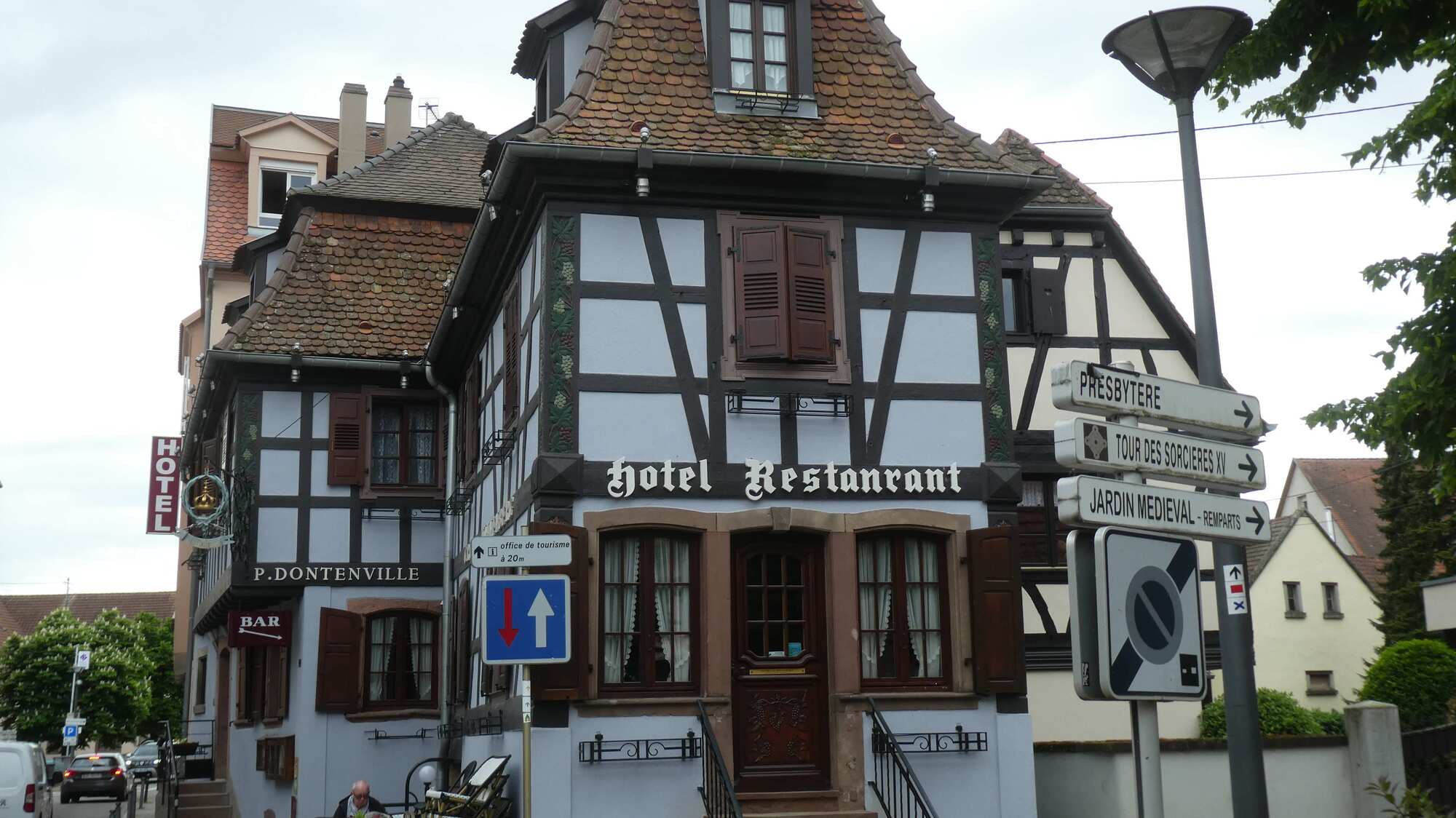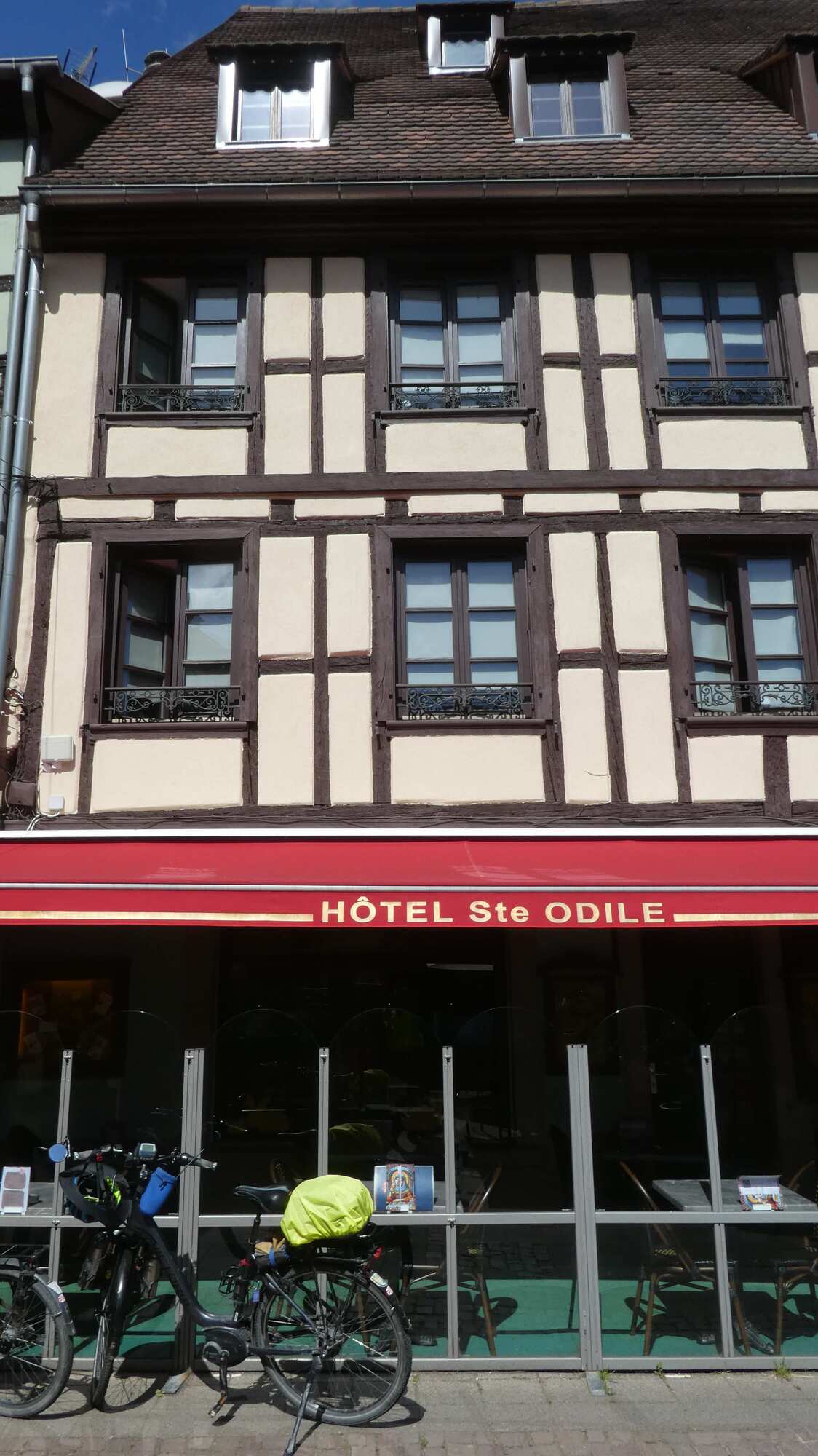 We got to the outskirts of Obernai, our destination for the day, and found it clogged with parked cars and camper vans, plus a lot of construction. We pushed on through, and landed in front of our hotel, the Sainte Odile. (Odile of Alsace was born in Obernai in 660 a.d. She is the patron of good eyesight.)