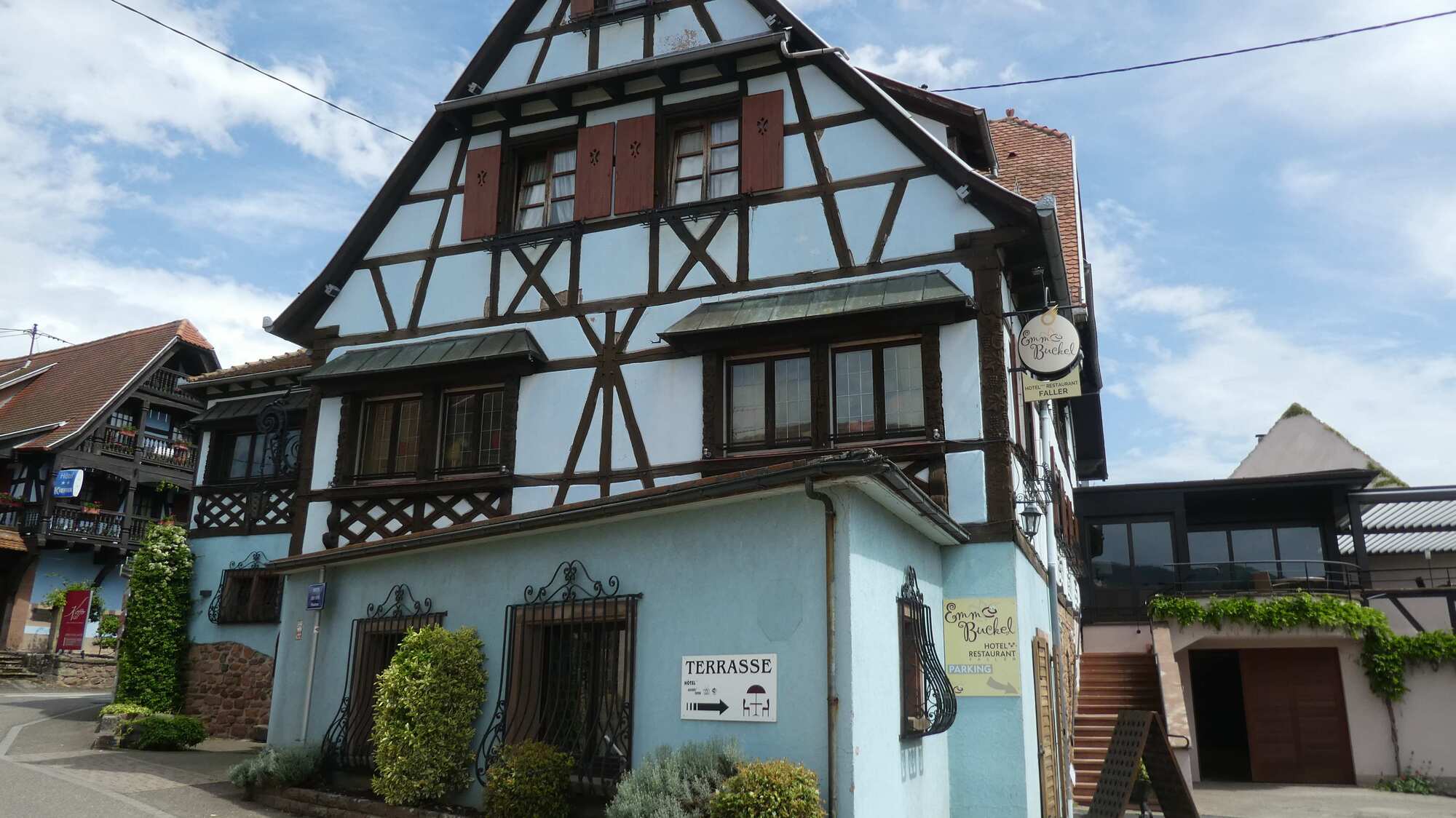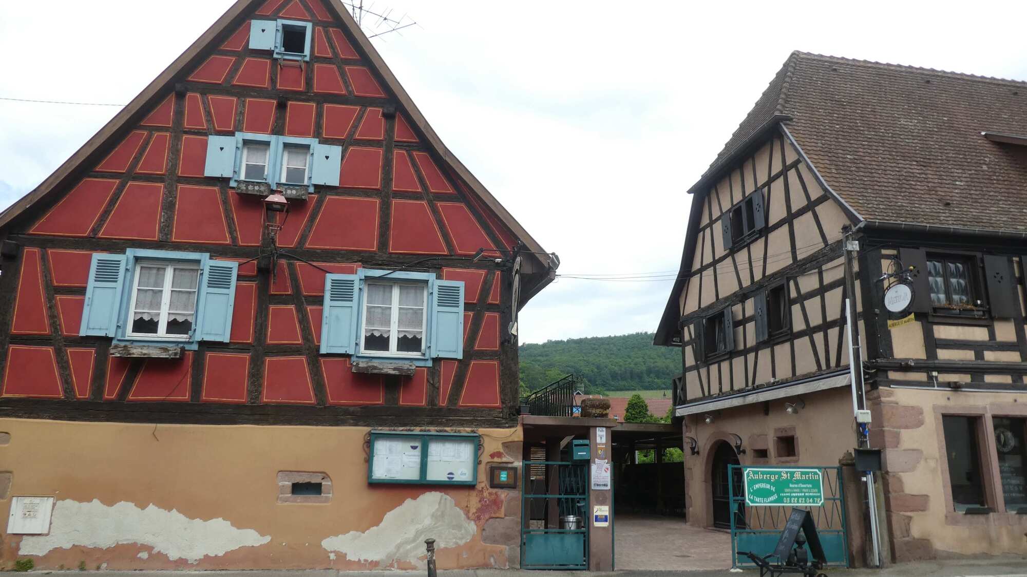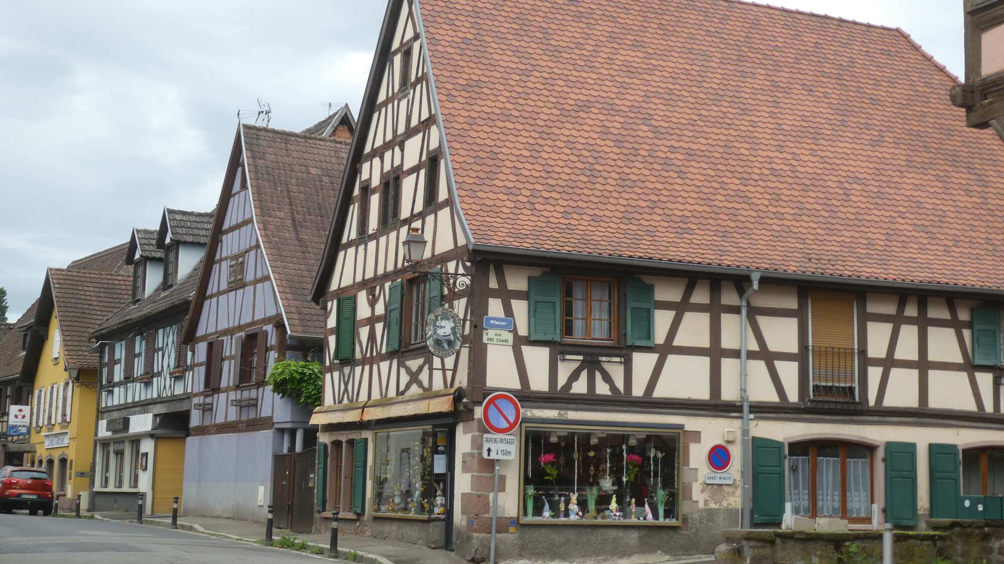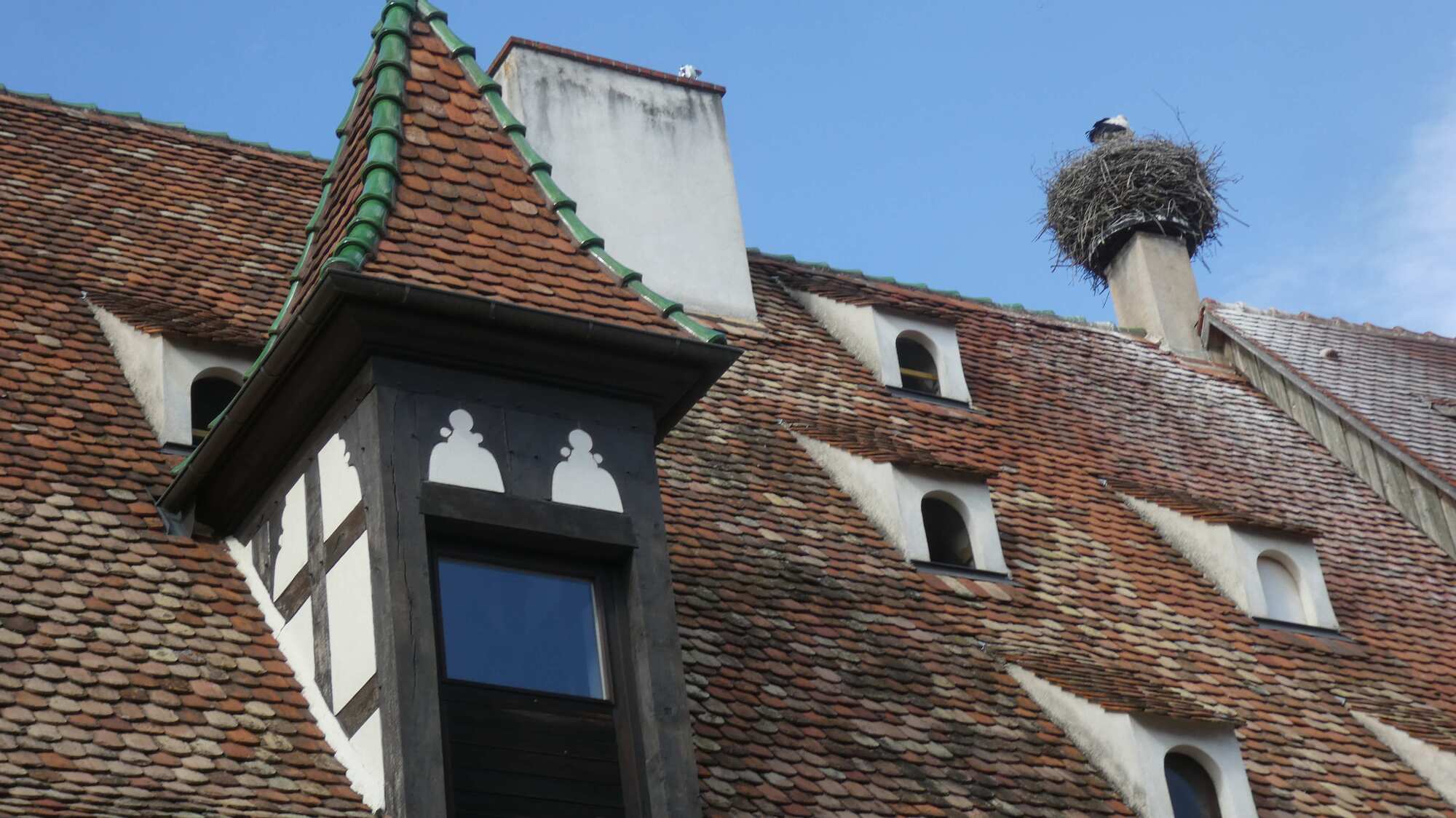 We got to the outskirts of Obernai, our destination for the day, and found it clogged with parked cars and camper vans, plus a lot of construction. We pushed on through, and landed in front of our hotel, the Sainte Odile. (Odile of Alsace was born in Obernai in 660 a.d. She is the patron of good eyesight.)