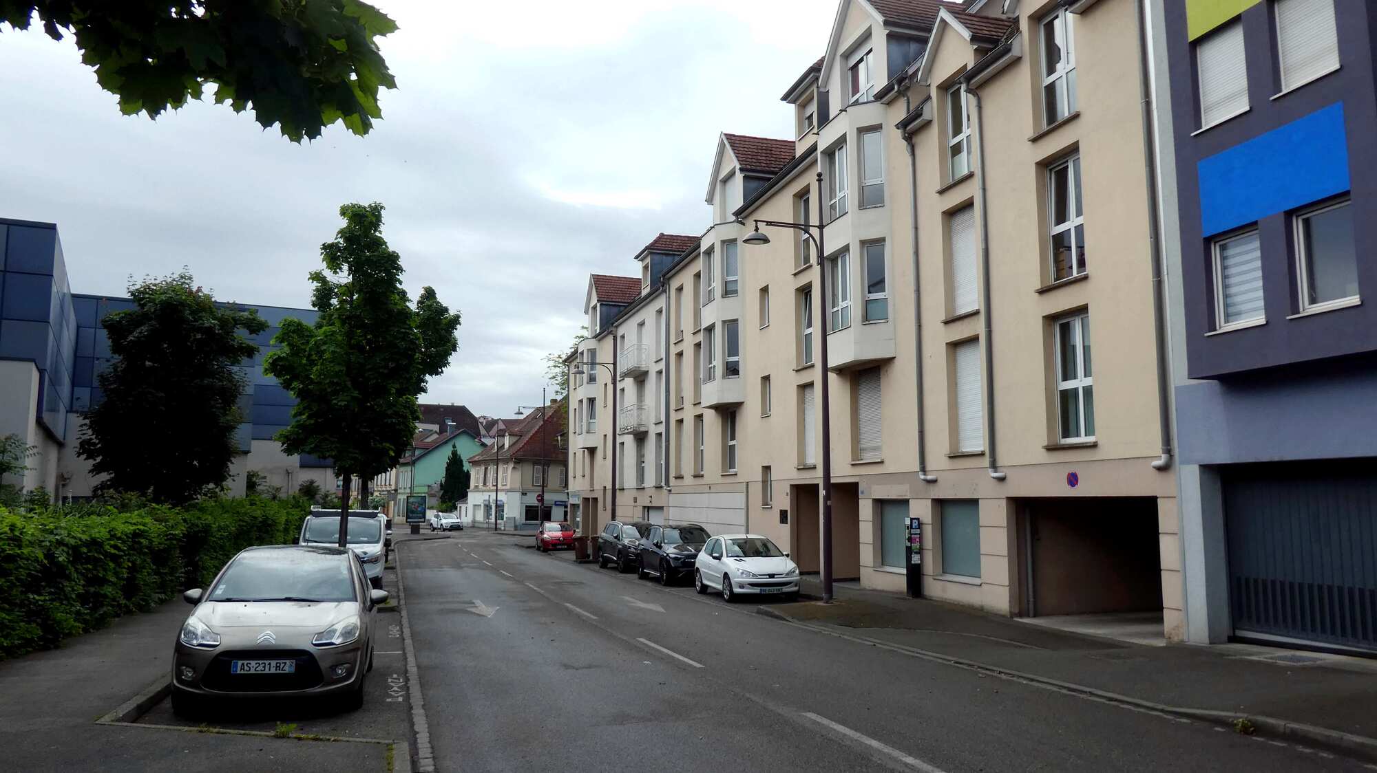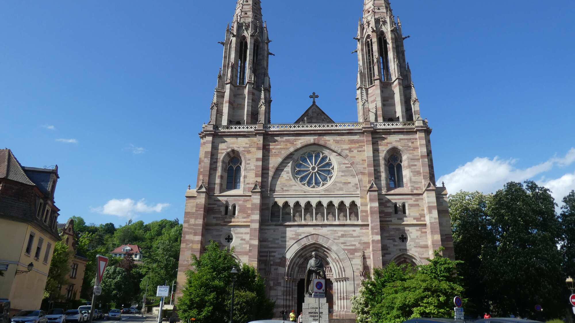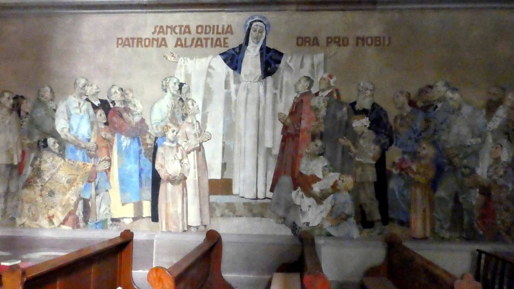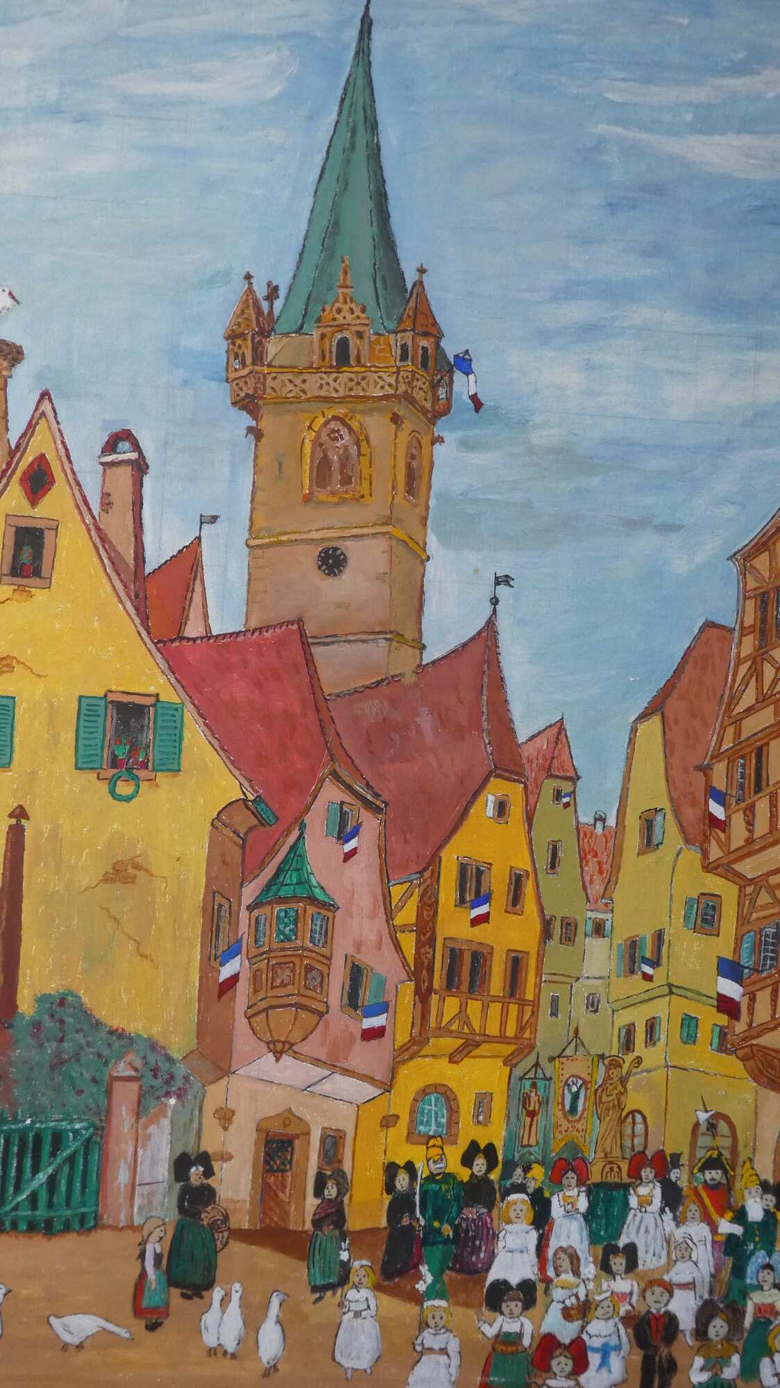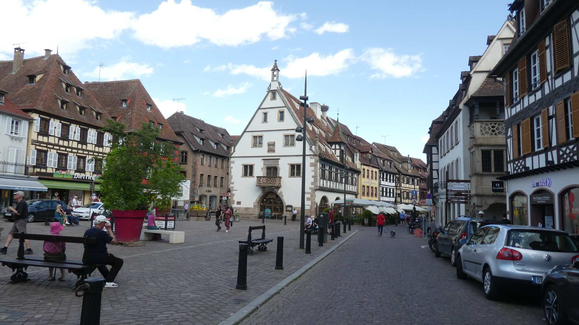 We got to the outskirts of Obernai, our destination for the day, and found it clogged with parked cars and camper vans, plus a lot of construction. We pushed on through, and landed in front of our hotel, the Sainte Odile. (Odile of Alsace was born in Obernai in 660 a.d. She is the patron of good eyesight.)