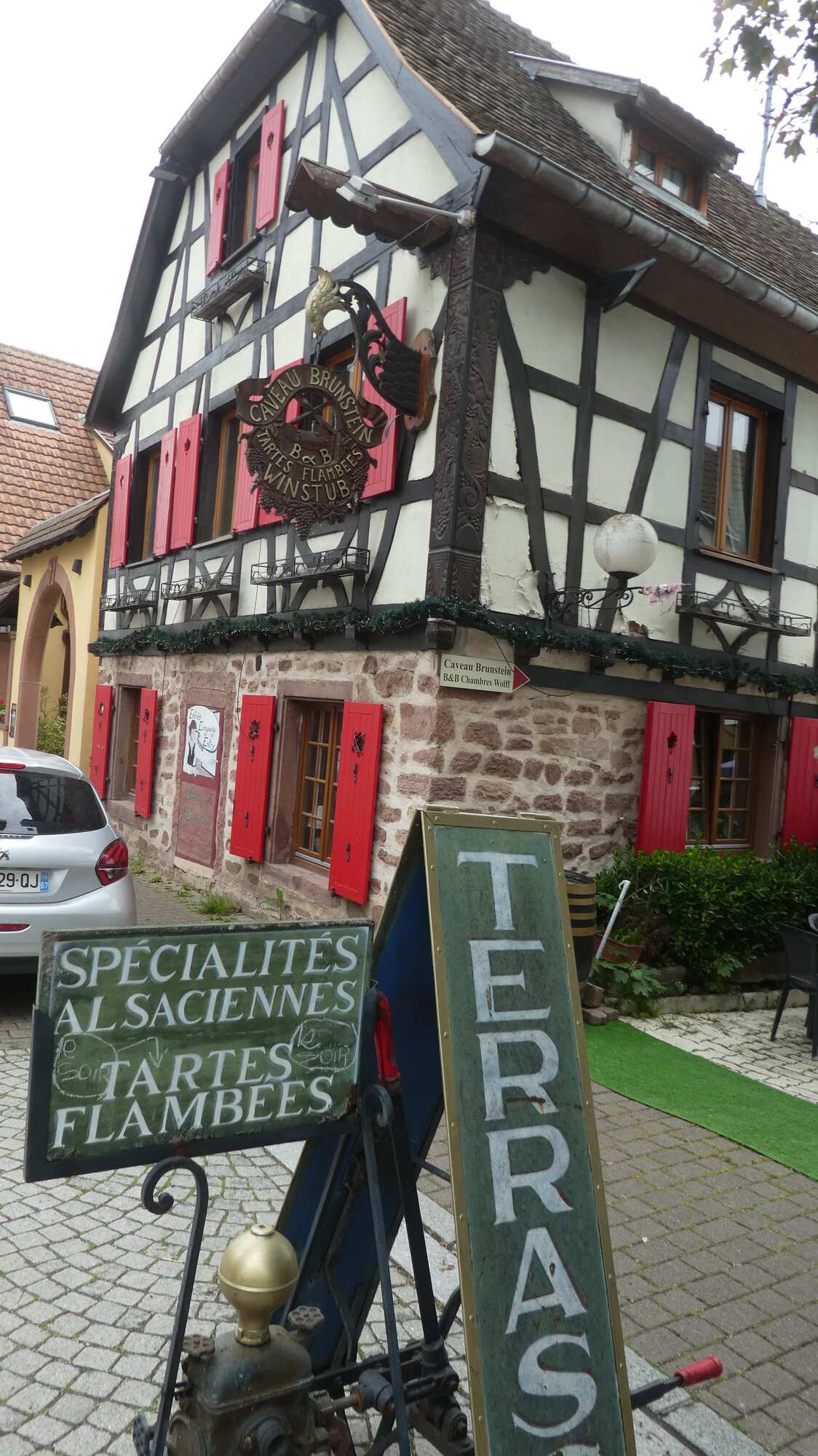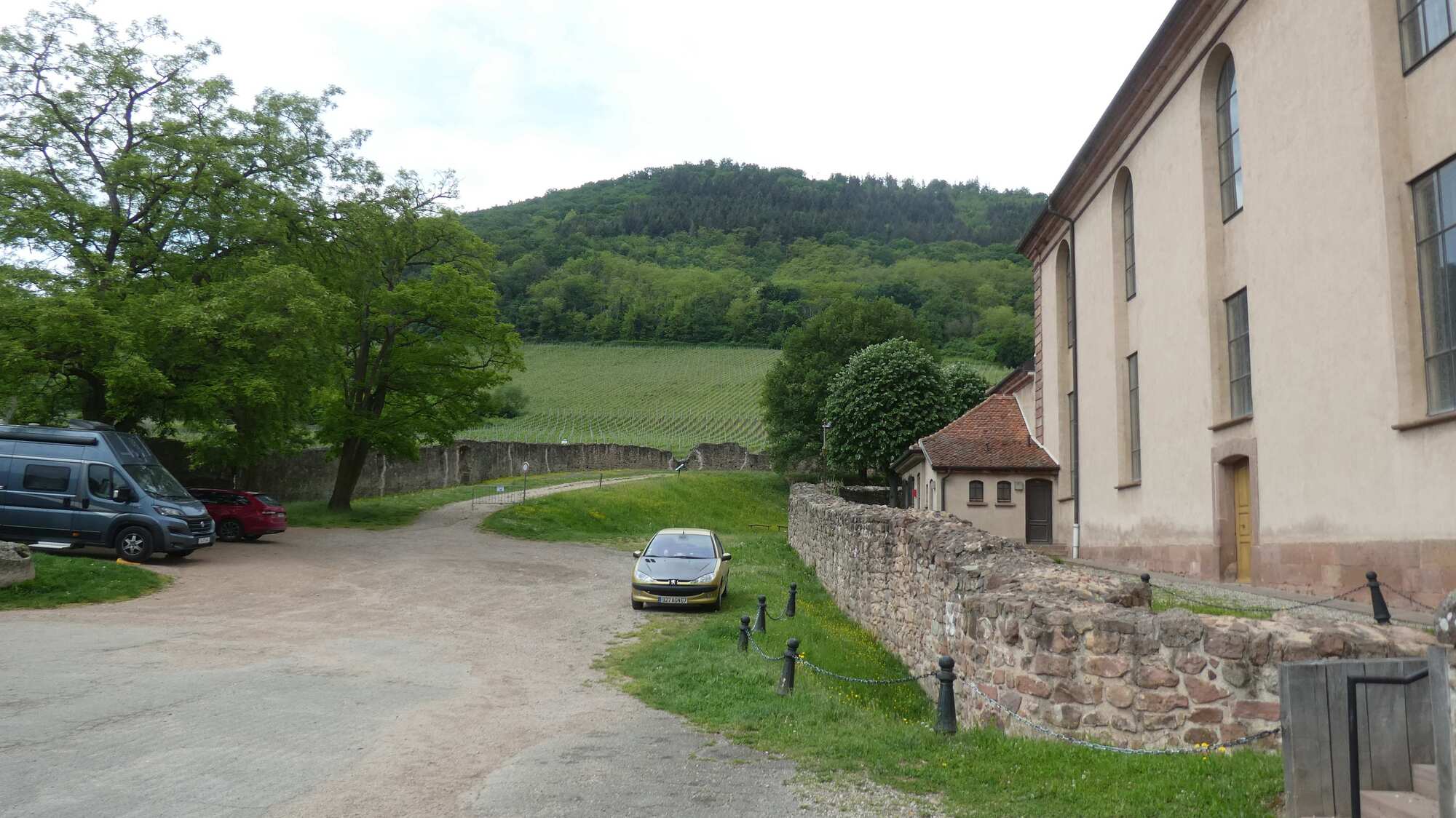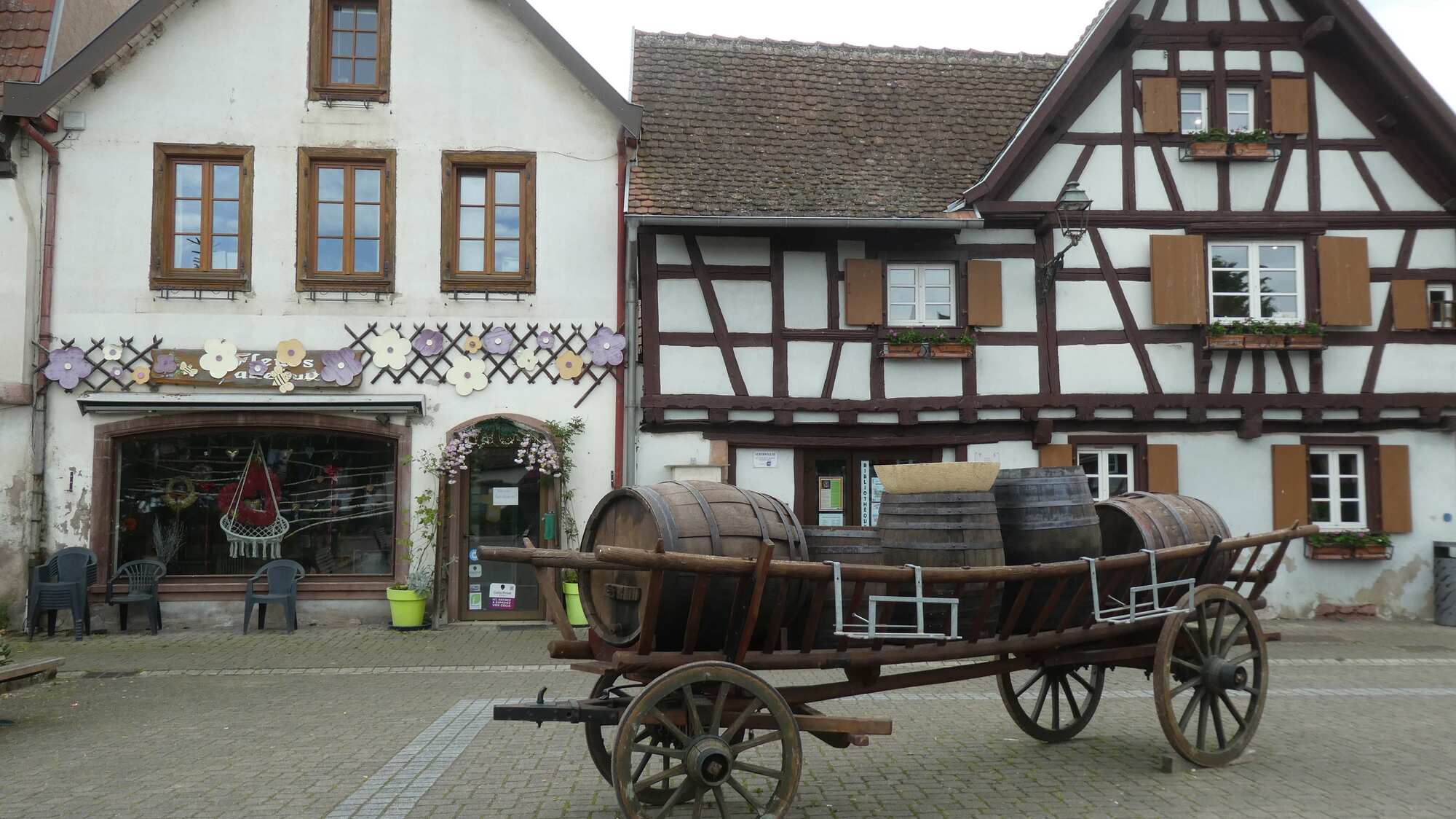 In Scherwiller we stopped to eat our sandwiches. The barrel cart in the photo is stationed in front of the library. I had a close look at it, and it seemed extremely useful and capable, if of course you had a horse and five barrels of wine!