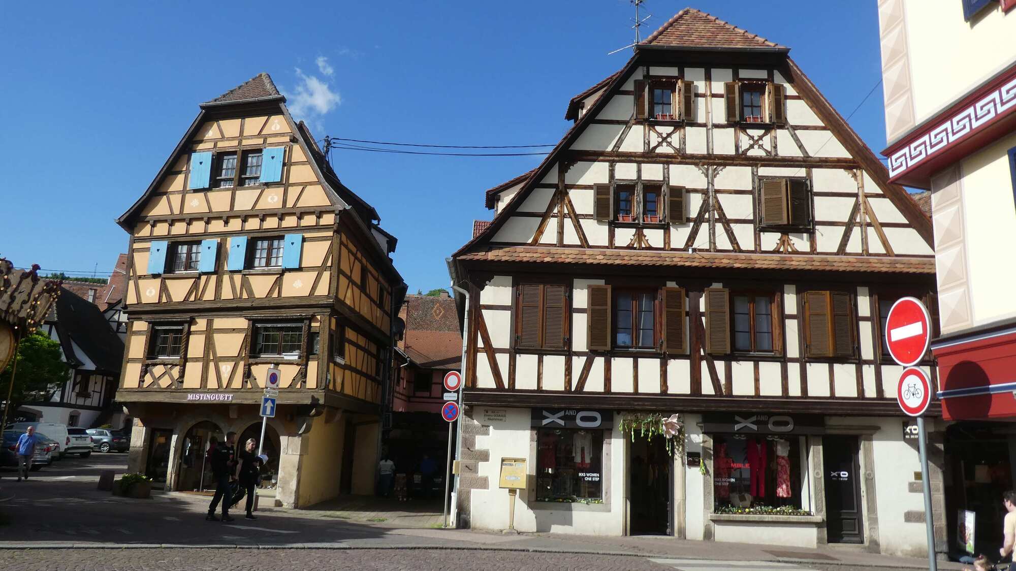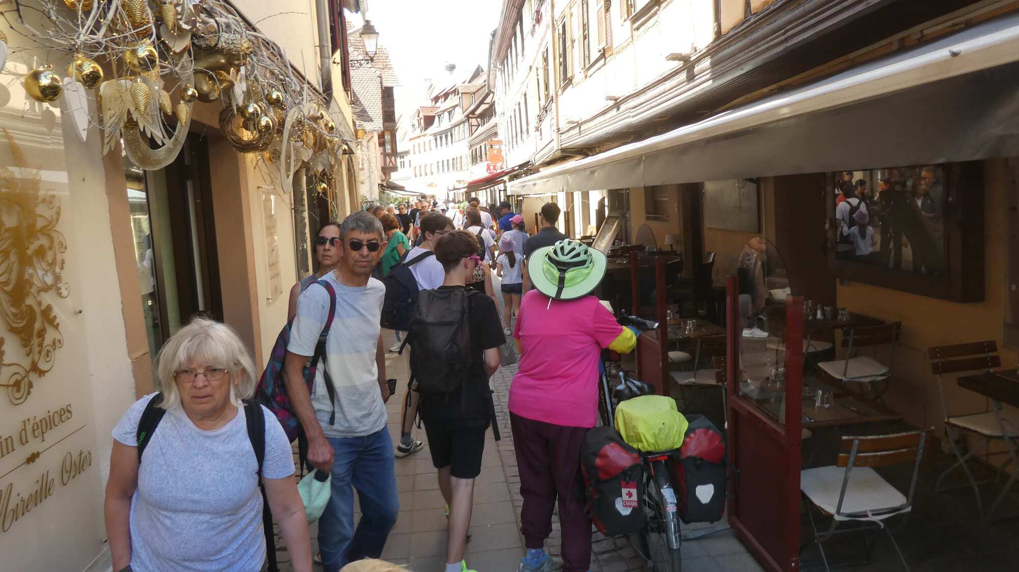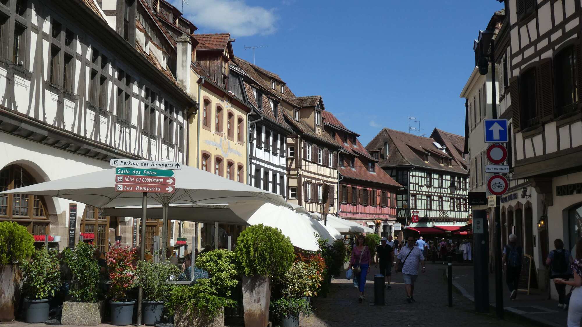 But Primo was really yesterday's news. Today we would follow the Alsace wine route, with fresh air and vistas, great bike ways, and some glorious streetscapes and buildings. By the way, if you think Dodie is going the wrong way, she's not. People who put up direction signs love to point them straight at forks in the road. We found out that the route goes left here the hard way.