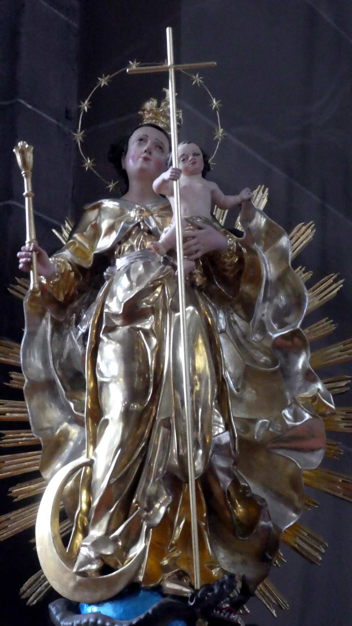 Virgin of the Apocalypse. Baby Jesus is carrying a cross - he has his timeline mixed up!