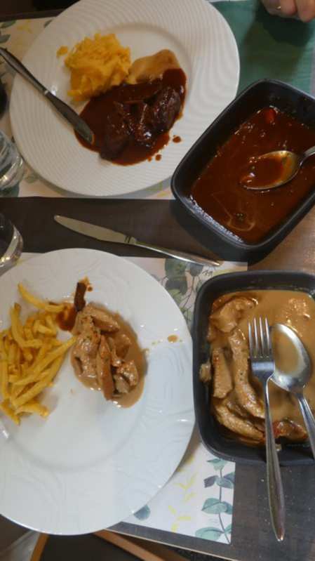 The special was boeuf bourguignonne with pureed carrot and potato. Spying something different on another table, I was able to get turkey in mushroom sauce, with fries. These look pretty plain in the photo, without being arranged with the salad bar stuff, but we gobbled up the salad bar well before thinking about photos!