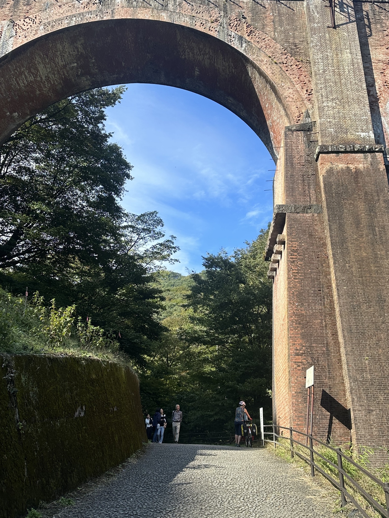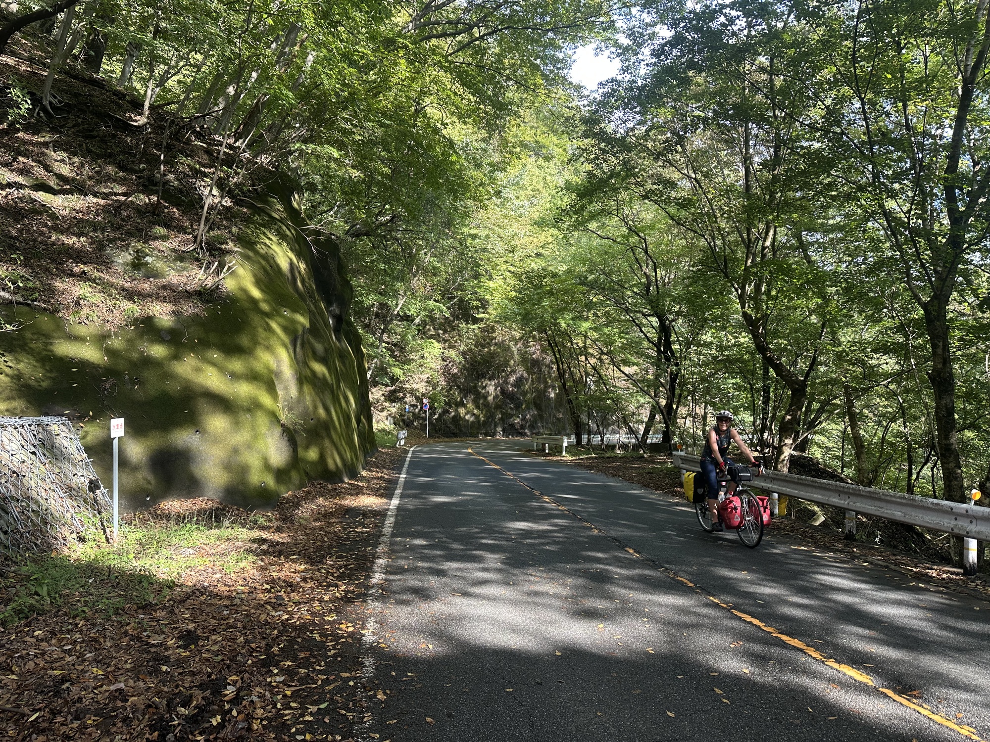 Just at the point where our navigation tools warned us that the day’s climbing would begin, we came to a complicated highway bypass, where we accidentally took a turning onto a road signed “Old Highway 18”. We stopped by the roadside to discuss our options: I was in favor of following a road identified as old, on the theory that most traffic would be on the new option. Then Tom discovered that the old highway followed the Nakasendo Way, an ancient route connecting Edo (today’s Tokyo) with Kyoto. Since we’d come to these mountains with the idea of walking a portion of the Nakasendo, biking along it as well was too good an opportunity to pass up. Plus, it looked like it had a slightly lower elevation gain than the route Komoot was trying to put us on. So, thanking the gods of randomness that put this road in our way, we pitched our planned route.