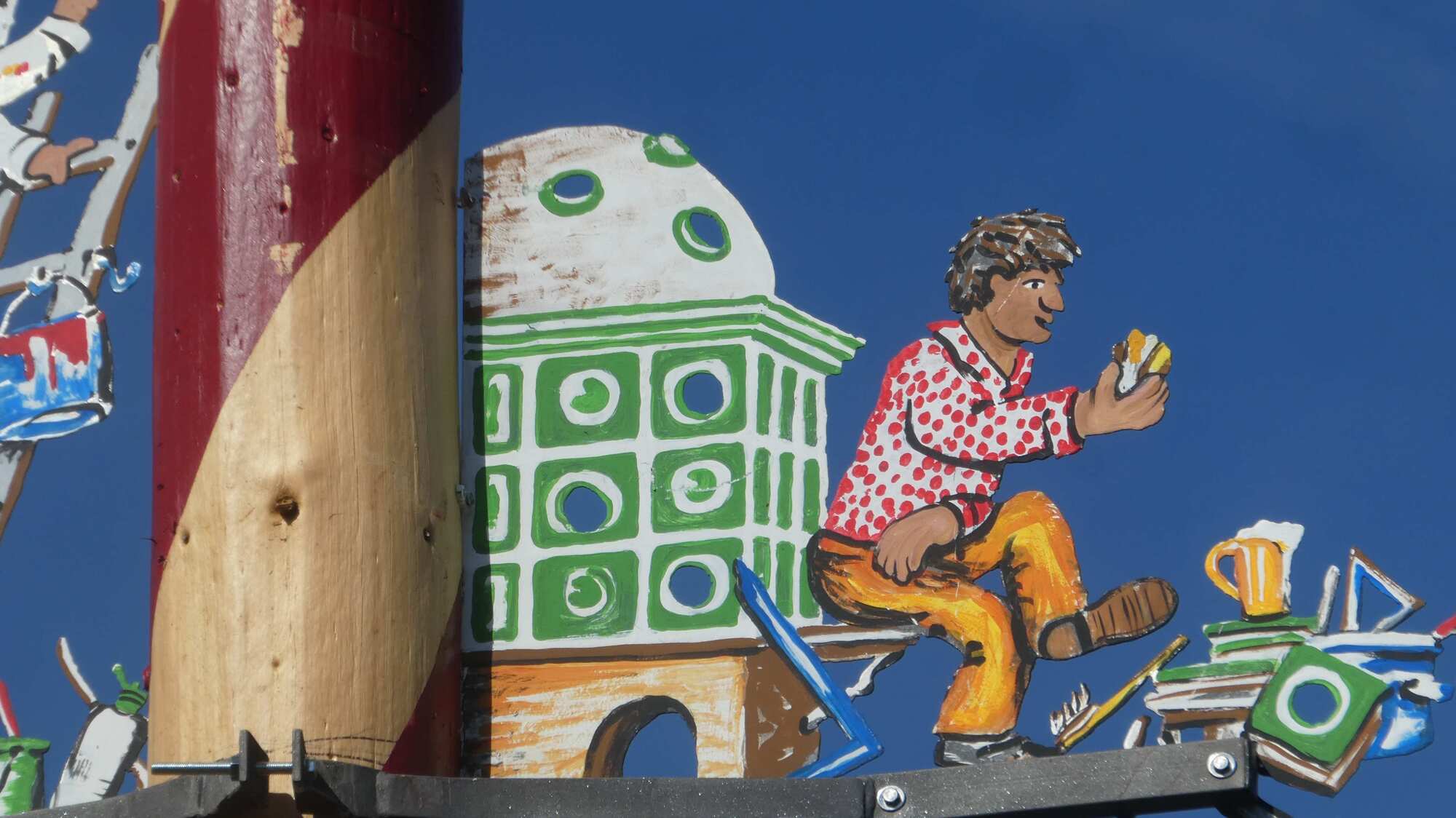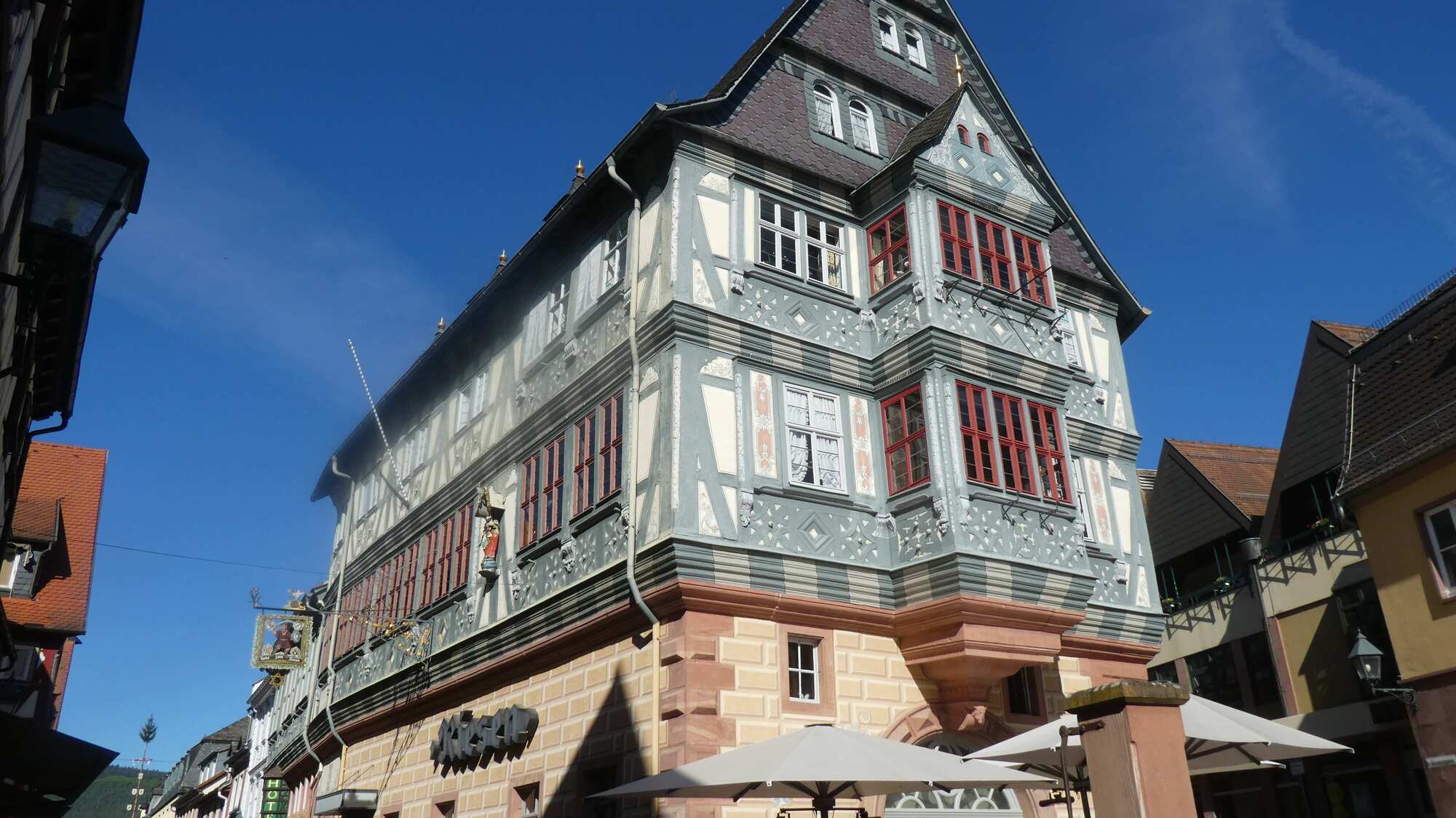 Now it came time to see about that schnitzel. We took ourselves into the square and began to walk down the portion of the main street that we had not passed through on our way in to town. We read some menu boards of restaurants along the way, and bypassed others where the seating was too sunny. Now in the near distance, standing in a fork in the street, was a large and very decorative building. Dodie read on our town map that this was "Zum Riesen" - the Giant Inn - "Germany's Oldest Inn". With that a little light, and I mean little, flickered on in the Grampie brain. We drew closer, and I framed up a nice photo - this one: