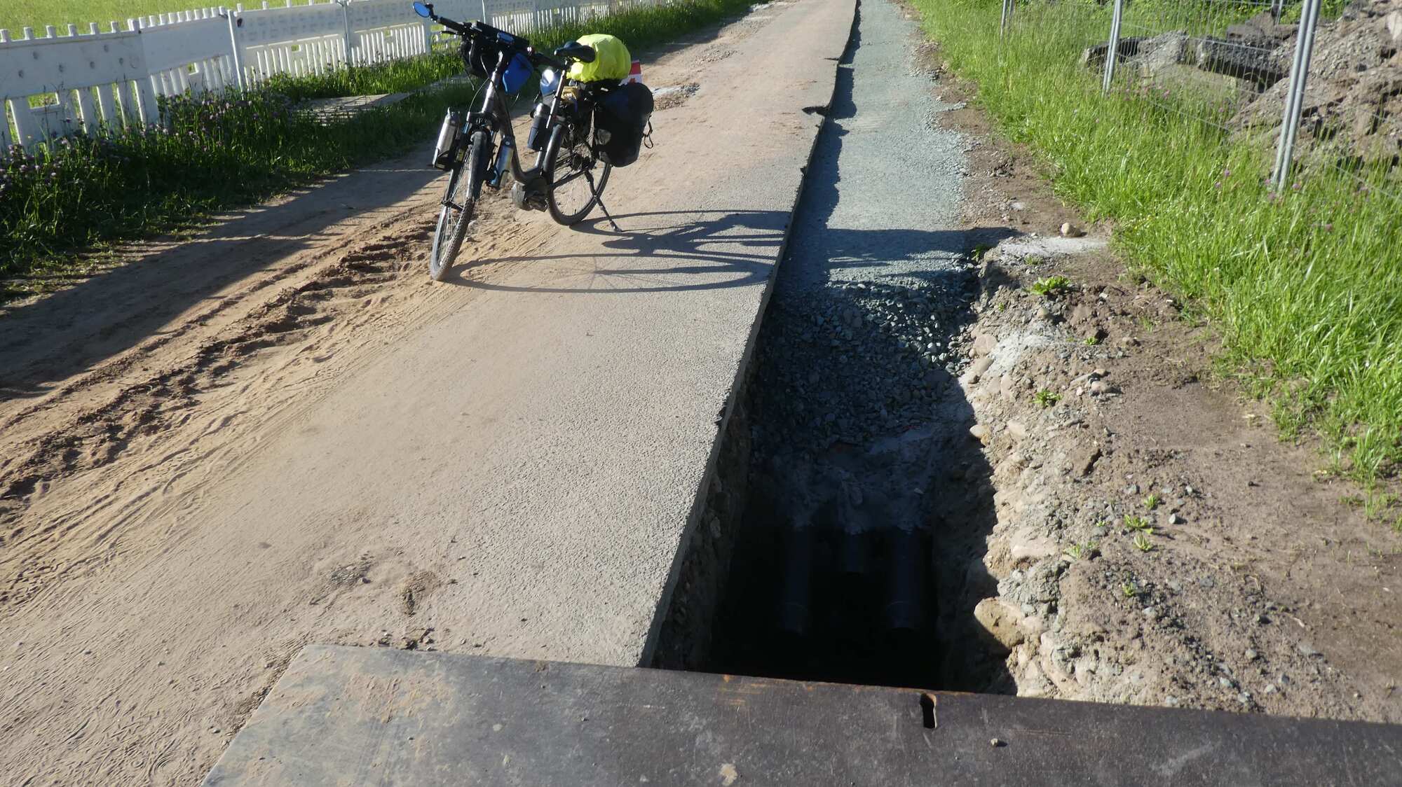 While the open trench was arguably dangerous, it was no more dangerous, I was thinking, than riding the white line on a busy road. In both cases, big trouble awaits the cyclist who wobbles more than about a foot.