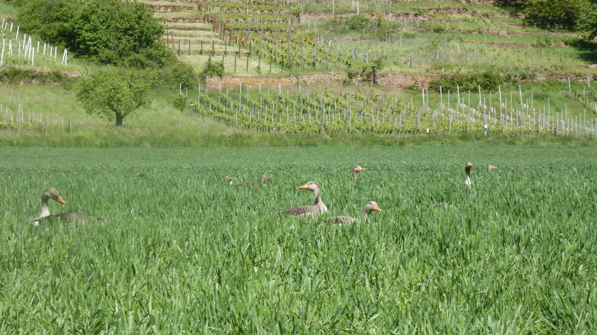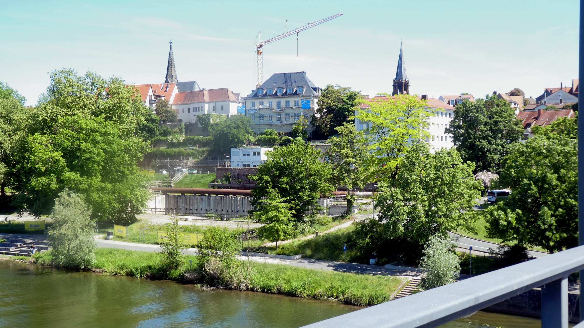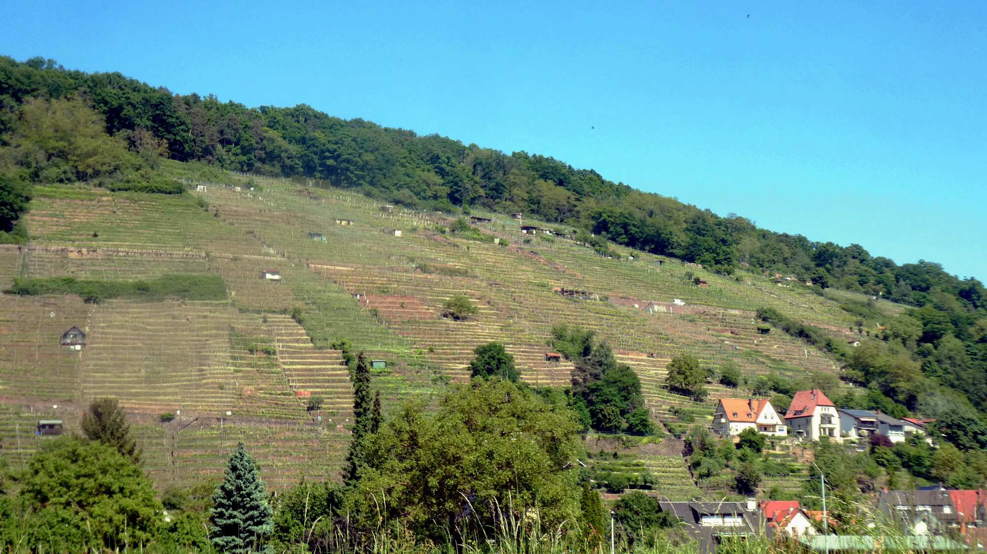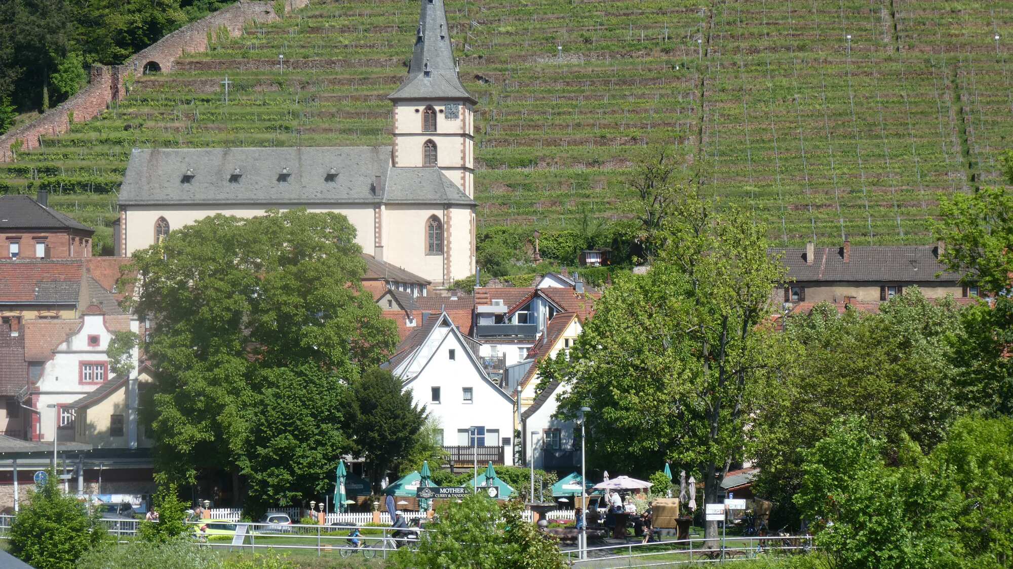 The Main, like the Rhine in spots, or the Mosel, has steep banks in places just face the sun just right, and so become sites of steep grape plantings. We found that, near Klingenberg. As always, these plantings are interesting and attractive.