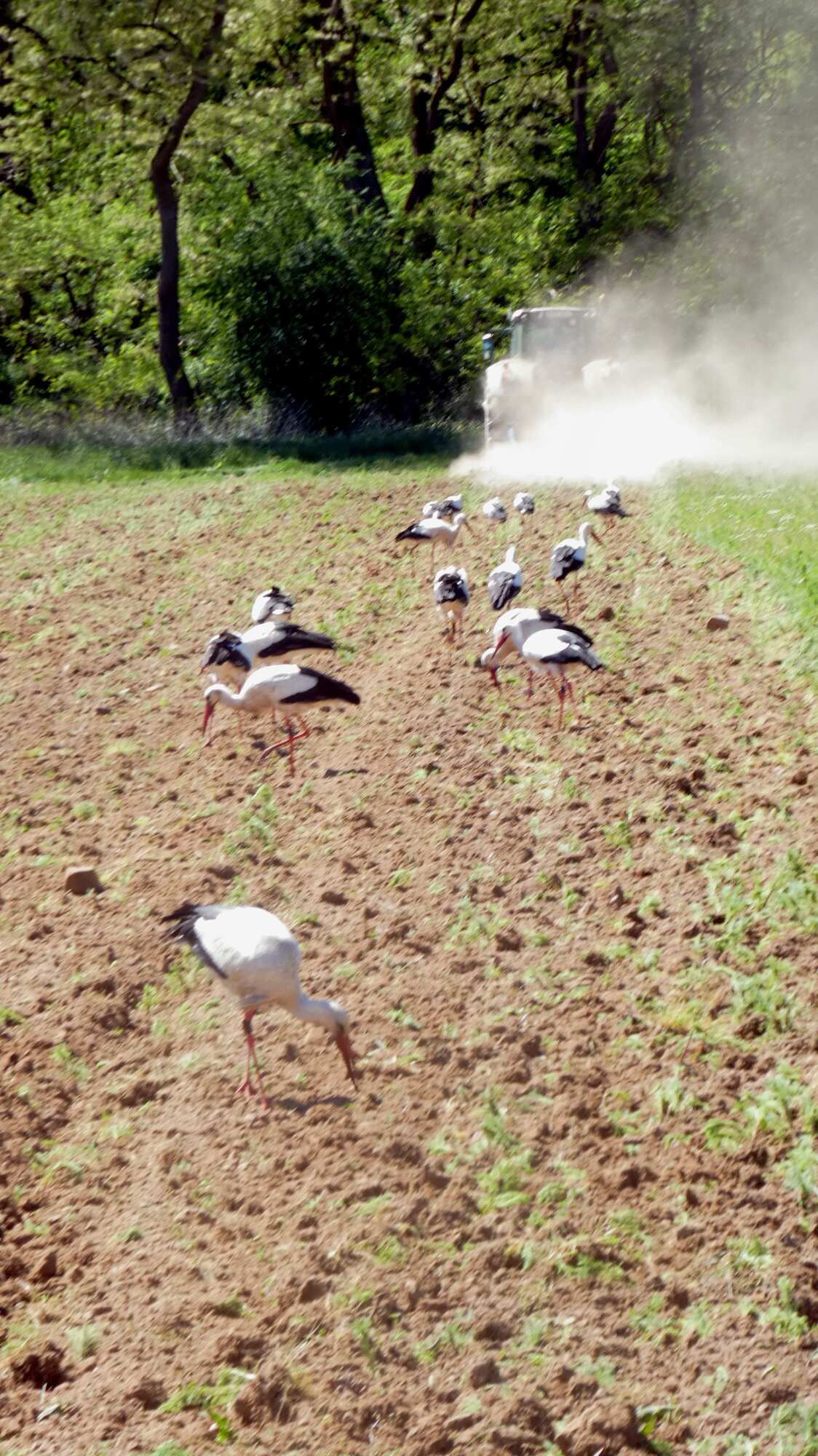 Further along the road now, a tractor plowing a field was attracting a lot of storks.