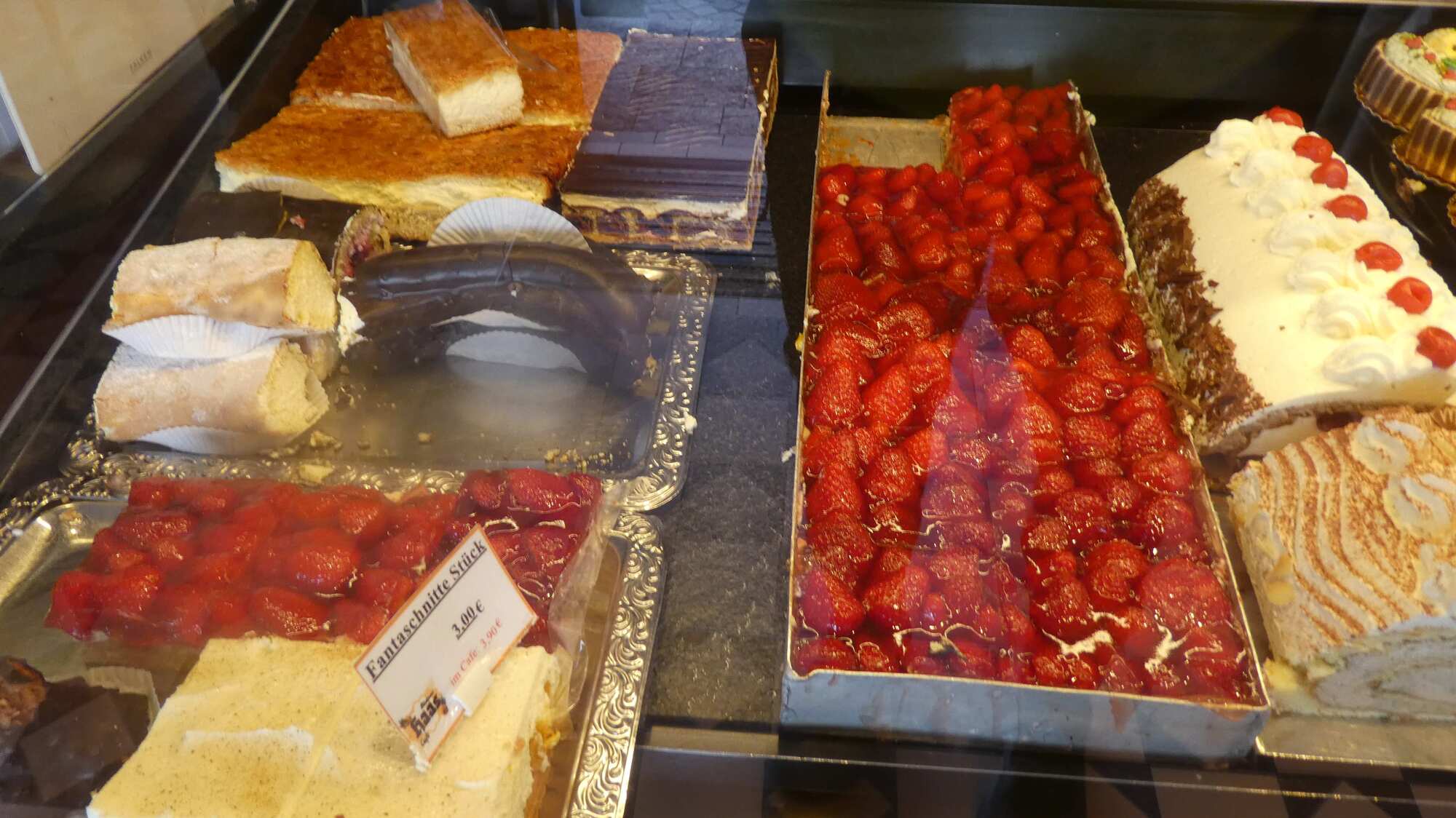 With our short planned time in Germany, there are two food items that I have set my heart on. One is schnitzel, and the other is the erdeberen schnitte. This latter is a quite simple pastry, with a maybe cookie like base, then white cake, and a topping of luscious fresh strawberries under a gelatin like glaze. It's super common this time of year, but of course you have to go in to the bakeries and look for it.