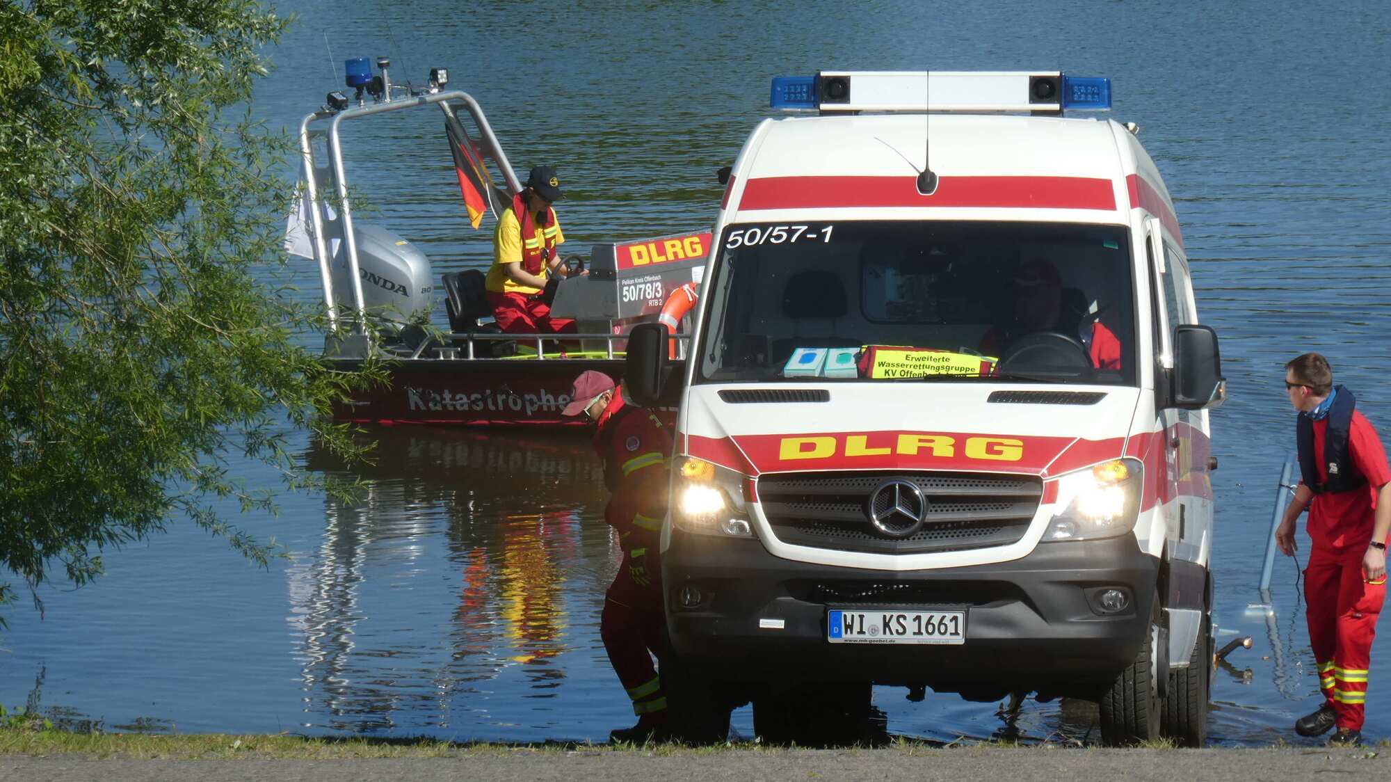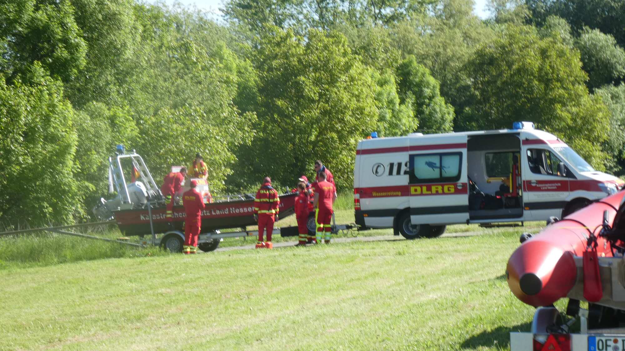 A little bit further up the river, we encountered a crew practicing with river rescue equipment. There were several trucks and boats. As with garbage trucks, Germans do not seem to be short of fun equipment.