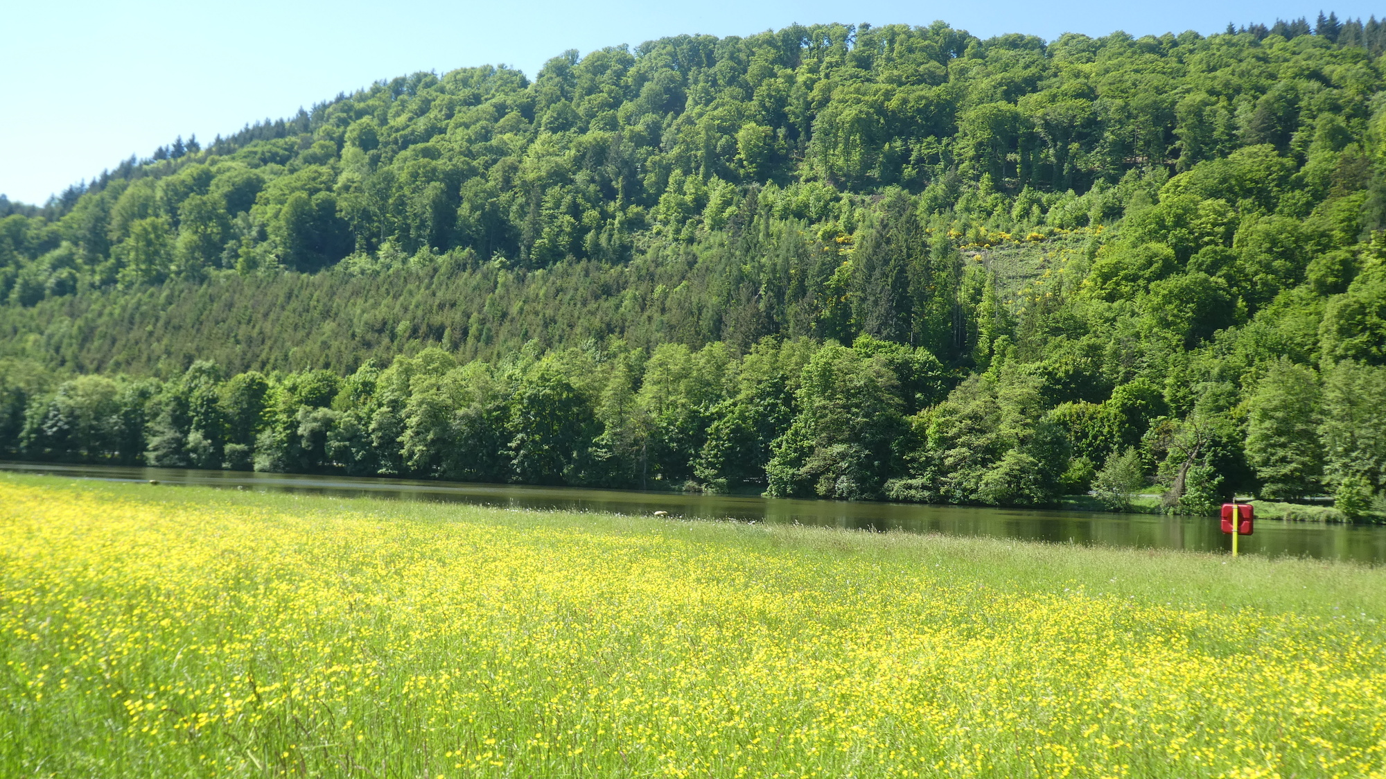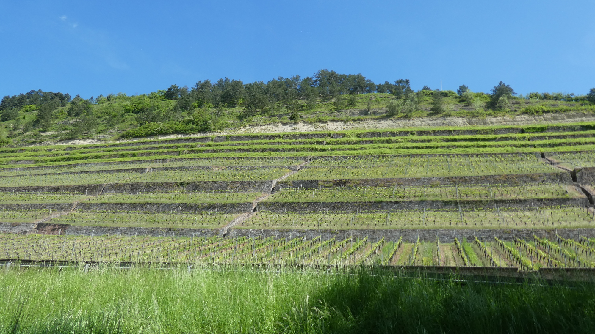 The river was beginning to be hemmed in by quite steep hills, that further on would be covered with grape vines. Here, I noticed that patch of evergreens shown below, among the deciduous trees, suggesting that the whole thing has been planted and managed over time.