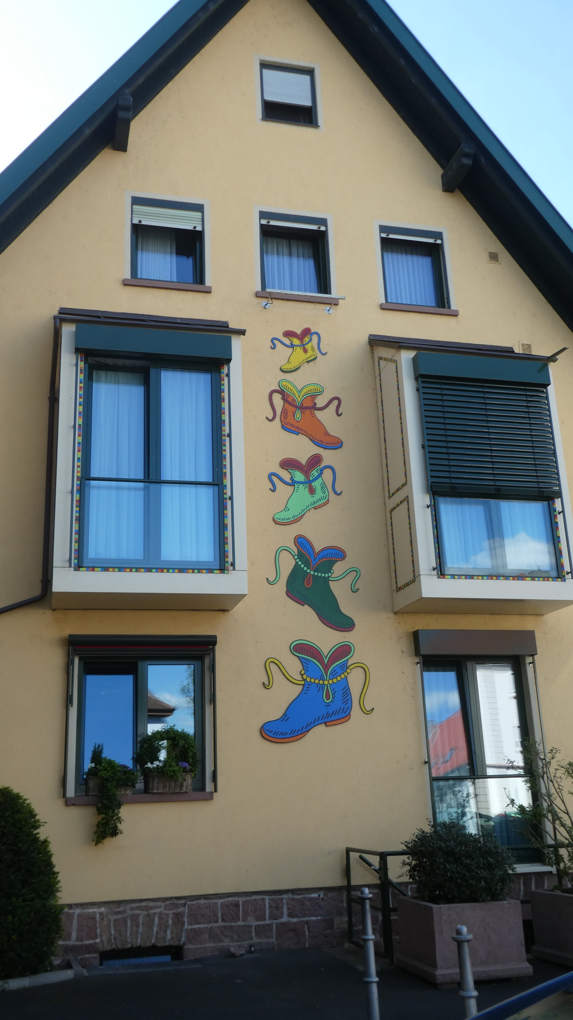 Our hotel is just a little ways from the altstadt, and it's called the Bundschuh. The name confuses me a bit. I already know that "bunt" means colorful, but "bund"? Anyway, it clearly is all about colorful shoes.