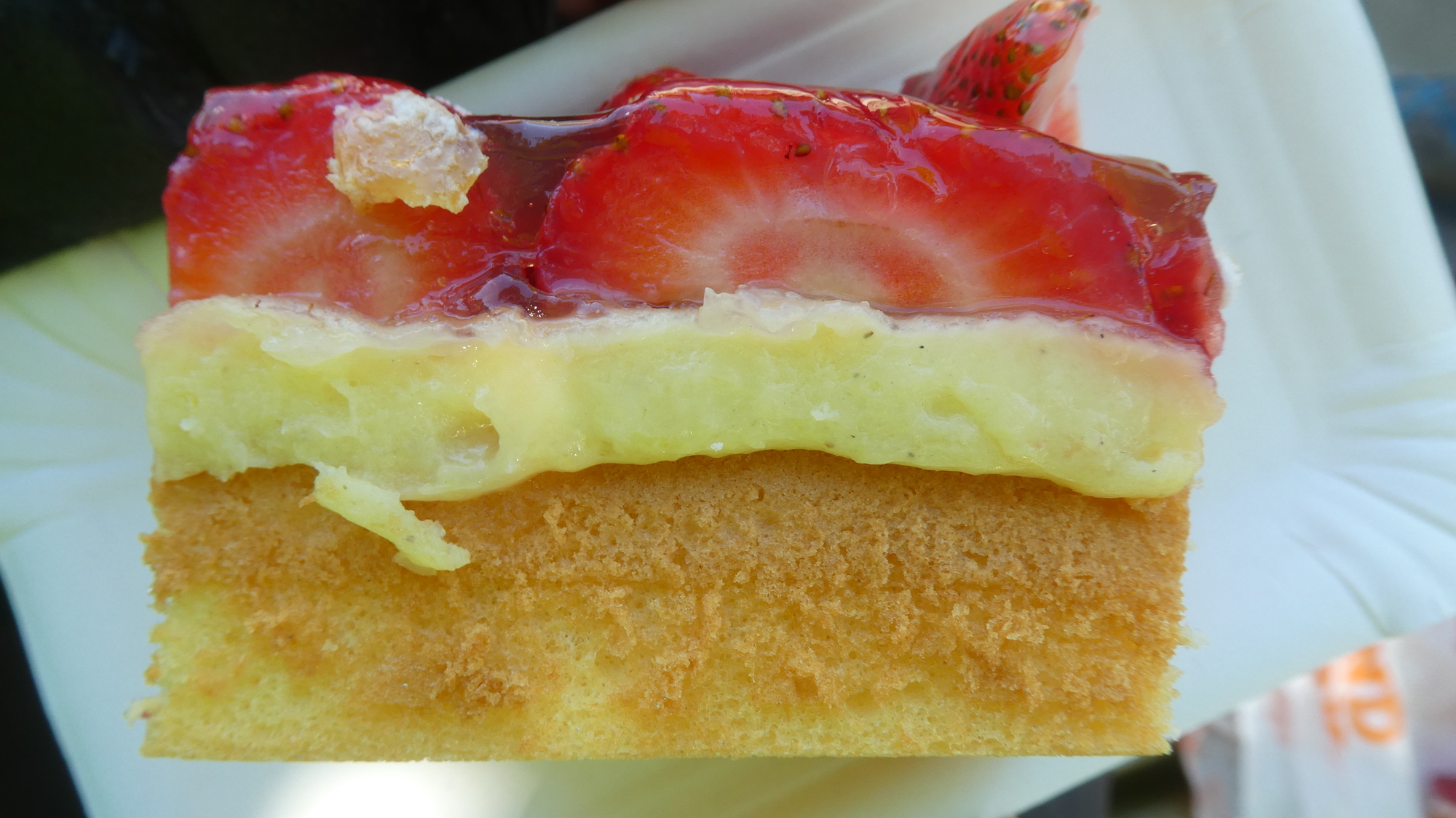 Dodie went in and came out with a research sample. We found some key differences, compared to yesterday's effort. First off, the strawberries were fresher. The custard was revealed as yellowish custard, while in yesterday's I was unsure if the whitish stuff was icing or whipped topping or ? One difference deemed irrelevant by Dodie was that today the gelatin topping was clear, while yesterday's was red. I prefer red, but they taste the same. And finally, neither had a crust under the cake part. And overall, today's version was less sweet, deemed a plus by Dodie.