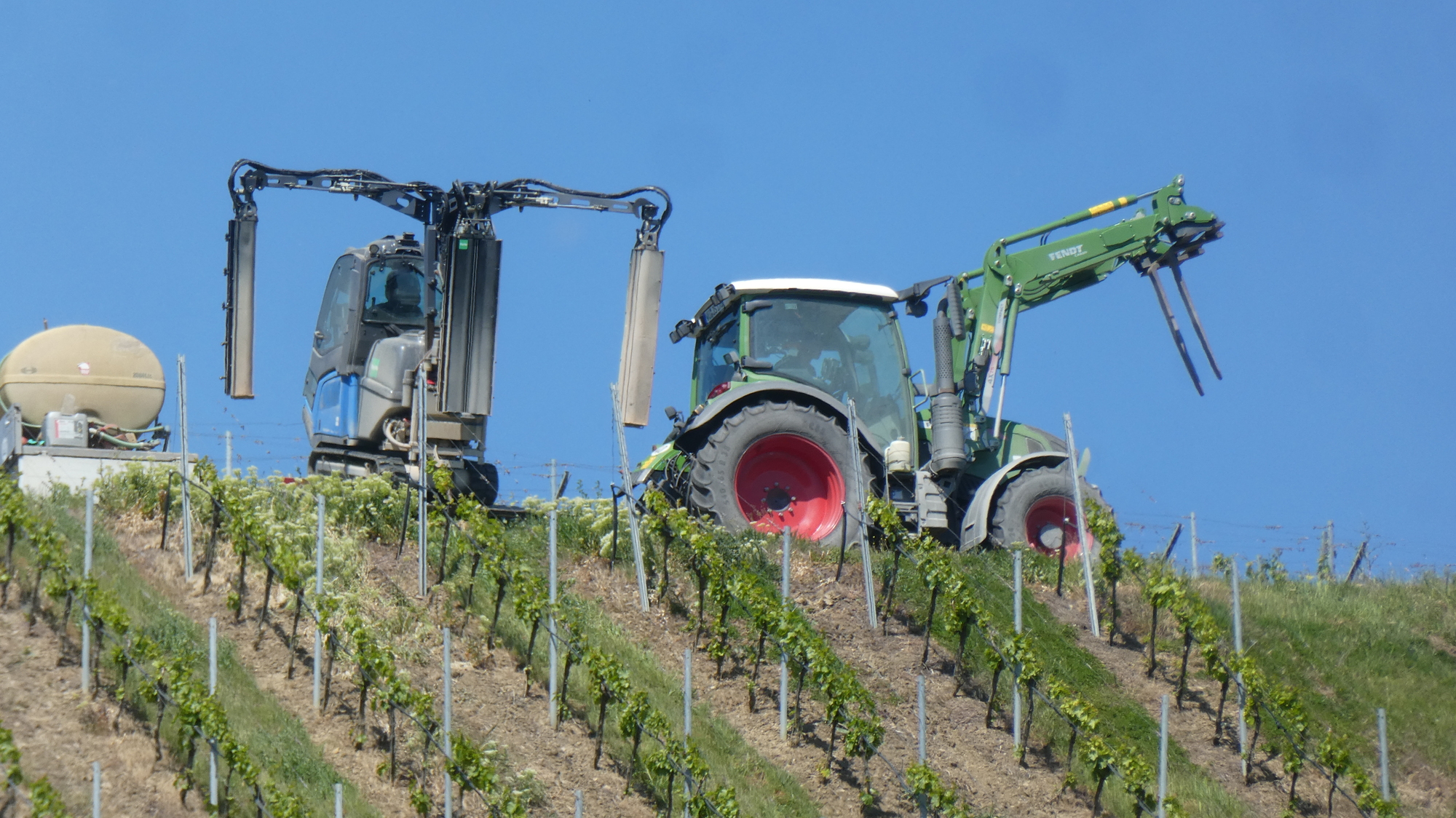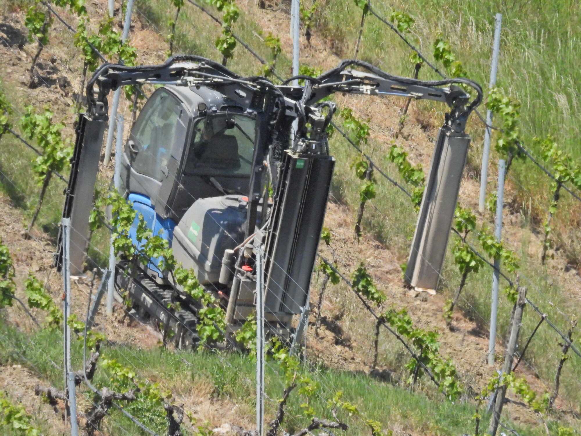 At one point, we observed high on the ridge, some kind of device descending between the vine rows, climbing back up, and moving over to descend again. A tractor was with it at the top, and we felt it must be descending on a cable. But the photos show the device to be a sprayer, and it moves up and down with tractor treads.
