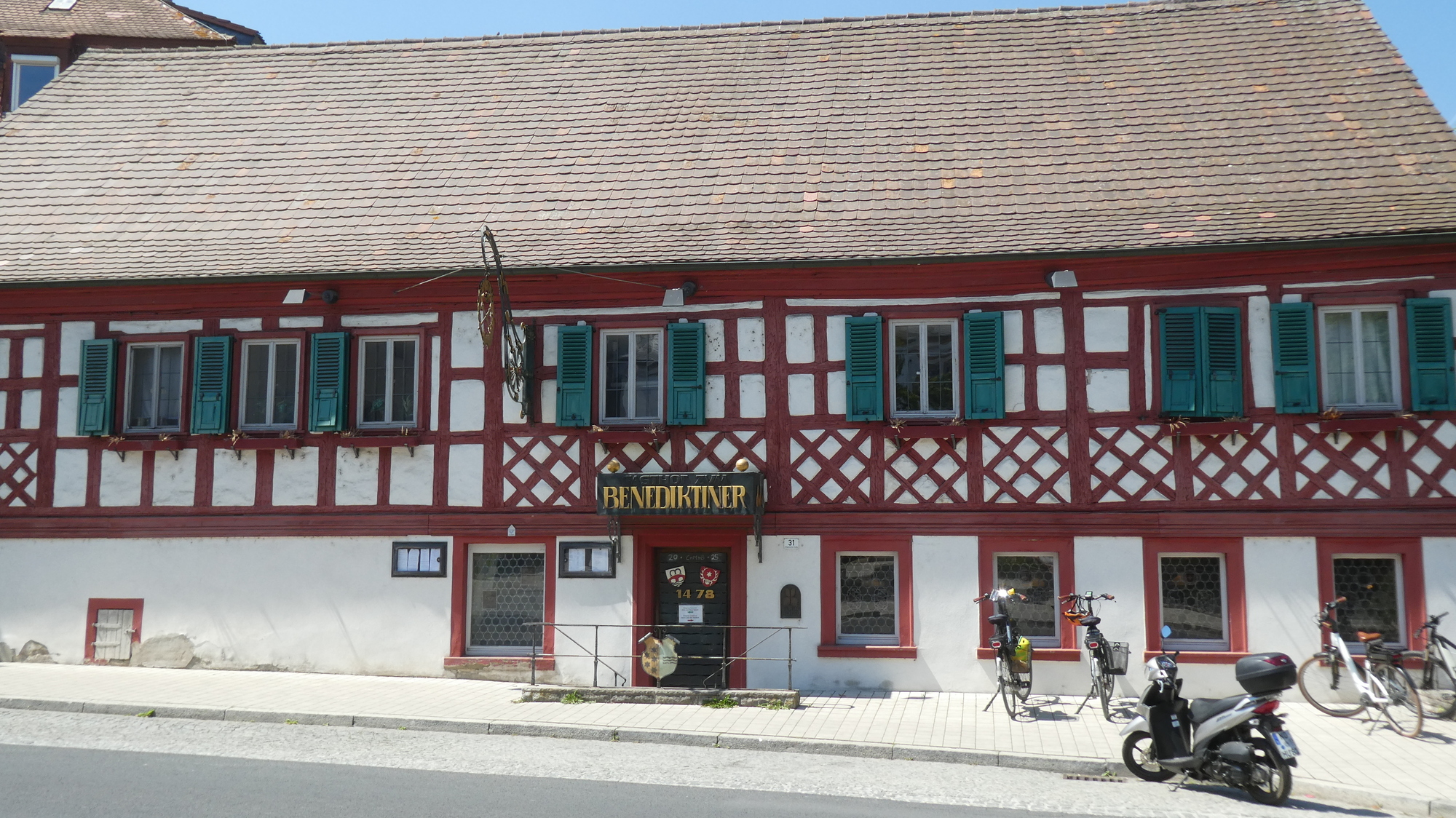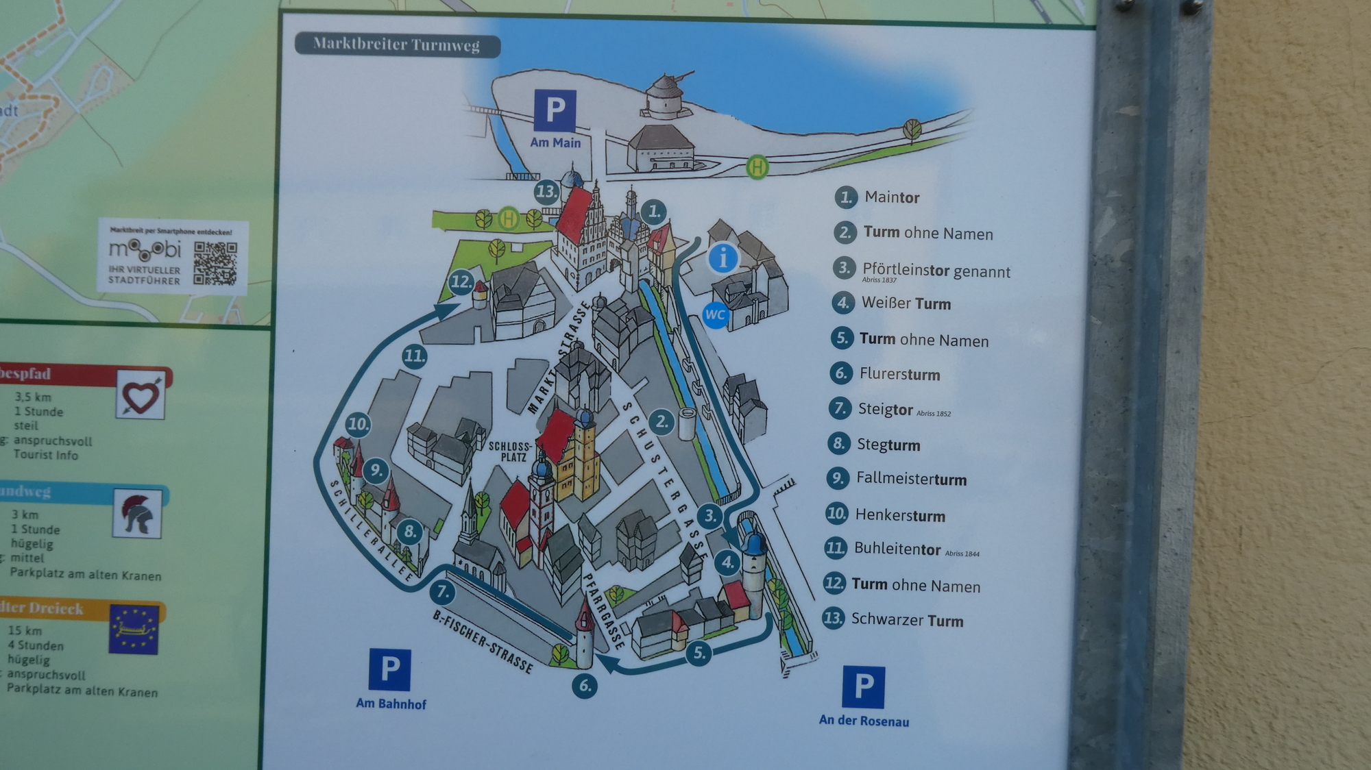 We decided to take a spin through Ochsenfurt old town. Actually, we also had to do it to get onto the bike way that would take us north. We had the pamphlet listing the sights, but the first thing we encountered was the Scheckenbach bakery. The bakery seemed to agree that erdbeeren schnitten are the name of the game, because they had a big poster on them outside.