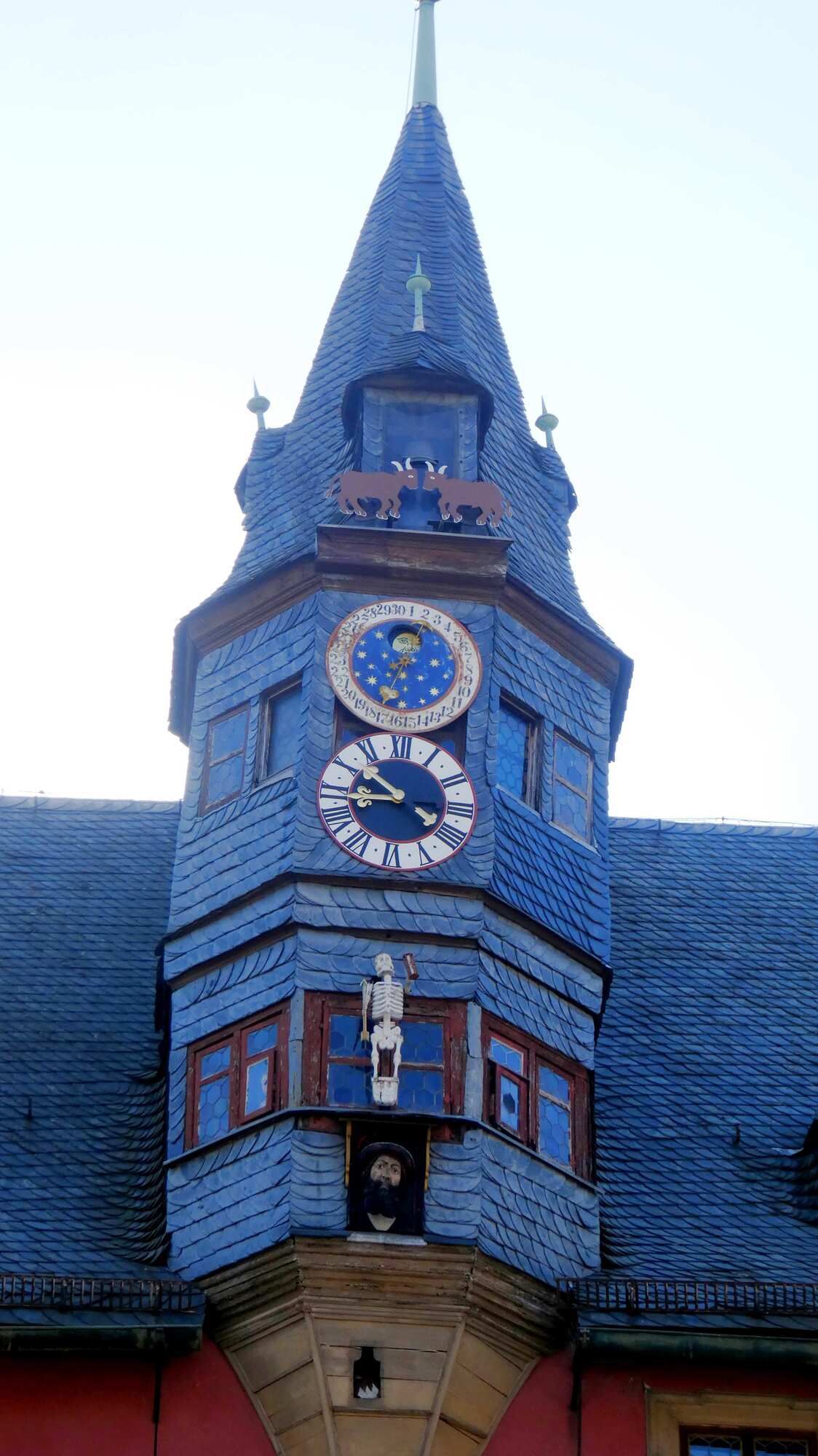 The turret above the town hall has the oxen that are part of the town crest. There is also an astronomical clock. When the main clock chimes, windows open and some figures peek out.