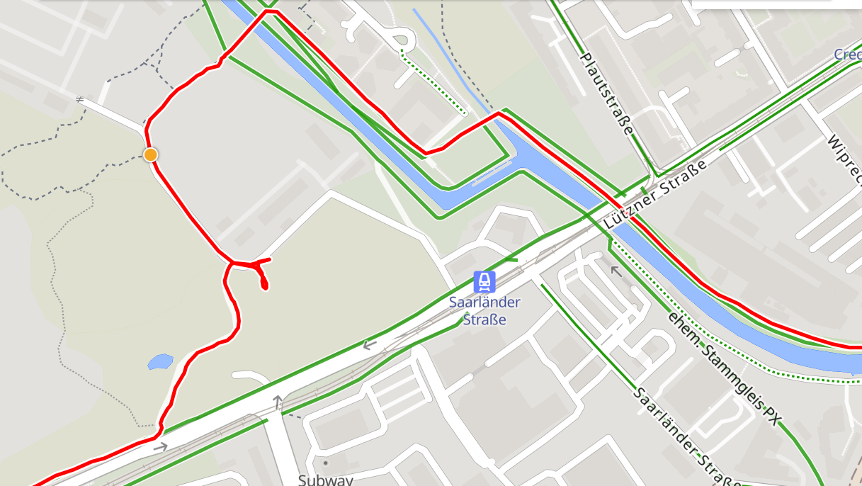 Getting from Leipzig to Markranstadt is not all that complicated, because how much complication can you put into 15 km? But still, there is a river, a canal, a small forest or jungle, and a lake somewhat involved. Google looked at this and decided we would enjoy the canal, and the forest, at least. So if you look at the bit of track below, you see us coming from the right. Instead of turning us left on Lutzner Strasse, over the bridge and onto the green bike path beside the big, straight road, we went for a jaunt beside the canal, then left, to beside the forest, and right on an uphill dirt bit, in the forest, before being allowed back on the straight and obvious route. Thanks Google, we needed some fun (or aggravation) on our final ride!