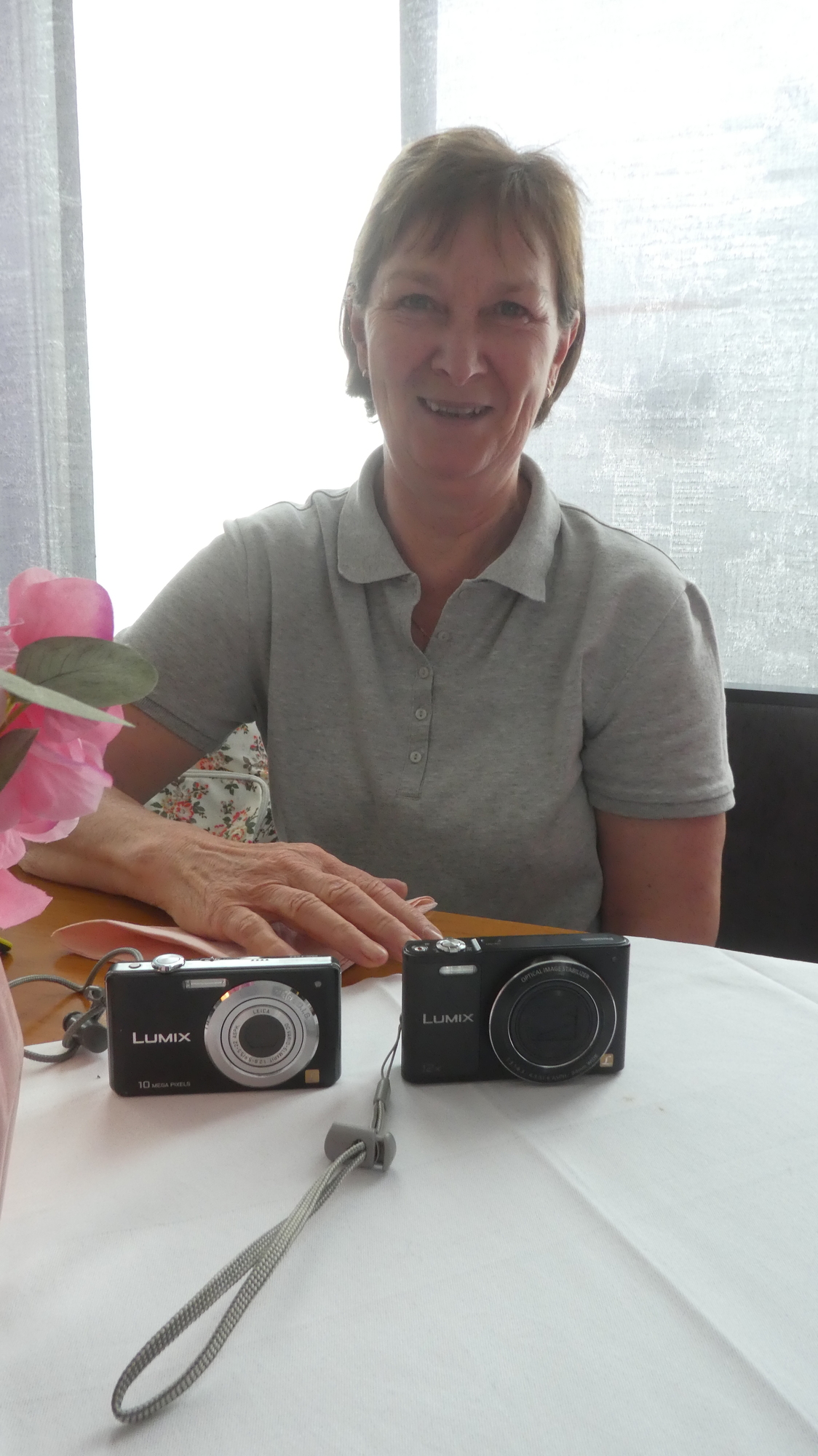 Part of the discussion was about cameras, and the relative unreliability of the Lumix zoom models. Karla and Jo had seen the photo in the blog of the Lumix lineup of semi dead cameras. She posed for her own Lumix shot here, though I think both are currently working.
