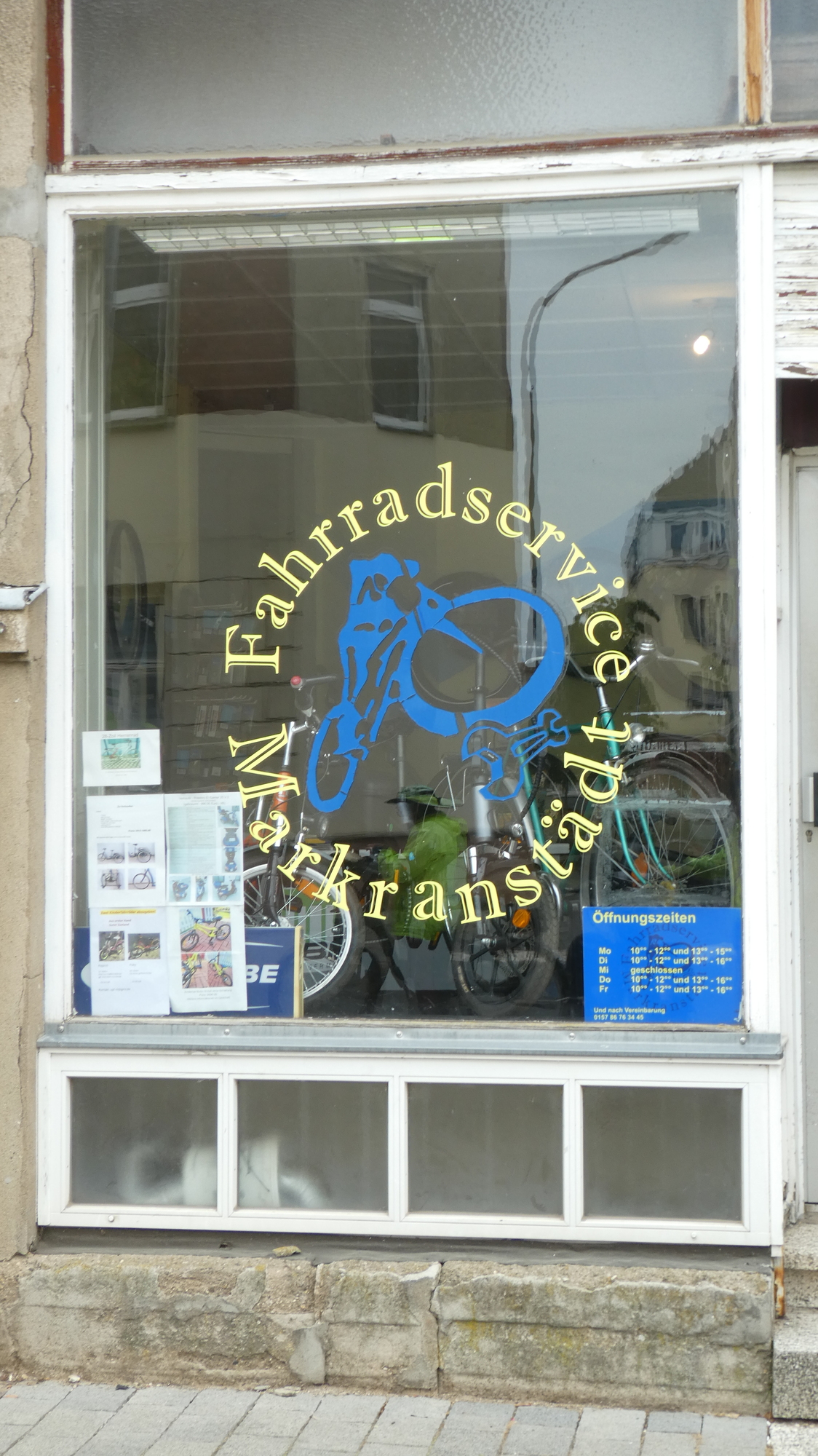 There are two bike shops in Markranstadt. We had left a pile of money with one, once before, for general maintenance, and never saw evidence that they had done anything in particular. So this time we were trying out the second one. But it wasn't general maintenance we were after. Despite all the air purging, new levers, and pads that had gone into our brakes since Spain, we still had a spongy, almost non-functional situation. We decided that the only remedy was a complete replacement of the whole braking setup. Our Markranstadt friend Juergen had prepared the ground with the lady, Doreen, that runs the shop, and she was expecting us when we rolled in.