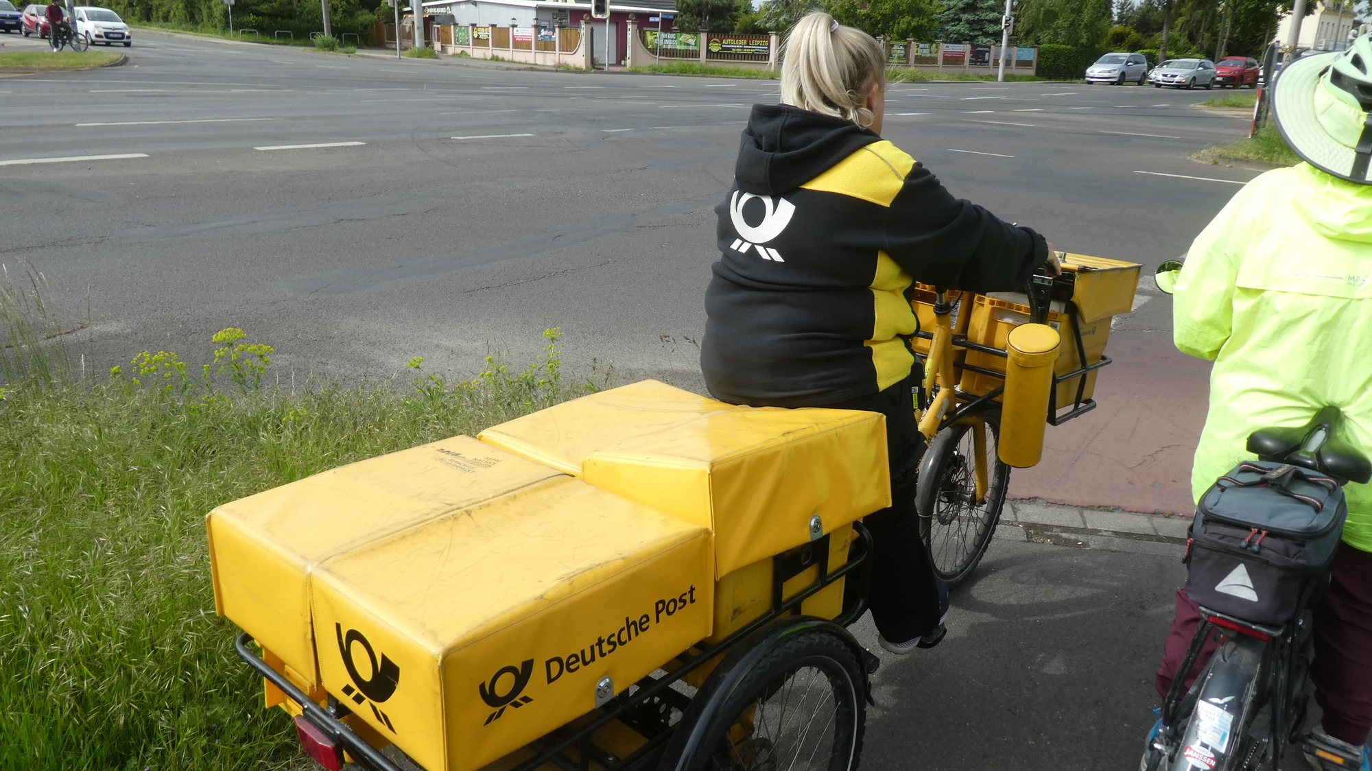 Back on track, we encountered a different kind of loaded cyclist, a Deutsche Post delivery rider. This has got to be more energy efficient than a van, and it is easier to get on and off.