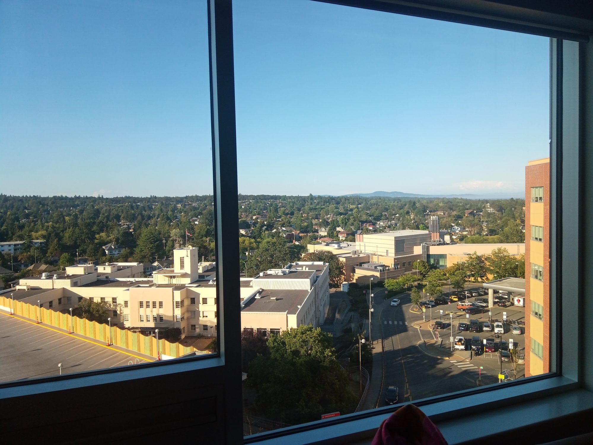 Now, sitting on a visitor bed in Victoria's Jubilee Hospital, I can look out the picture window at green Mount Douglas, or down to the parkade, where our eGolf is enjoying the sun atop the spacious and not too expensive per day structure. And yes, there is a coffee shop, called the Good Earth, though admittedly it is not an eis cafe, and there is an oriental style meditation garden, with waterfall. Seeing that Dodie appears to be living here, they have begun to bring her food, in what they call "companion trays". This service, and all the other expert staff, diagnostics, drugs, supplies, and space are at no apparent charge. It makes me proud of my country, and glad to pay, through taxes, for others when they may need help as well.