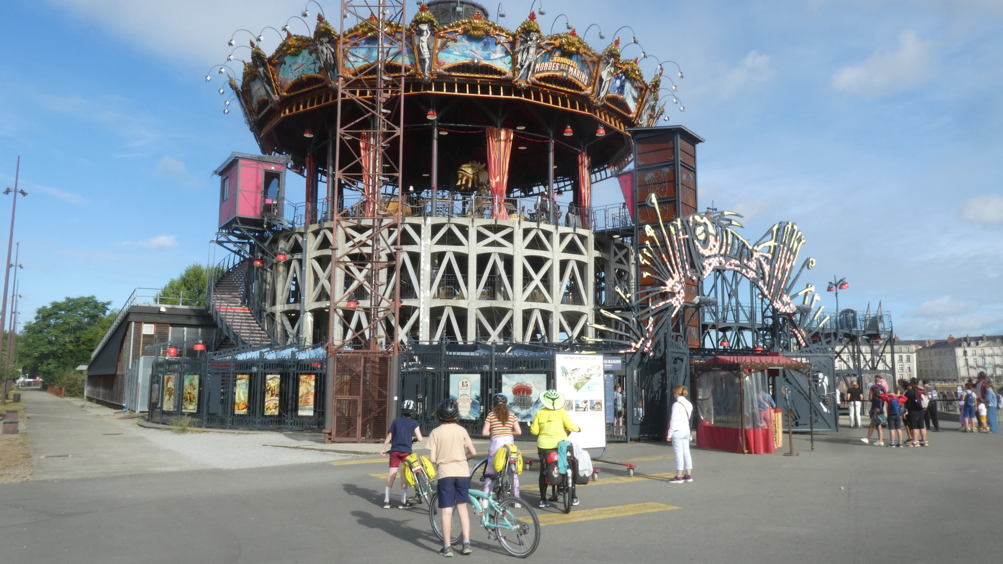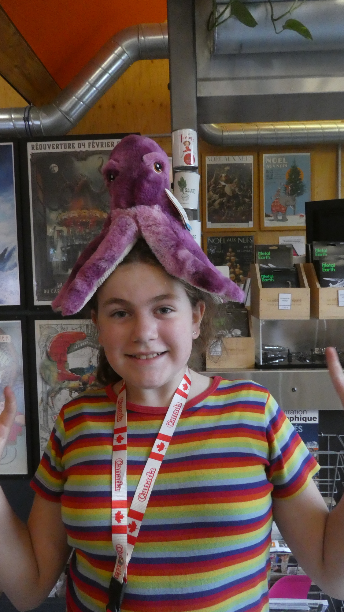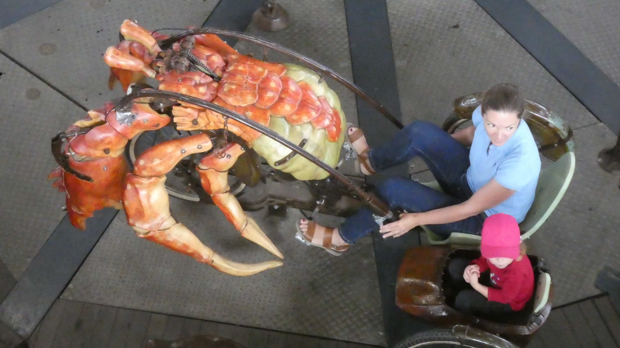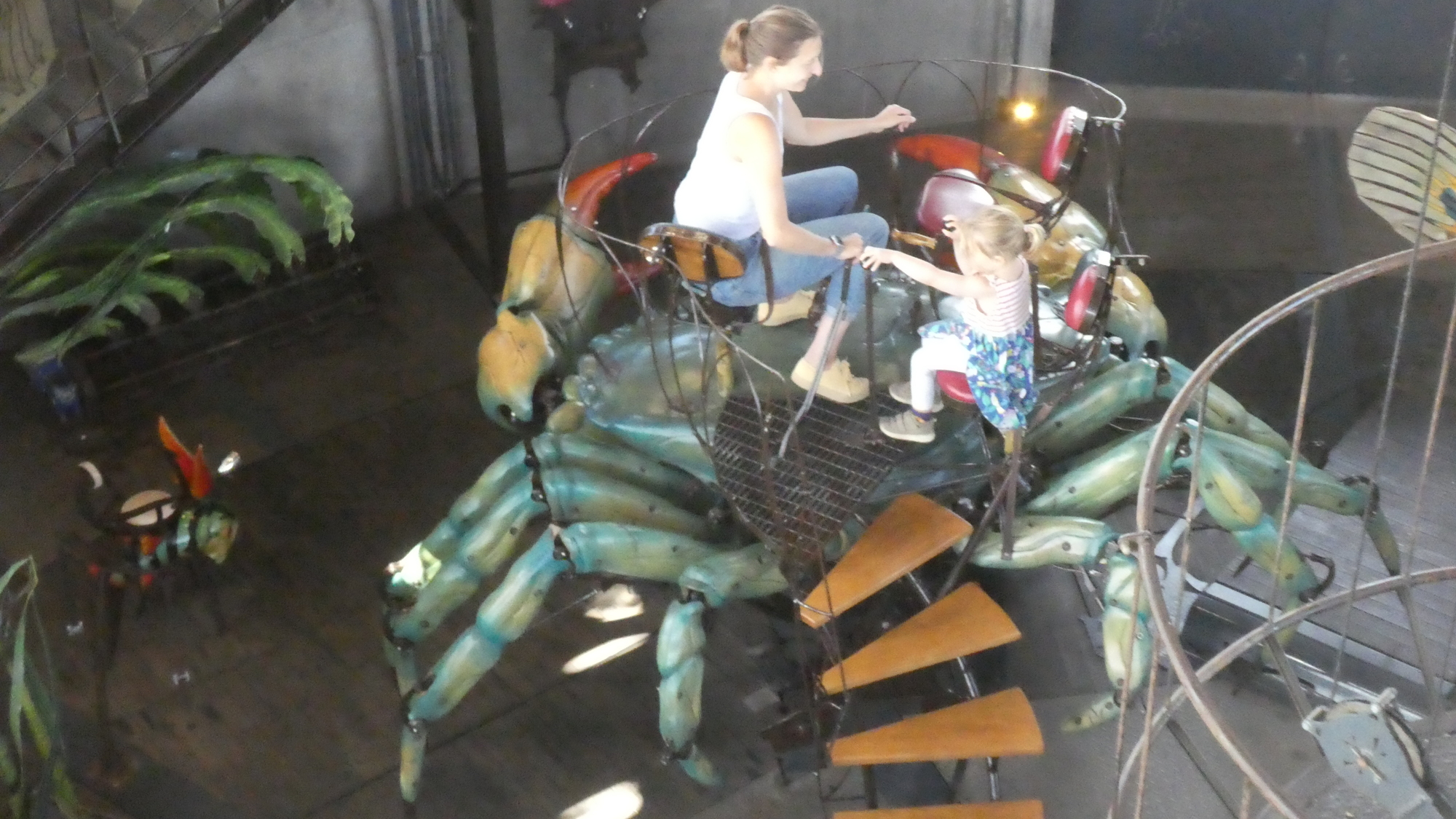 Our visit to the Machines packed the additional thrill of meeting up again with our cycling friend Michel. But this time, since we were bringing a son and three grandchildren, Michel joined in by bringing his wife Jeannette, plus two daughters and three grandchildren. To boot, other cycling friends, Jean Claude and his wife, and Pierrette (who took a one hour train ride to get here), all joined in! While we waited for them all to arrive, we had a quick peek in the gift shop. Thge kids quickly spotted this octopus, which has the feature of easily sitting on you. A similar sculpture sits atop the carousel.