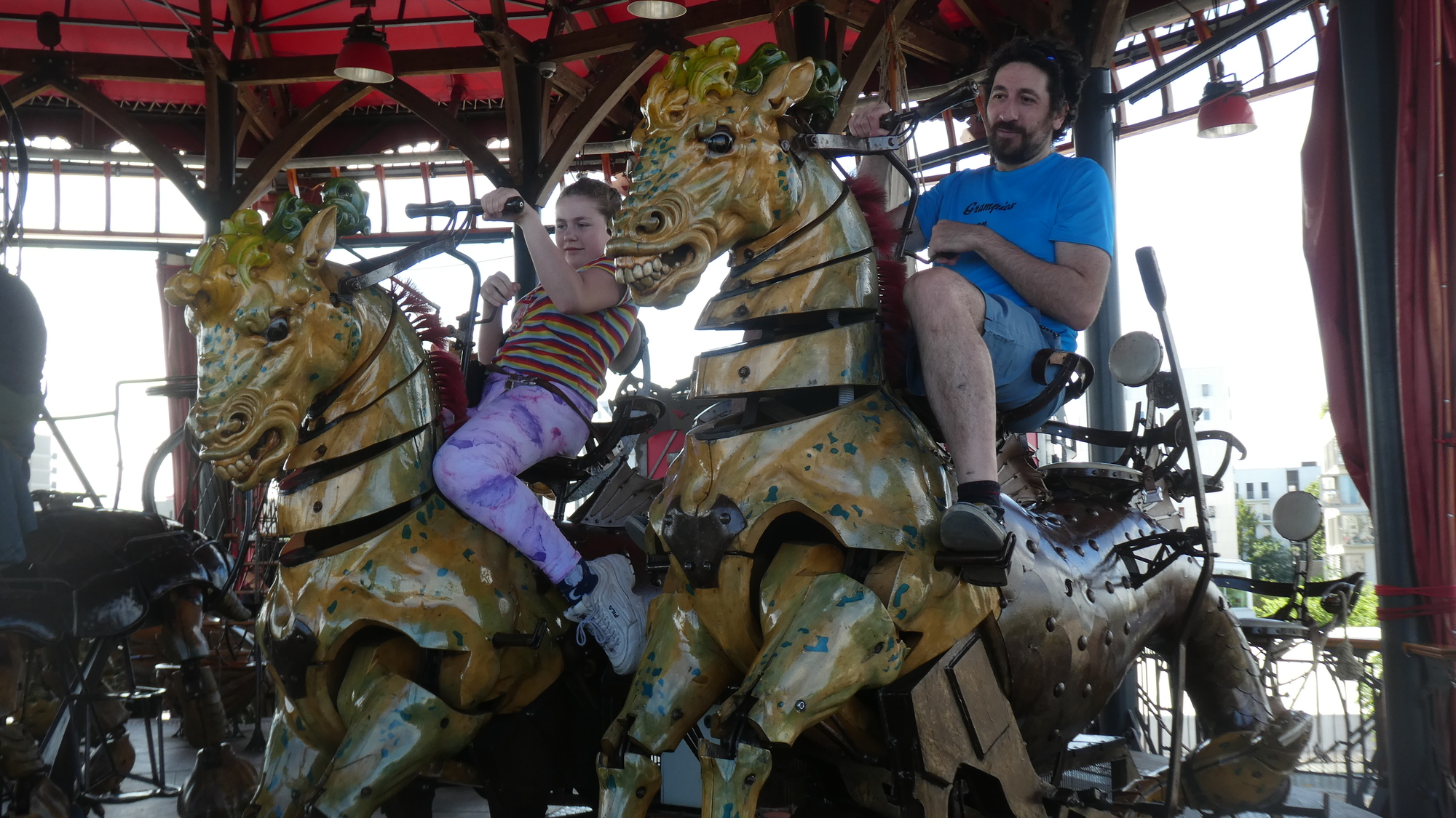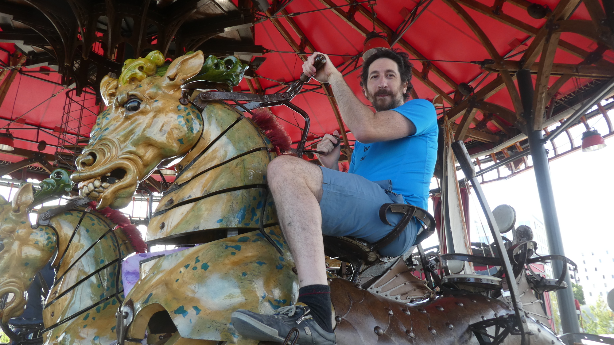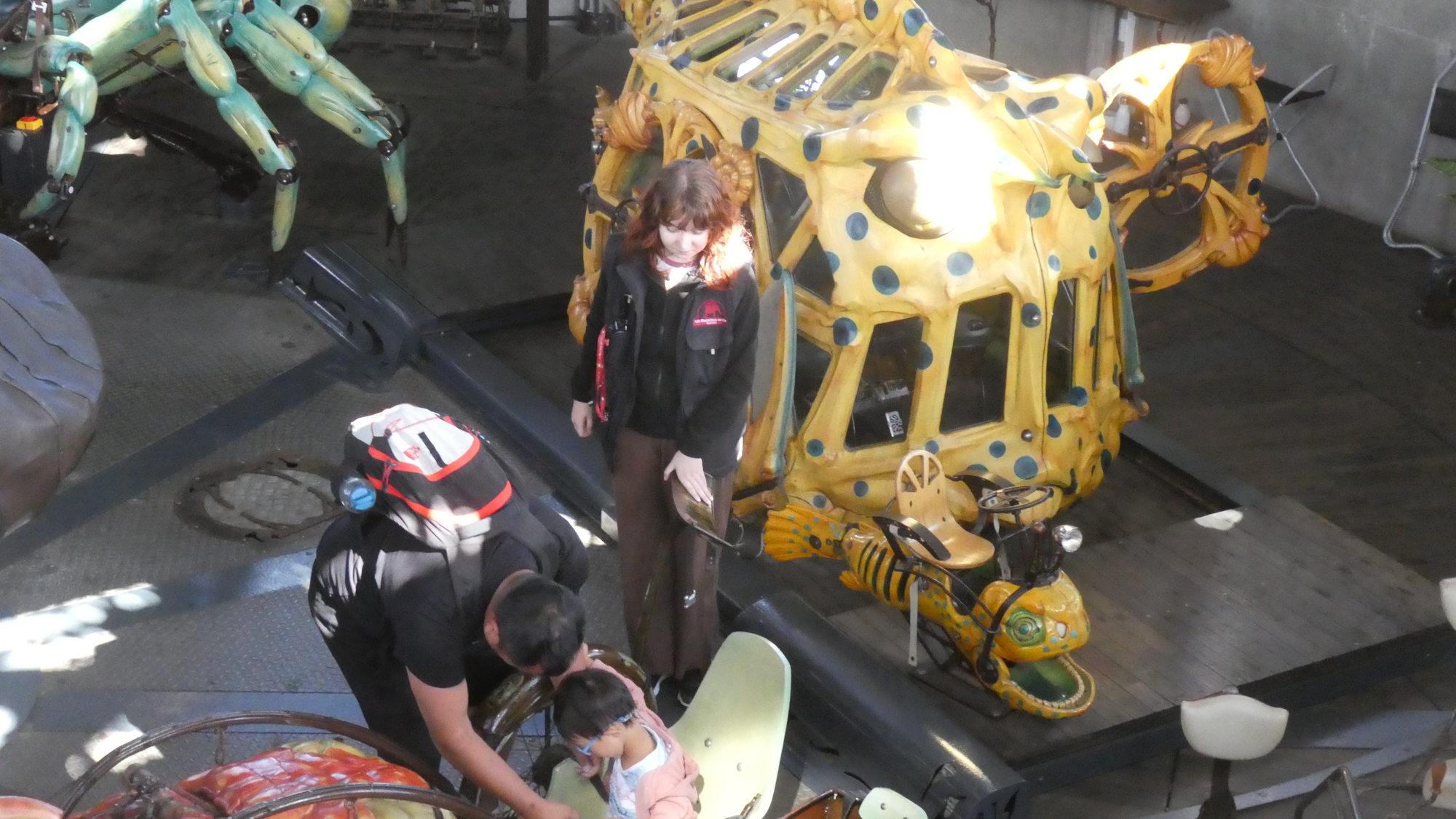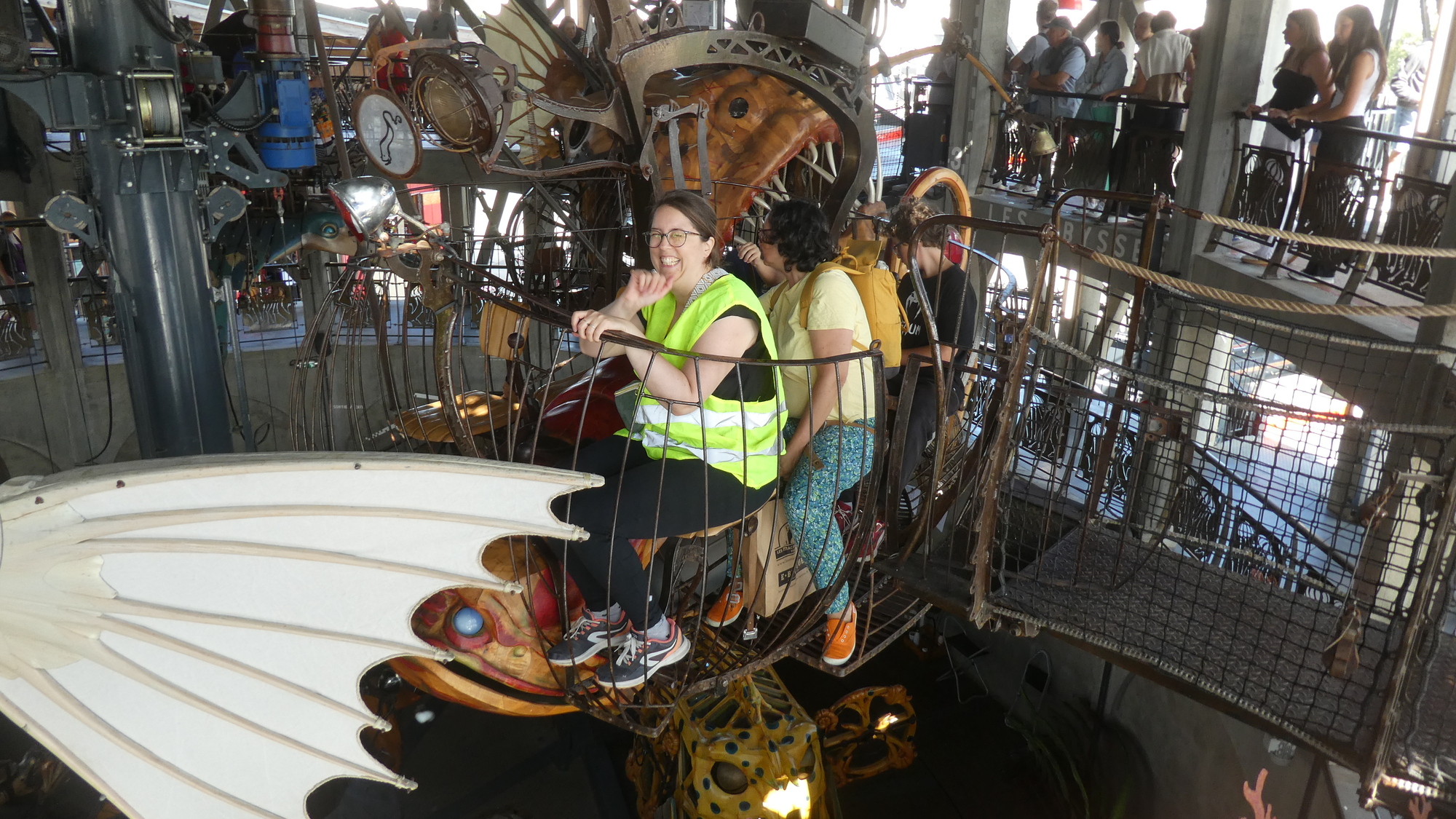 Our visit to the Machines packed the additional thrill of meeting up again with our cycling friend Michel. But this time, since we were bringing a son and three grandchildren, Michel joined in by bringing his wife Jeannette, plus two daughters and three grandchildren. To boot, other cycling friends, Jean Claude and his wife, and Pierrette (who took a one hour train ride to get here), all joined in! While we waited for them all to arrive, we had a quick peek in the gift shop. Thge kids quickly spotted this octopus, which has the feature of easily sitting on you. A similar sculpture sits atop the carousel.