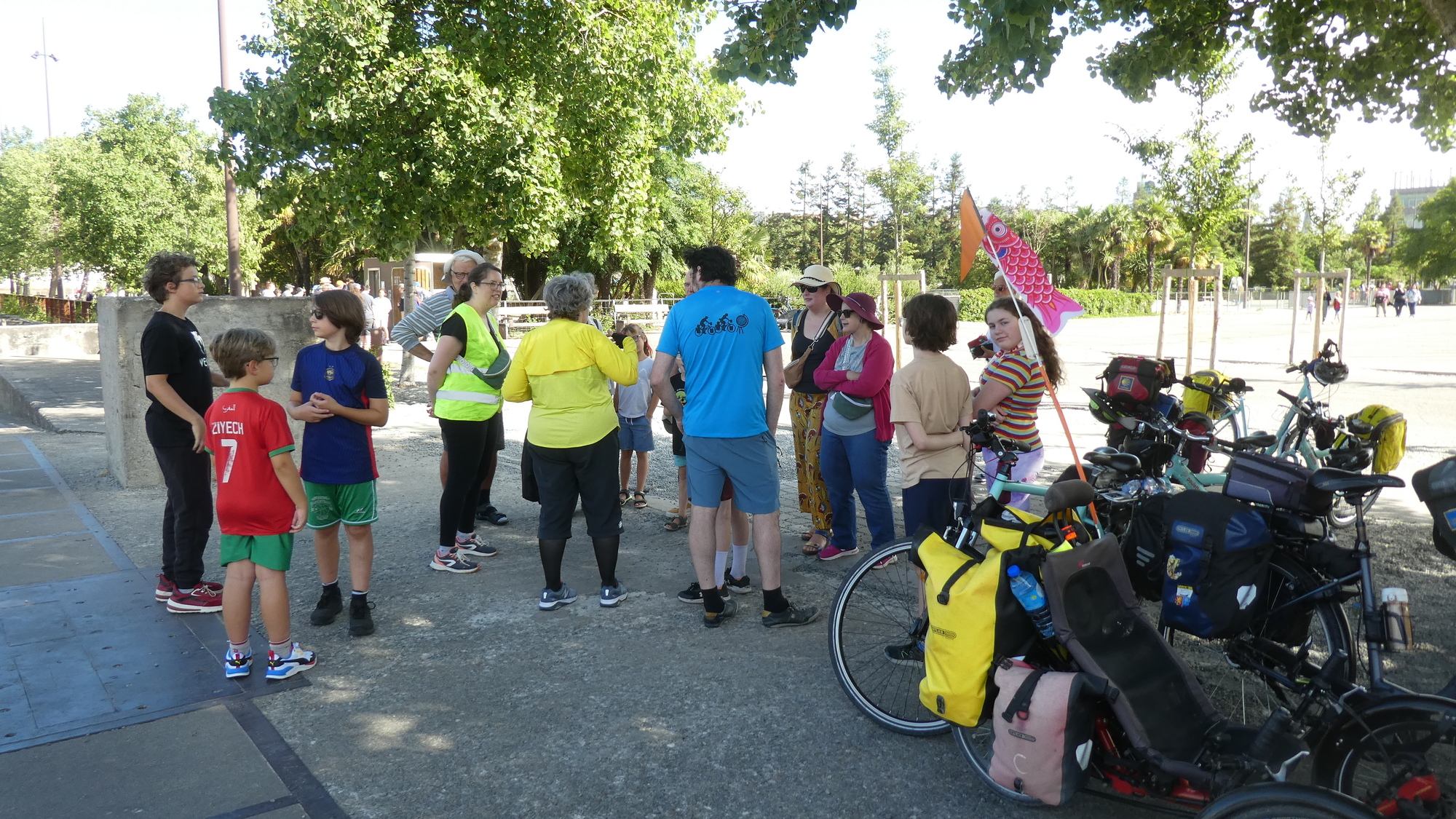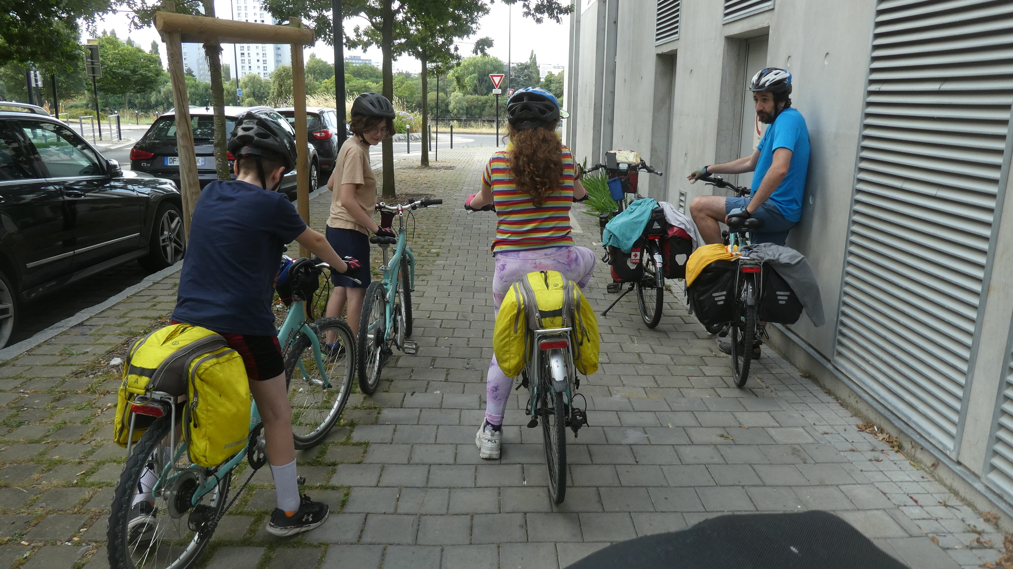 - Elias with a blue shirt is listening to Yanis, her mom is Delphine